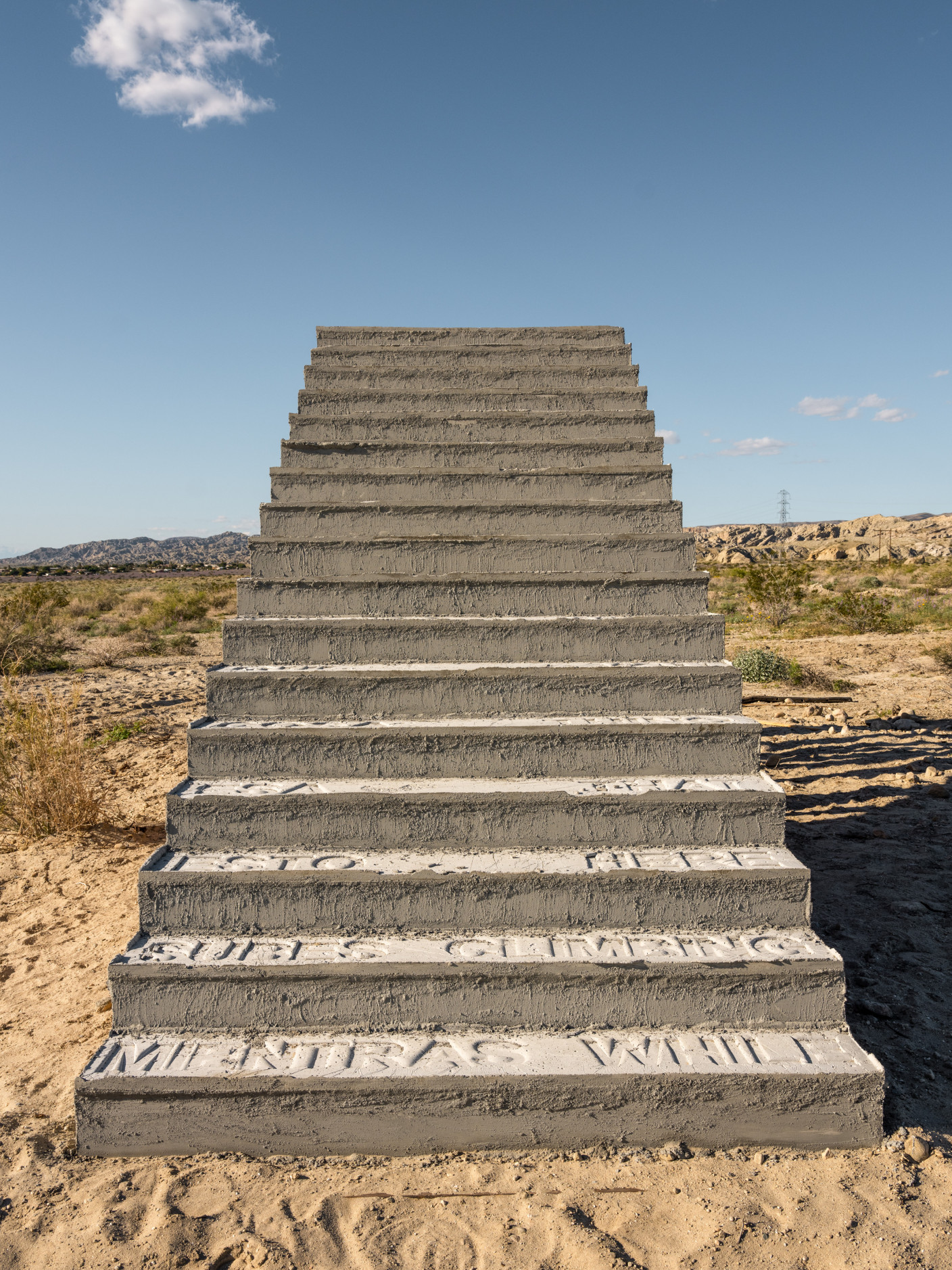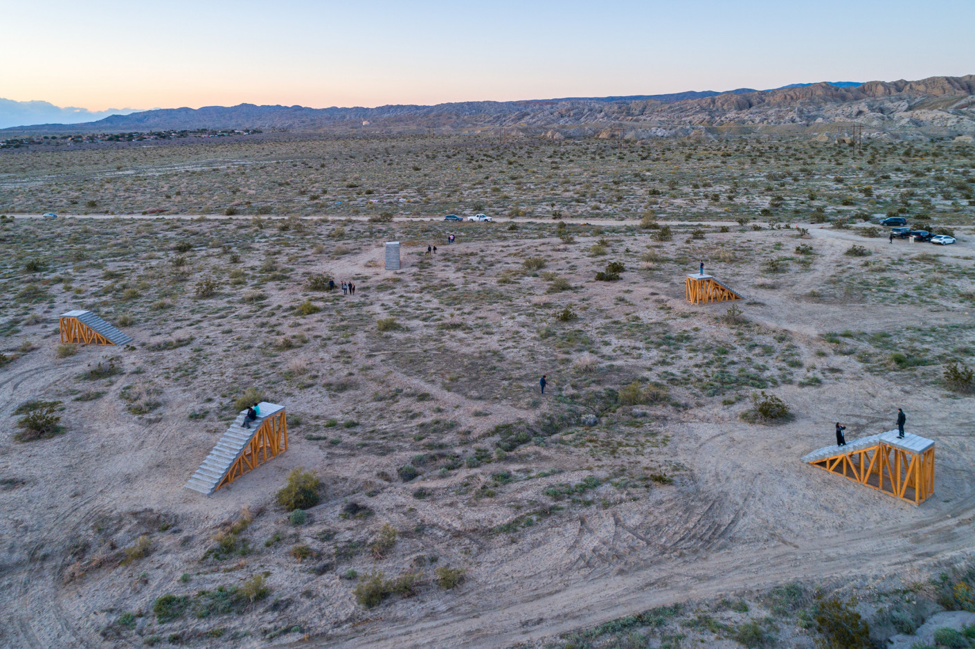 A Point of View is an interactive sculpture created by Bogotá-born/Paris-based artist Iván Argote. It is installed at an elevation above the Salton Sea, the manmade body of water which has been California’s largest lake for the past century. The arrayed concrete scales sited near the sea’s North Shore project the viewer into the landscape. Messages set in concrete appear in Spanish and English upon each step. From the platforms the audience may communicate with each other or turn to the landscape. The greater Coachella Valley lit in its changing hourly aspects reveals a civilization scattered across the bed of an ancient ocean. A Point of View registers diurnal, geologic, and mechanized time in this section of the ever-progressing San Andreas Fault. It also addresses the long arch of memory contained in Argote’s blend of pre-Colombian and brutalist architectures. The assembled sculptures function as sundials representing time in fragmentation. Like the engraved words upon the stairways, the singular and the collective coalesce across the menhir-like structures, aimed in different directions. These temporal and verbal fragments stand before the Salton Sink as it exists in its twenty-first century incarnation protruding amidst the surrounding agricultural land and industrial water. Stretching for dozens of miles, the temporary sculptures sit in a basin where the ancient Lake Cahuilla once engulfed a Paleolithic horizon before its final recession into the desert floor in the 1600s. Seashells and imprints of marine life centuries-old can still be detected in the immediate vicinity of A Point of View, bringing Argote’s many reflections upon time and scale full circle.