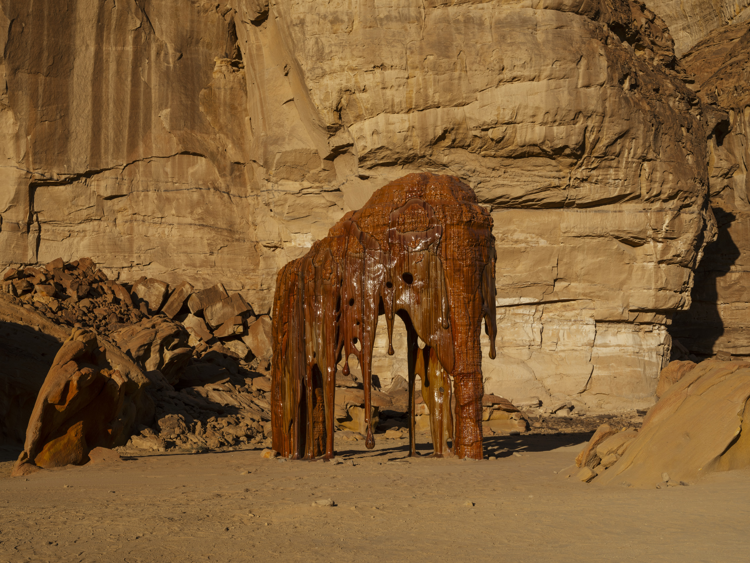Weird Life: An Ode to Desert Varnish is a site-specific sculpture that AlYaqoub derived from the distinct outlines that characterize various rock formations across the landscape, such as Jabal AlFil, Gharameel, and the Dancing Rock. The work encapsulates an ancient fleeting instance unseen by human observation – a cascade of desert varnish descending upon a mountain or rock, forever set in limbo. Excising the rock thus amplifies the phenomenon, creating an internal void as a space for contemplation. Guided by material research and development, “the sculpture aspires to replicate the augmented physical attributes of the varnish, as discerned from found scientifically derived imagery.”
