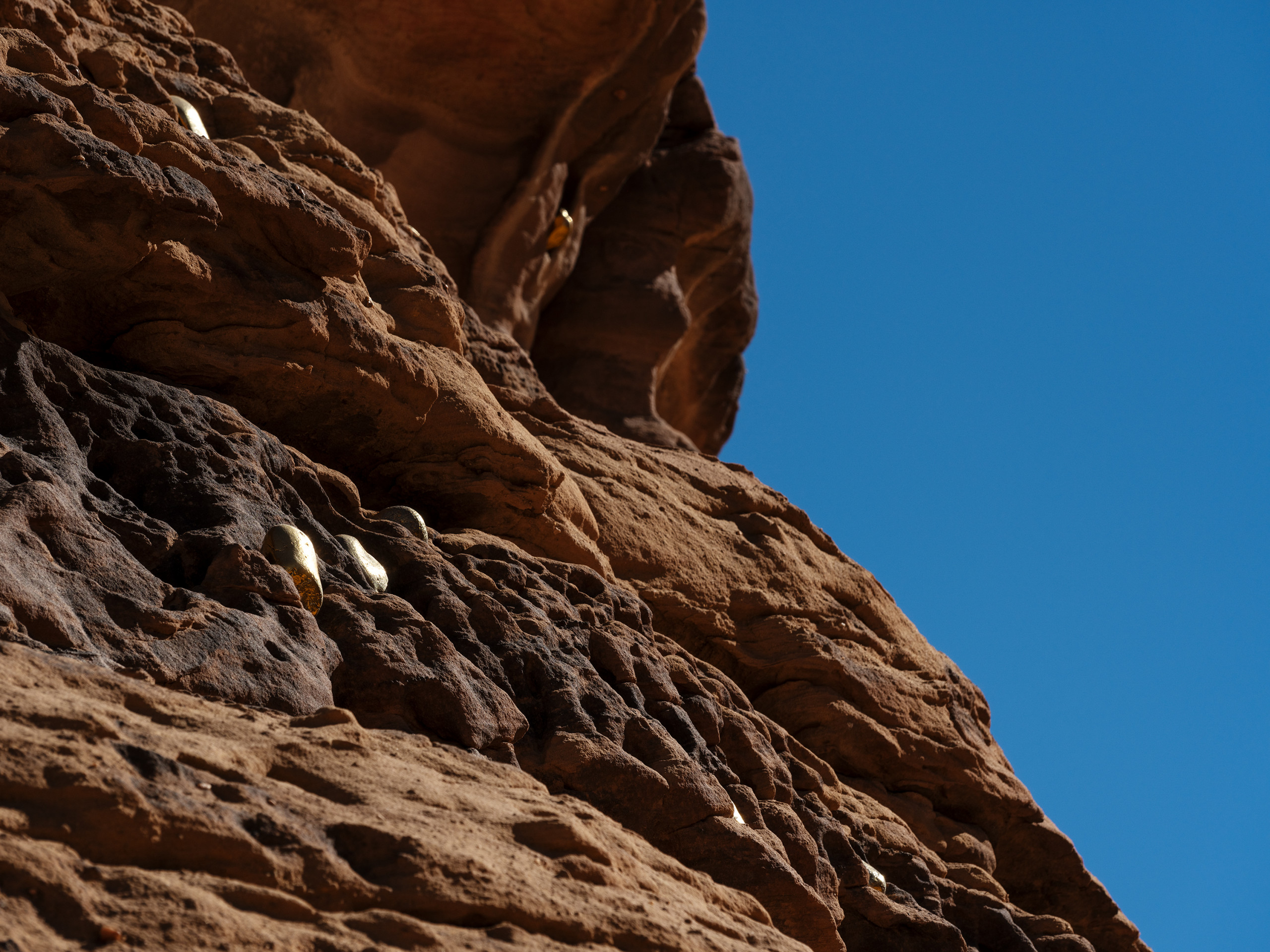 Following Bosco Sodi’s philosophy, When I Saw My Reflection takes advantage of the uniquely beautiful organic formations and accidents that already exist in the rock formations of AlUla: fissures, and divisions that have asserted themselves throughout millions of years. Being respectful to the site, the artist has placed volcanic rocks of various sizes glazed with gold on two opposite rock formations. By working with both rock faces, the artwork lets the light of day enter as a variable in dialogue between them as it is absorbed and reflected by the glaze at shifting angles of sunlight. As Sodi explains, “the morning reveals itself and at the same time it overshadows, the afternoon steals its light, and in the mid-day they share and create a tension of light between them.”