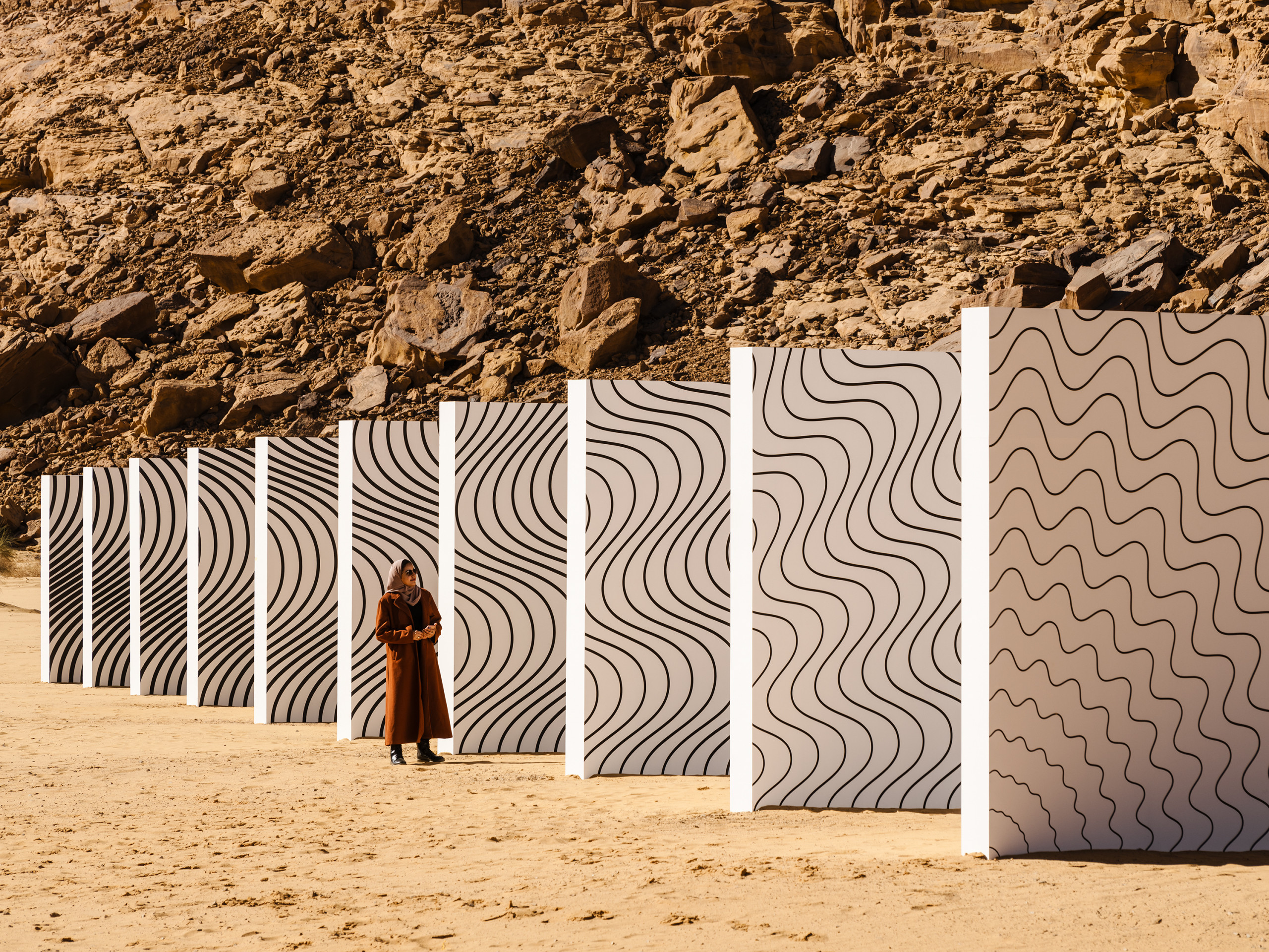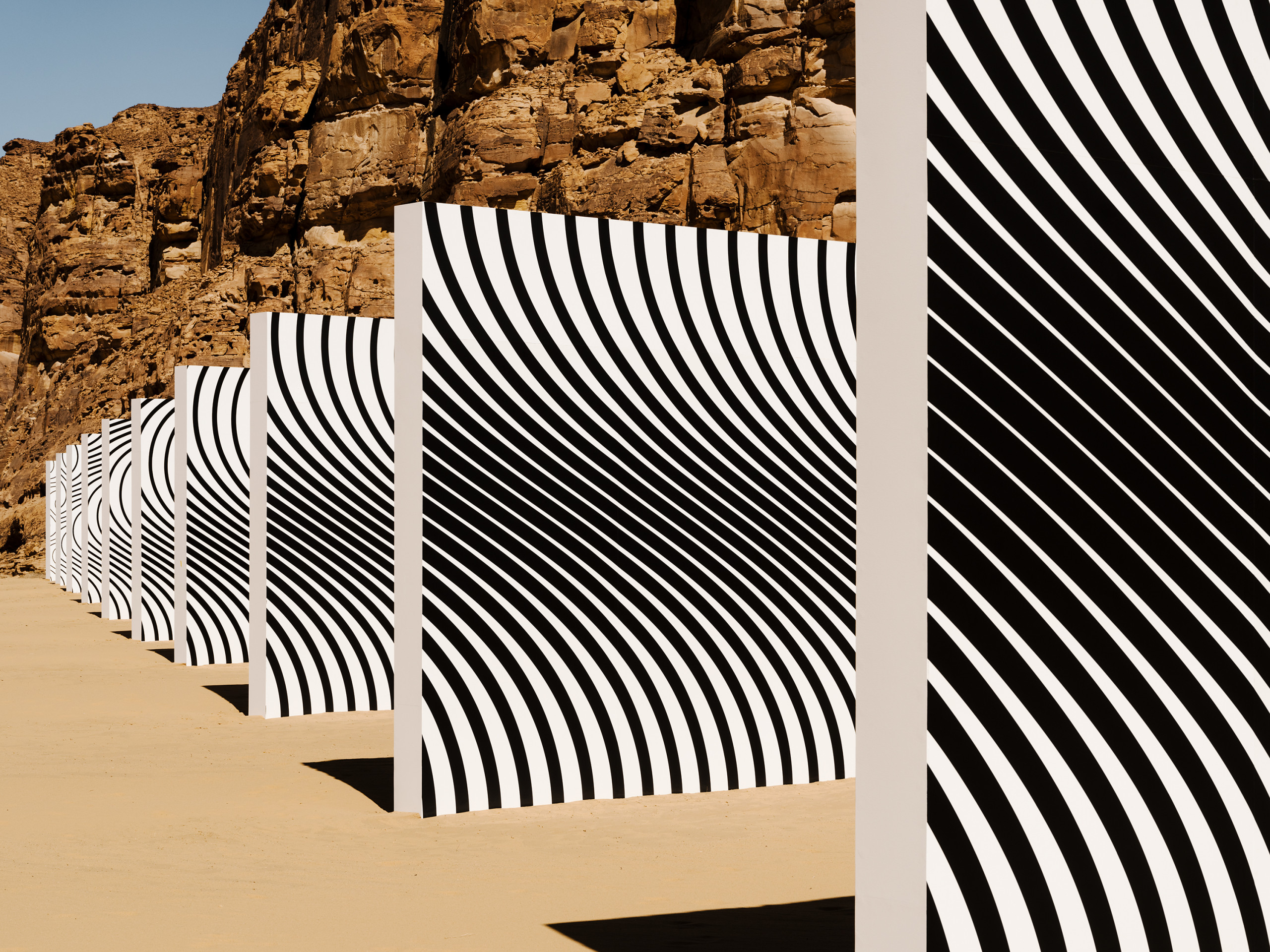 Dark Suns, Bright Waves is a highly complex and mimetic work featuring a black-and-white image of a concentric circle that creates waves, redolent of forms existing in nature: 10 modules of the same size are mounted on an imaginary vanishing line to create a perspective effect on location in AlUla. Each wall features part of a pattern extracted from a diagram the artist refers to as flower or sun. The pattern is the result of research on the geological and natural shapes that recur in this location and is also inspired by the studies of German biologist and philosopher Ernst Haeckel, who coined the term ecology in 1866.