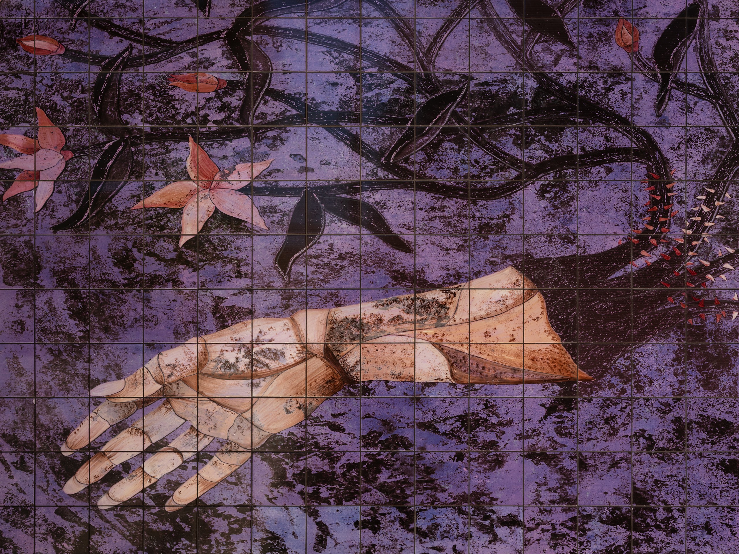 The mural Finding Home in My Own Flesh acknowledges the Coachella Valley as both a border region and a queered space, and honors immigrants and queer people of color who have been an integral part of the region’s story. While these communities have long populated the area, they’re often omitted from its better known histories. Finding Home in My Own Flesh, depicting two hands enveloping a cloud of vines and flowers, speaks to the erasure of marginalized peoples from both official narratives and our collective imaginaries. Gesturing to a person that will soon take full form, Finding Home in My Own Flesh recognizes those who are often unseen and intentionally erased. Finding Home in My Own Flesh functions as a memorial to non-conforming bodies and their movement across spaces— both past and present—that nurture and uplift them.
