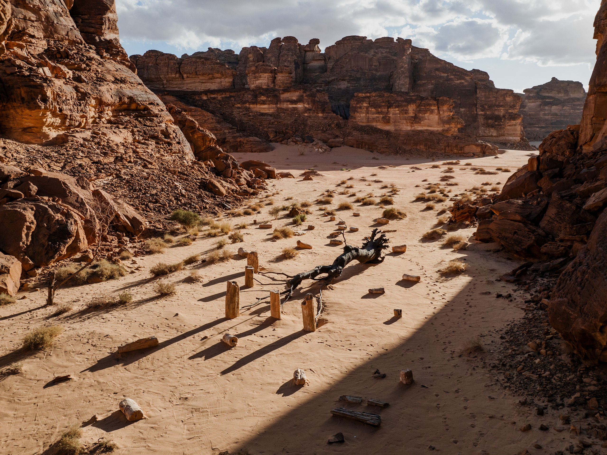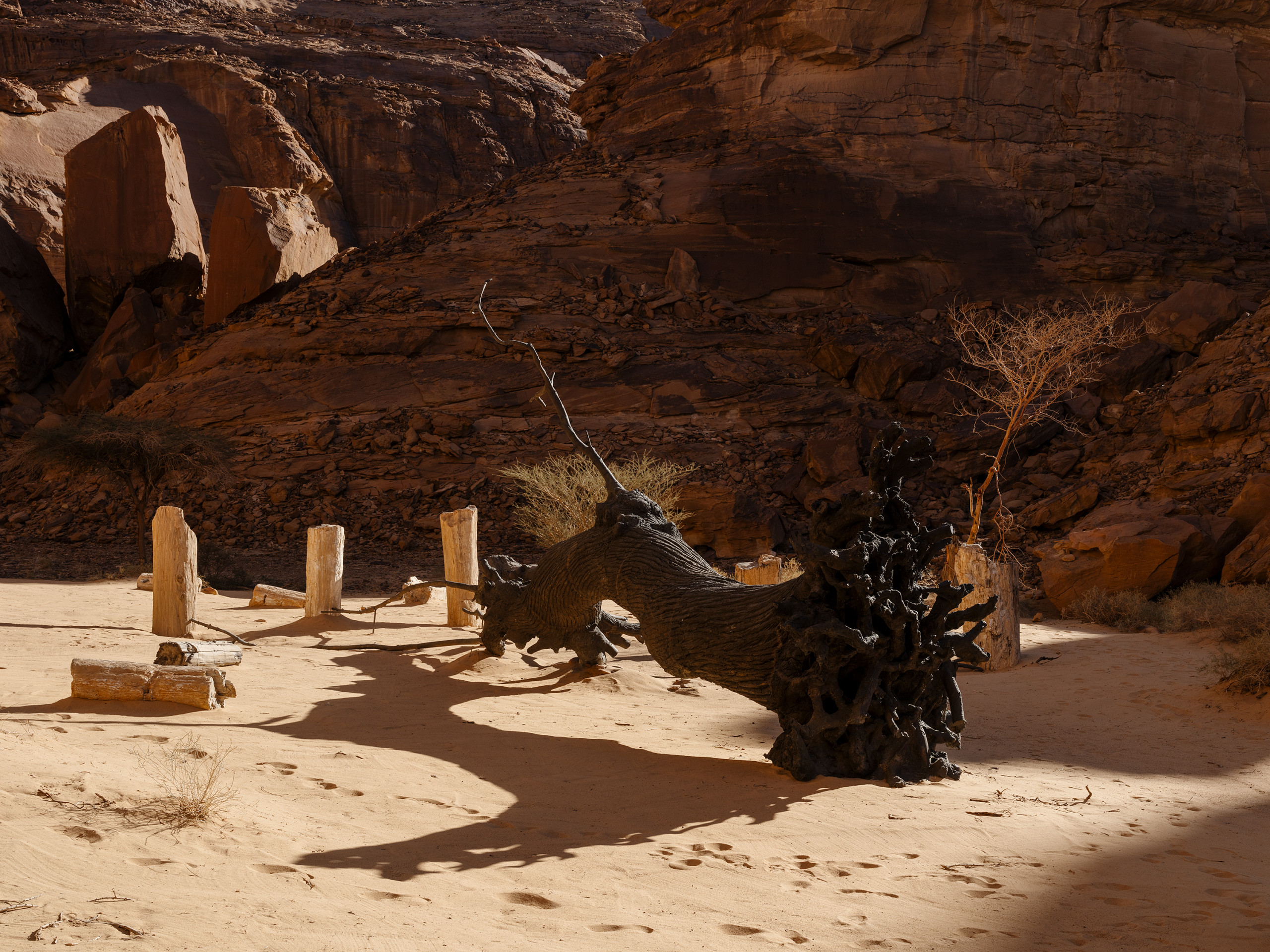In the installation, at the end of each of the five branches of the bronze tree, fossilized tree trunks are standing. A number of other fossilized trunks are scattered around in the space nearby like fallen trees; they recall that 100–150 millions of years ago the desert was a forest.