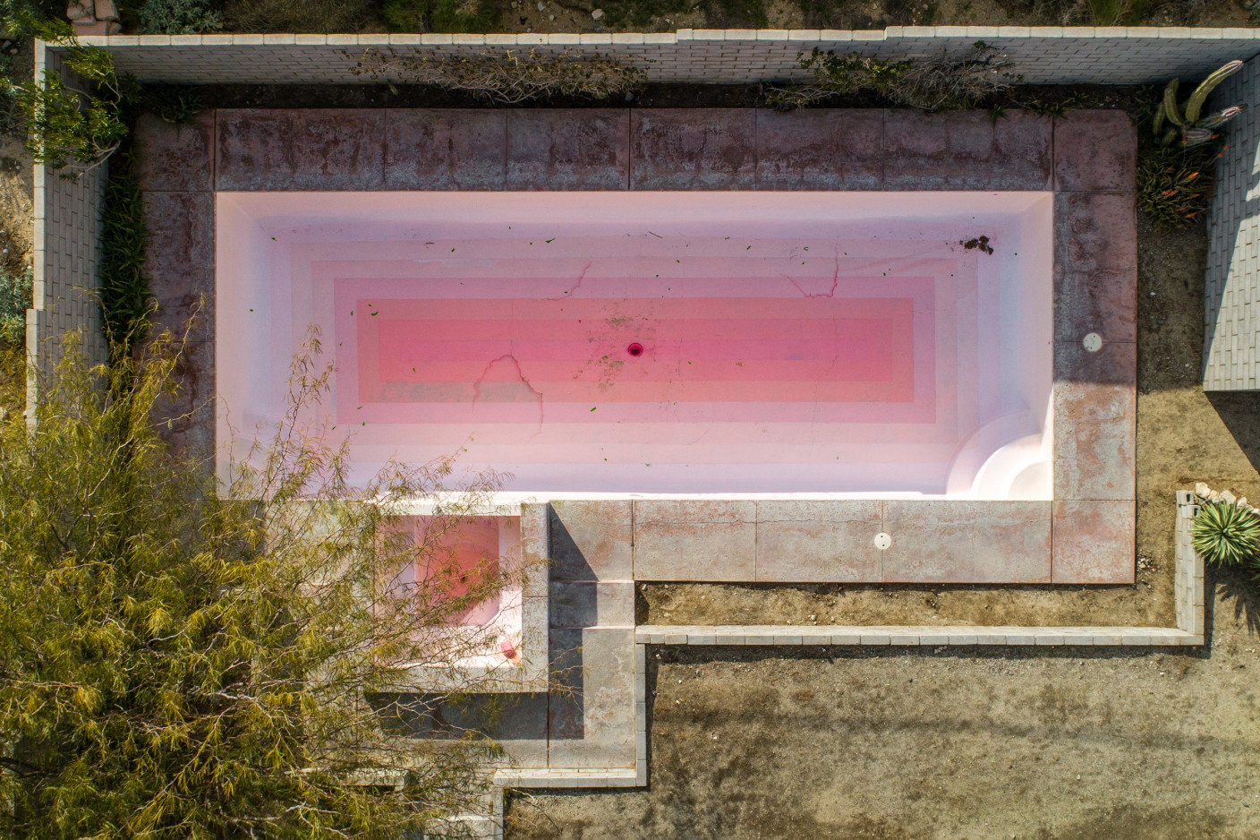 Executed Variant DHS #1 (Q1, CJ, DC), the painting sited in a pool connected to the property, is a loose variant on a series of works Hoeber titled the Execution Changes. It is connected to its neighboring Möbius strip by proximity, but also by color. The painting, like the pavilion, is an image of the mind in its own way: the painting is a study of phenomenological consciousness. Both the sculpture and the painting attempt to parse out how forms can represent the logical, irrational, historical and corporeal experiences of human consciousness.