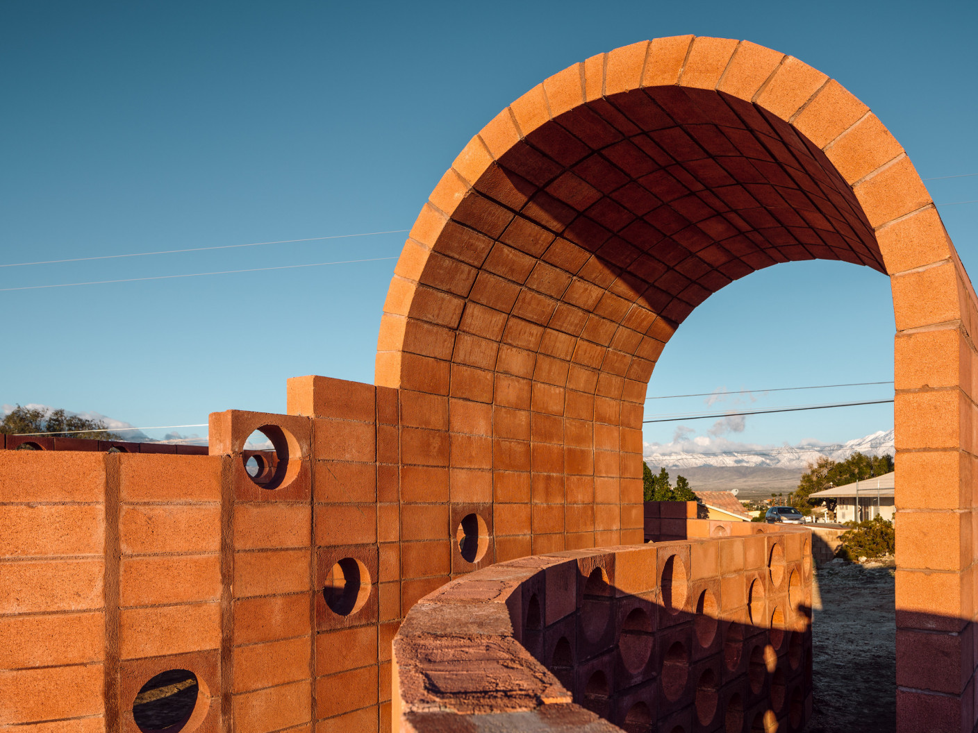 Going Nowhere Pavilion #01 is a Möbius strip made from concrete breeze blocks in a variety of fleshy pinks and browns. Technically, the Möbius strip is a surface with one continuous side formed by joining the ends of a rectangular strip, but it has a direct relationship to methods of psychology. Famed psychoanalyst Jacques Lacan’s own attempts to use topology – the study of geometric properties – as a vehicle to describe the human mind is a subject artist Julian Hoeber has explored for years. As with the Möbius strip form, what is inside and outside the self can quickly become indiscernible.