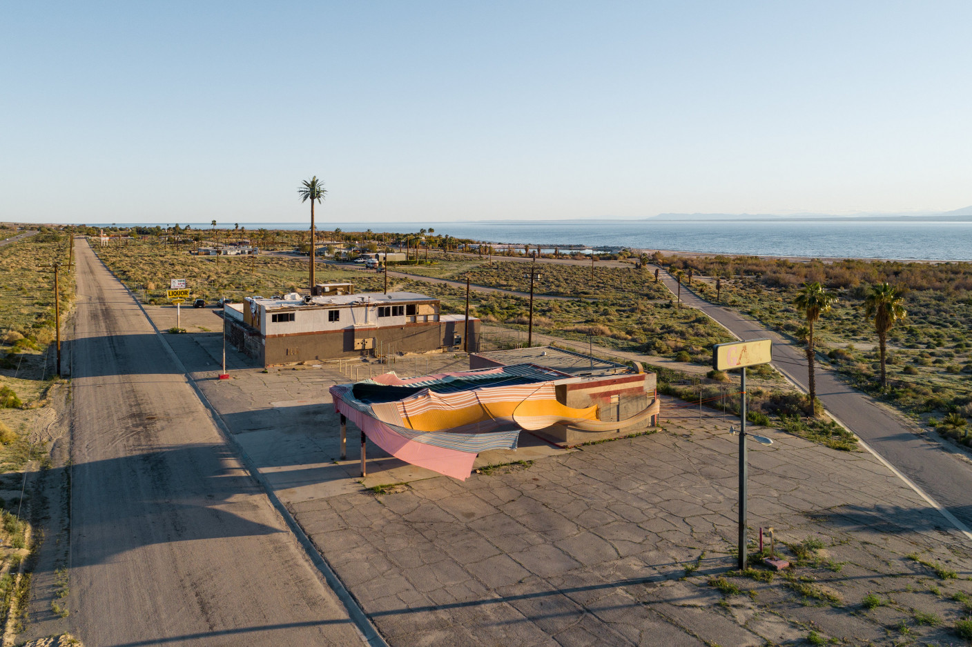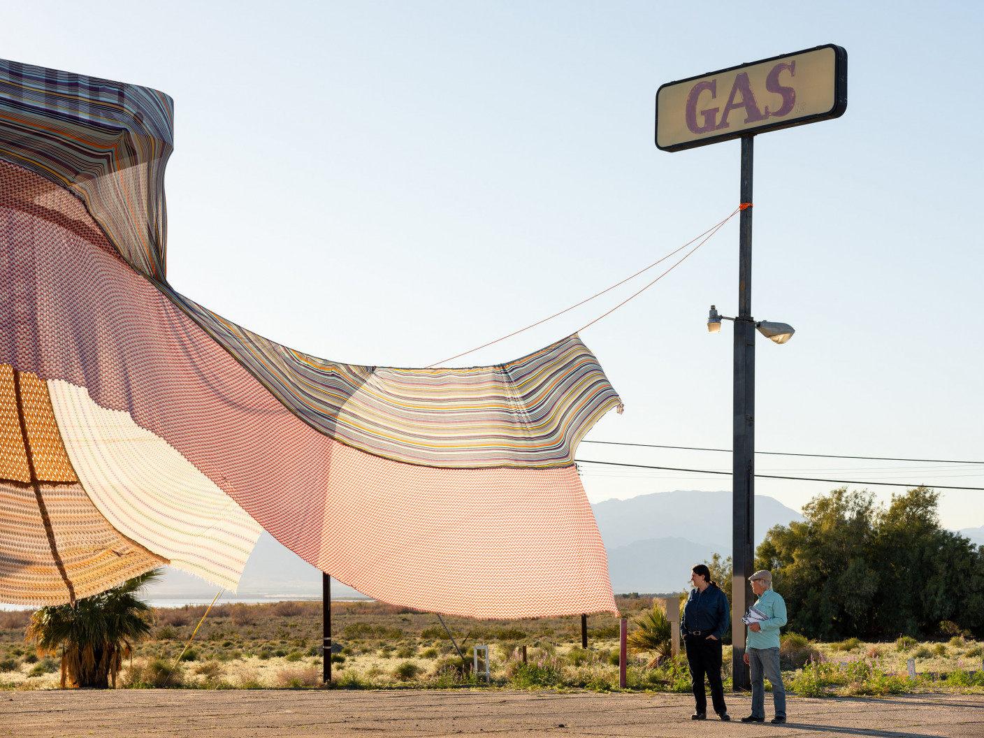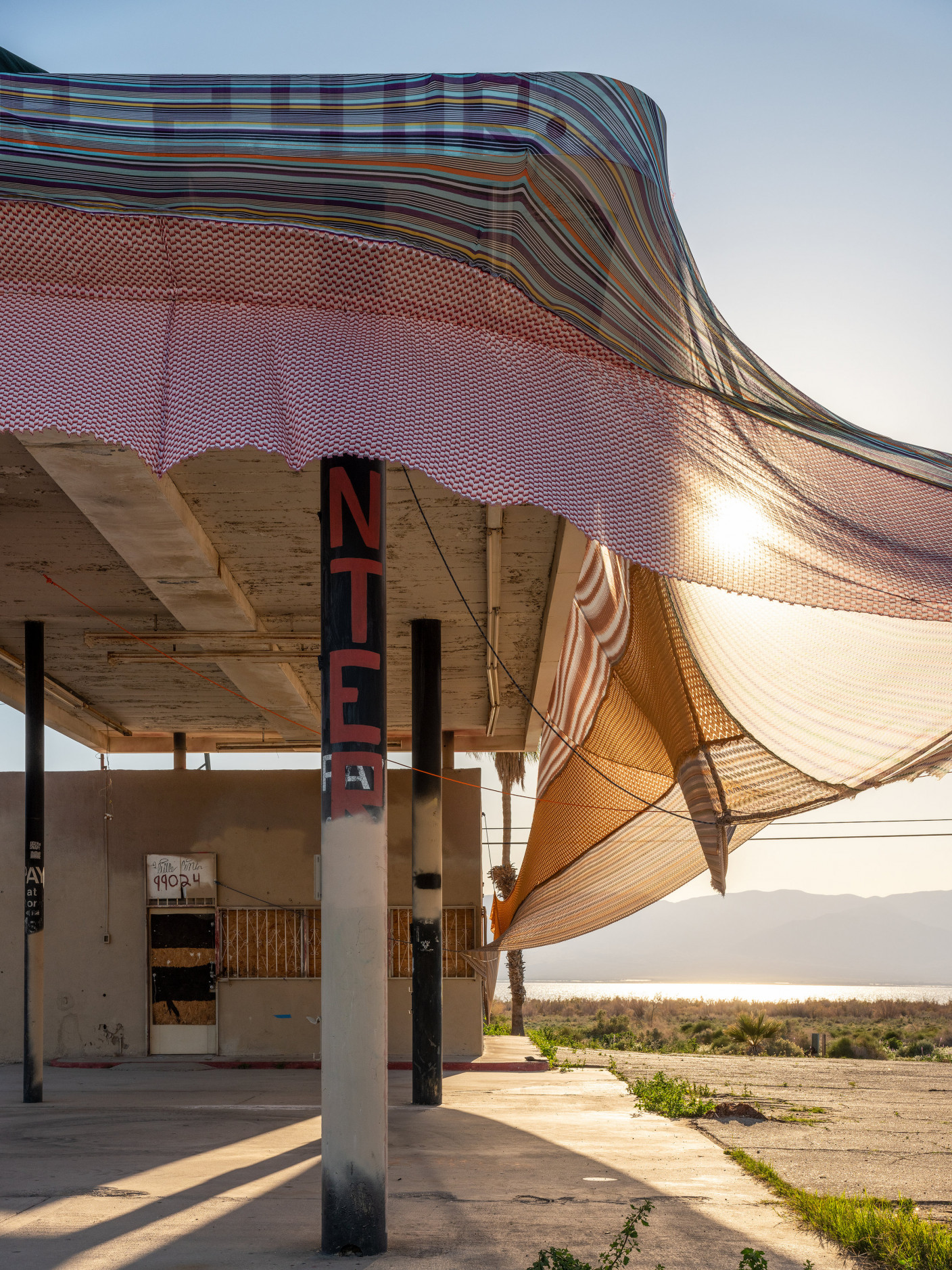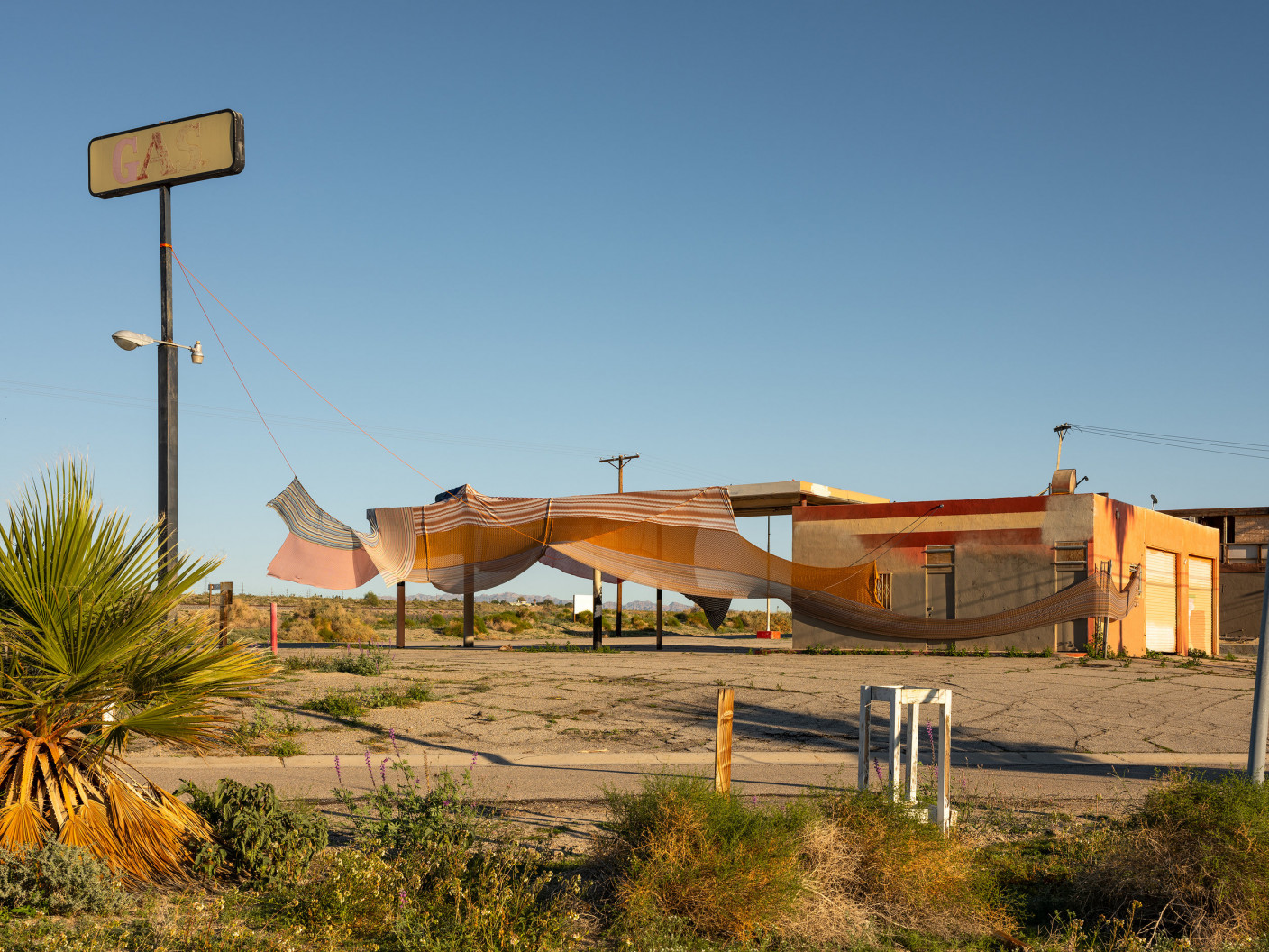 Using the site of a defunct gas station at the edge of the Salton Sea, artist Eric Mack employs his distinctive language of material as gesture to create a living architecture. Silks and tulles have been stretched with rope tensioned to form a line in space, or to reframe the building’s relationship to itself and its surroundings. The iconic Southern California car garage, draped and reanimated as a site-specific sculpture, brings something singular to an already-striking natural location. Halter offers its visitors a respite or site for gentle reflection that can be explored by moving between and among the folds of undulating, colorful, and lush fabrics. It is at once evocative of an unfastened garment, vacant tent, or open umbrella, all fluid and shifting references that the artist has assembled as a physical embodiment of real and imagined desert wanderers.