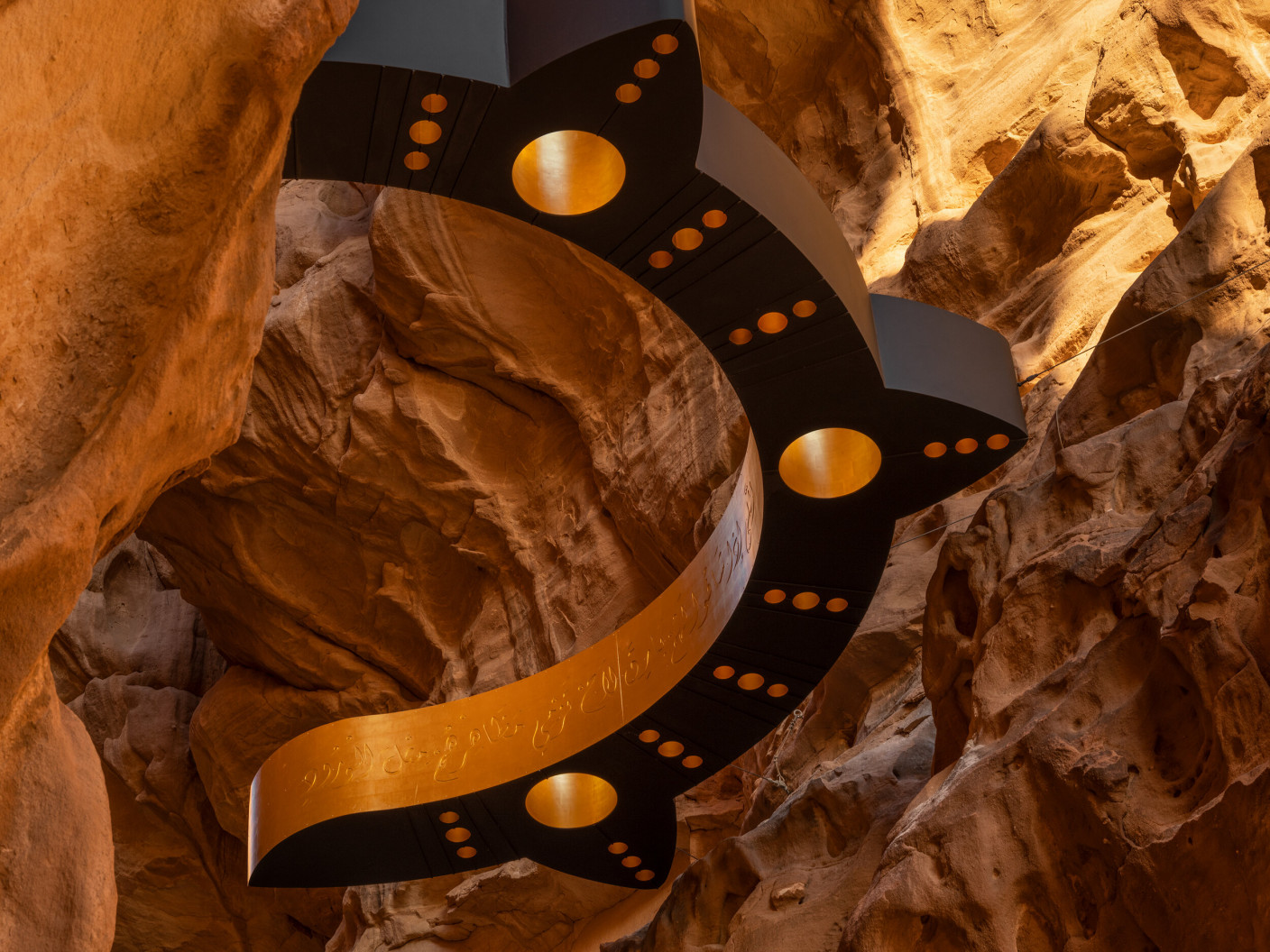 Upon first encountering the work, Kholkhal Aliaa will appear as a single line in the landscape, a stripe of matte black that interrupts the rocky ravine. It is a modernist gesture in contrast to its surroundings. It is only upon approaching the crevice that the work’s elliptical shape and ornamentation is revealed. As you move underneath and around it, the work frames the landscape in different ways, positioning the viewer in three distinct postures – inward (toward the mountain); upward (to the sky); and outward (toward the valley). This sequence of movements and attentions are a guided ritual, connecting the body and the earth. Light will filter through openings in the sculpture to pattern the ground. Shifting motifs with the movement of the sun and shadow across the course of the day, it creates a light drawing on the ground, while framing the sky. The bottom surface of Kholkhal Aliaa, high above viewers’ heads, will glow with gold leaf, inscribed on the interior with the words of a local Bedouin poet, Aliaa bint Dawi Alayyah AlDalbahi AlOtaibi, making a crown and a connection between the land and the air. It is a portal at the juncture of body and land, earth and sky, between generations and across time.