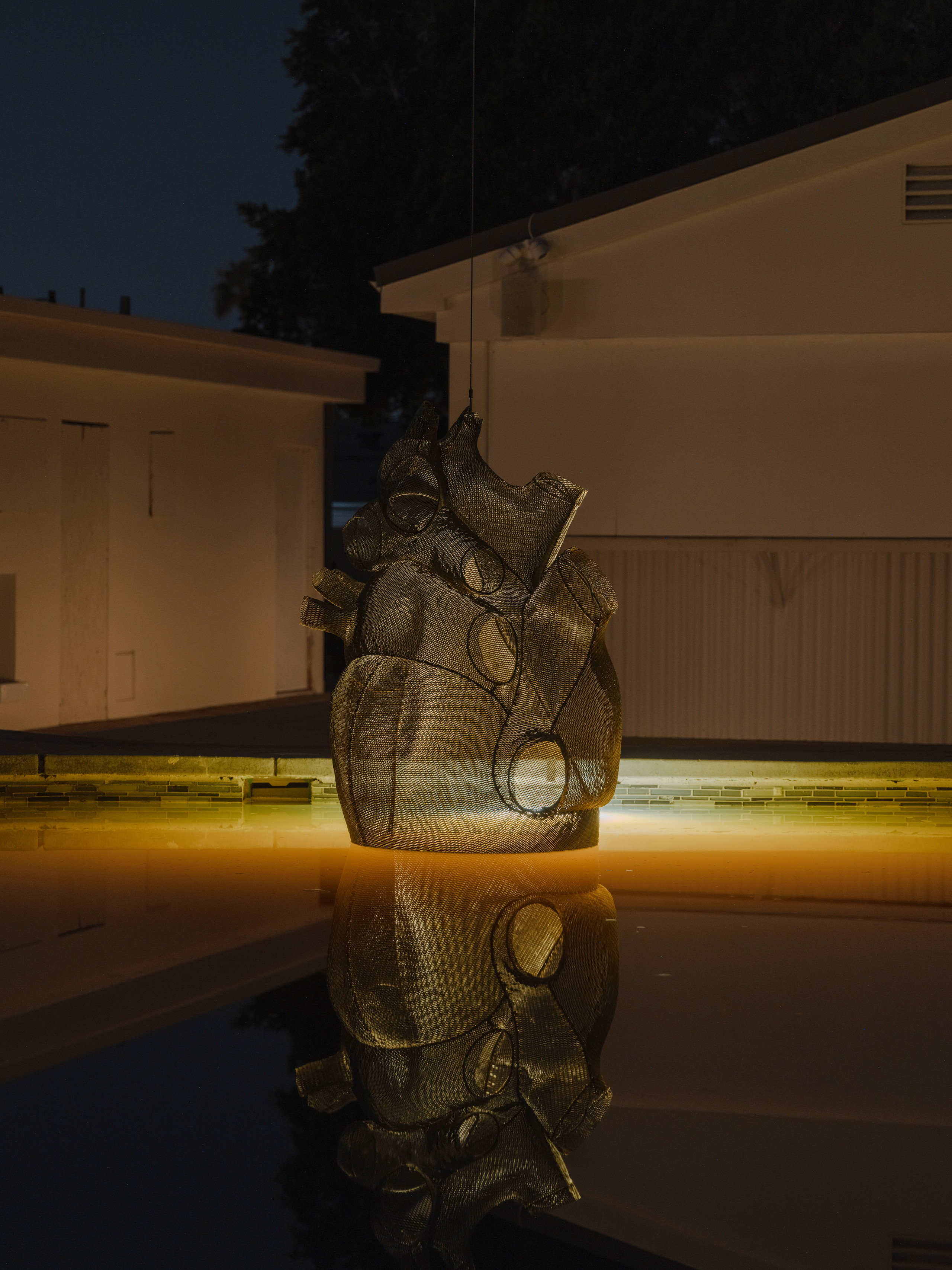 Bon and Metabolic Studio have created a poetic object that submerges visitors in the deep past and the distant future, taking inspiration from plants, which metabolize sunlight into energy, and the blue whale, the largest animal known to have lived on Earth. Fueling the potential for future life and visually transforming itself in the process, the work, which merges swimming pools in a landscape associated with tremendous water shortage, with water and fish-bone skeleton “sand” from the Salton Sea, reminds us not only of the imperative for artists to create at the same level as society’s capacity to destroy, but also of our own connection to water and that the desert was once a sea. A lace-like steel sculpture of a to-scale blue whale heart is submerged in a pool pumped full of Salton-Sea water, but rather than stand as a harbinger of death, the sculpture metabolizes and creates energy and clean water that it deposits back into the atmosphere, fueling the potential for future life across the run of the exhibition and visually transforming itself in the process.