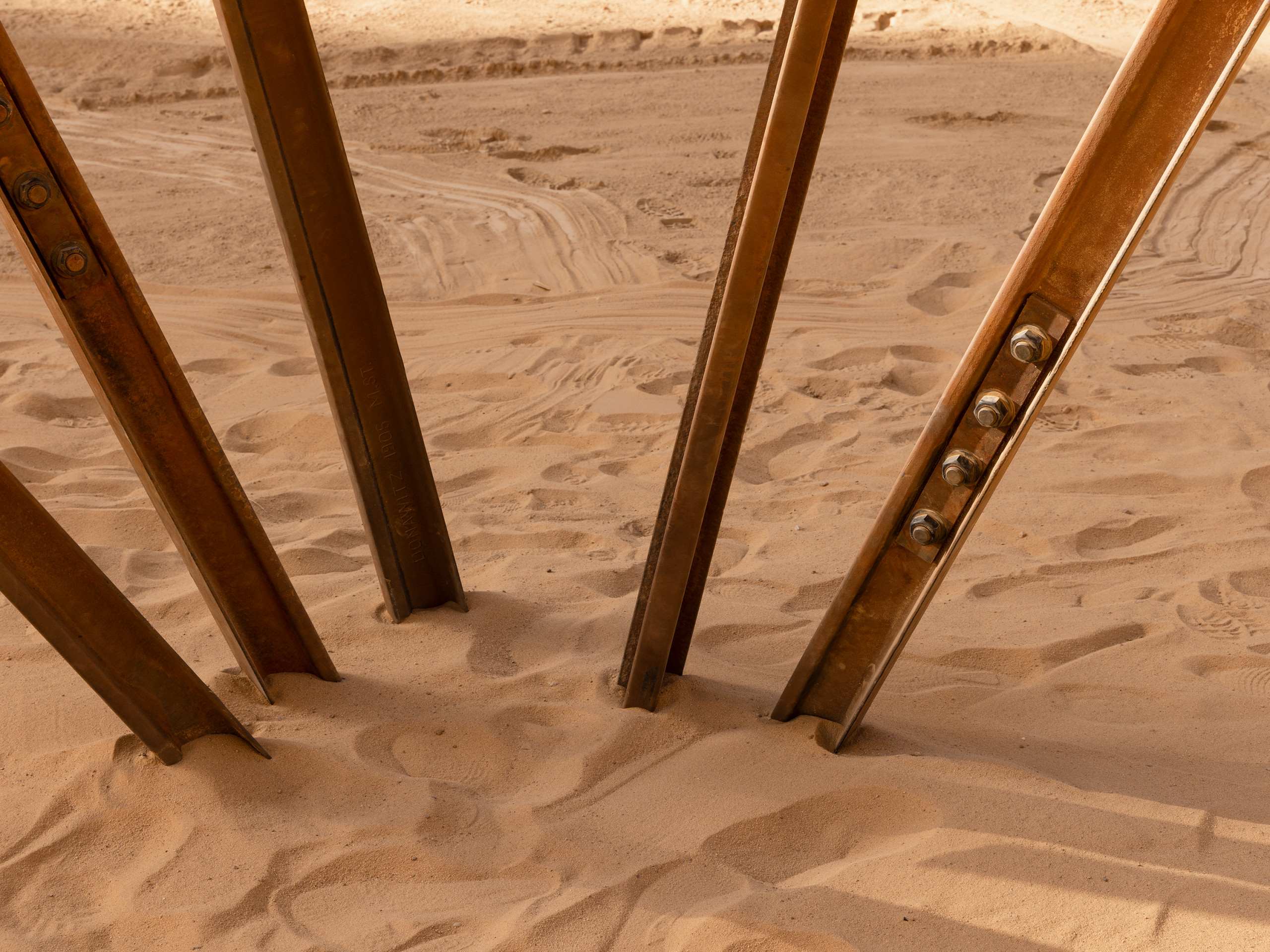 Silent Witnesses of the Past pays homage to the memory of the Hijaz railway. The form is constructed from rusted scavenged rails placed in an upright position, each split from the top with the ends twisting towards the ground. It exists as a singular monument in the wadi, or flood plain, of an abstract oasis, inviting visitors to wander through it and inspiring a calm moment of contemplation of the present and past, evoking the footsteps of those who have come before and will come after.