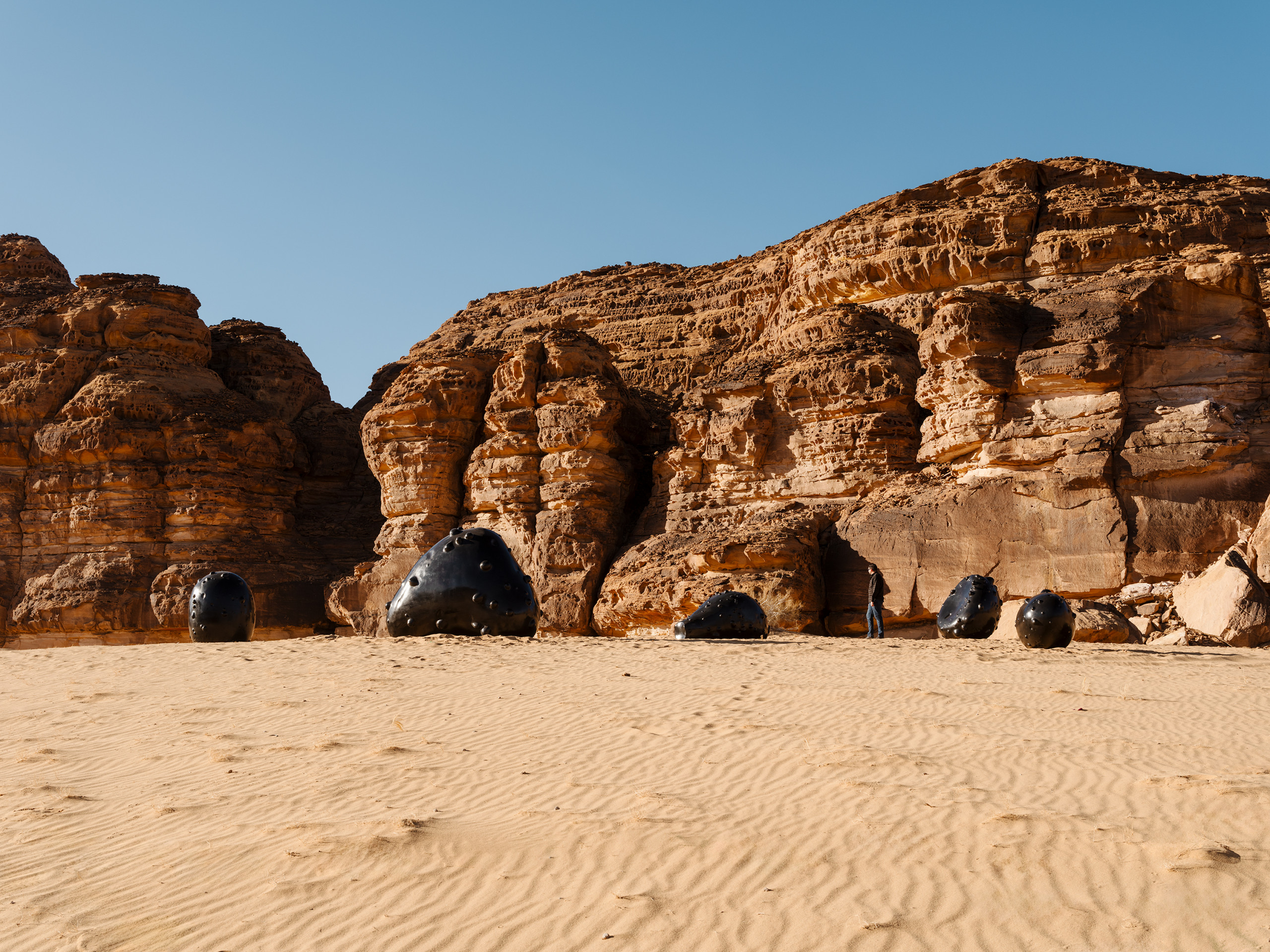 Inspired by this story, Al Qadiri recreates the Wabar Pearls as giant black objects spread across the sandy landscape of AlUla, almost as if they had fallen out of the sky. For the artist, the work is meant to inspire the same sense of mystery and wonder that the people of the Empty Quarter had felt upon seeing these strange objects, and the magical stories one might concoct because of their presence.