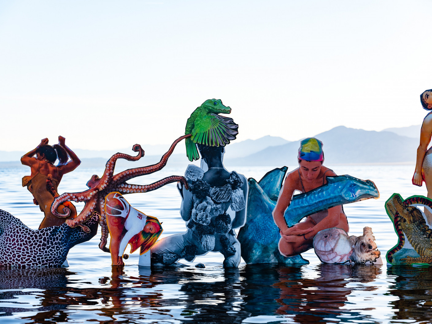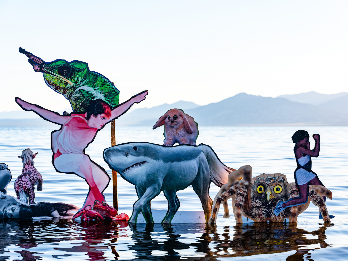 This piece also includes a free-standing sculptural work that synthesizes the animistic aspects of dance with her interest in the Salton Sea. Combining aspects of her dance with hybridized animals she has created a bestiary of the ancient and modern, the sacred and the profane collaged into a landscape of both hope and despair. Bengolea’s collage continues this tradition engaging the audience in the interactive dance of the imagination.