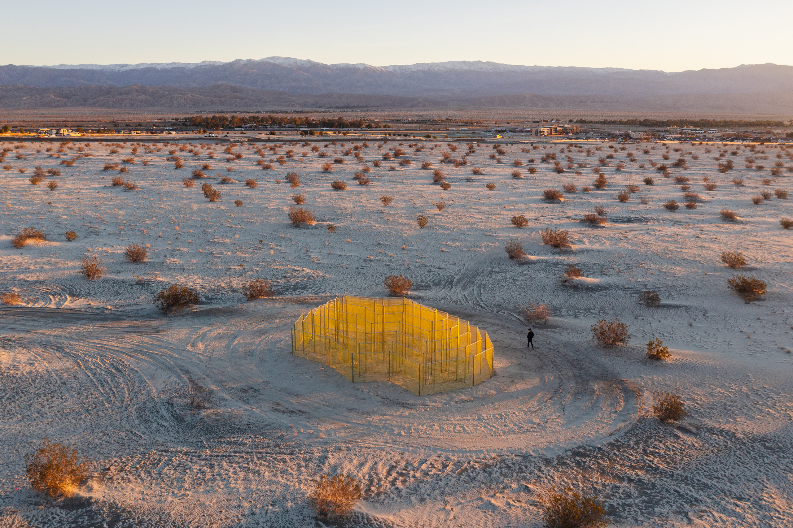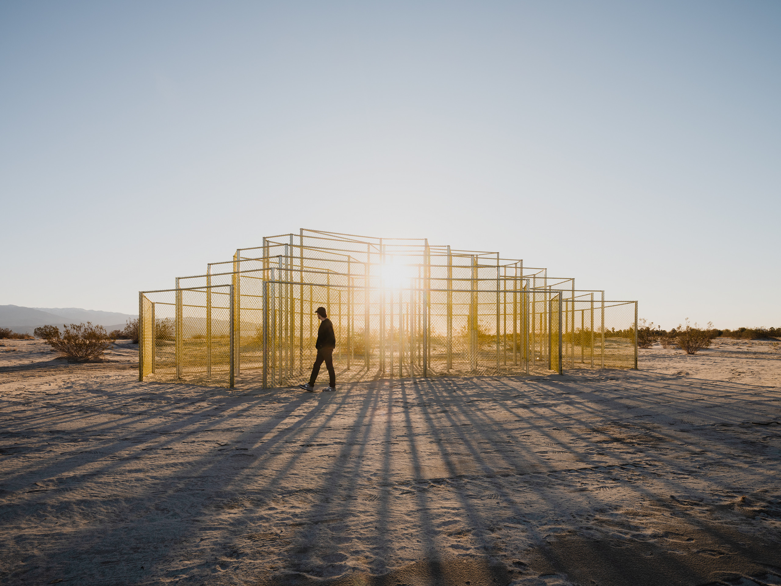 Responding to the ubiquity of the chain-link fence as a pattern spread across the Coachella Valley — a material that is meant to protect but also carries associations of violence — Begum diffuses the material’s role as a divider through her manipulation of its form and color. We notice how light and air, sand and water, as well as people, can filter through her cloud-like pavilion, which offers paths of expansive escape rather than reductive confinement. Constantly changing with the movement of the sun and the visitors inside of it, the work emphasizes that nothing in life is static; everything, from the world outside to our emotions within, is in a continual state of flux.