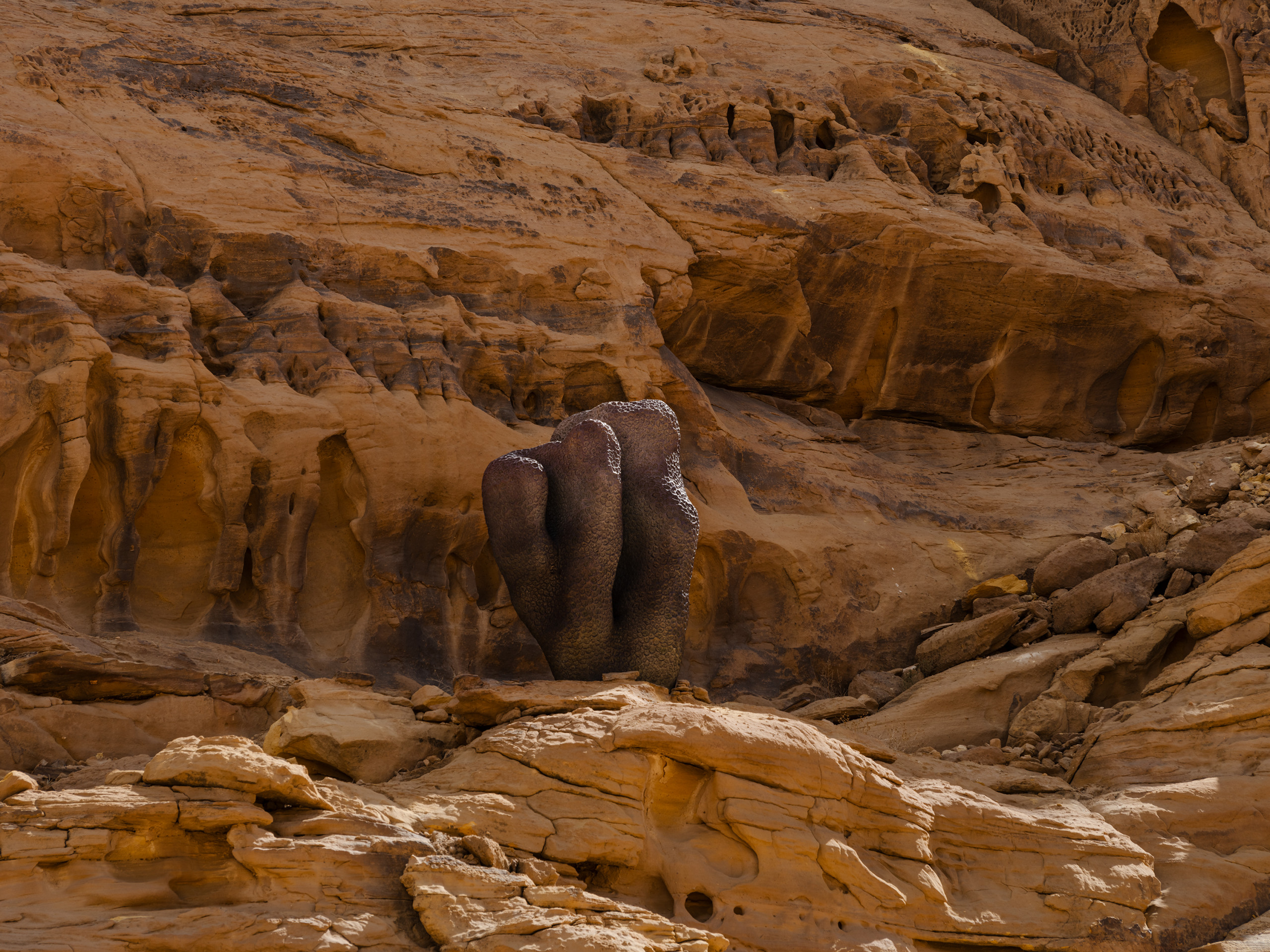 With Coral Alchemy I (Dipsastrea Speciosa) and Coral Alchemy II (Porites Columnaris) Dawood brings the ocean to the AlUla desert floor, exploring the ancient geo-biological relationship between the two landscapes. In dialogue with geologist Chris Collins, Dawood learned that this AlUla canyon would have, ten million years ago, been the delta for what became the Red Sea.