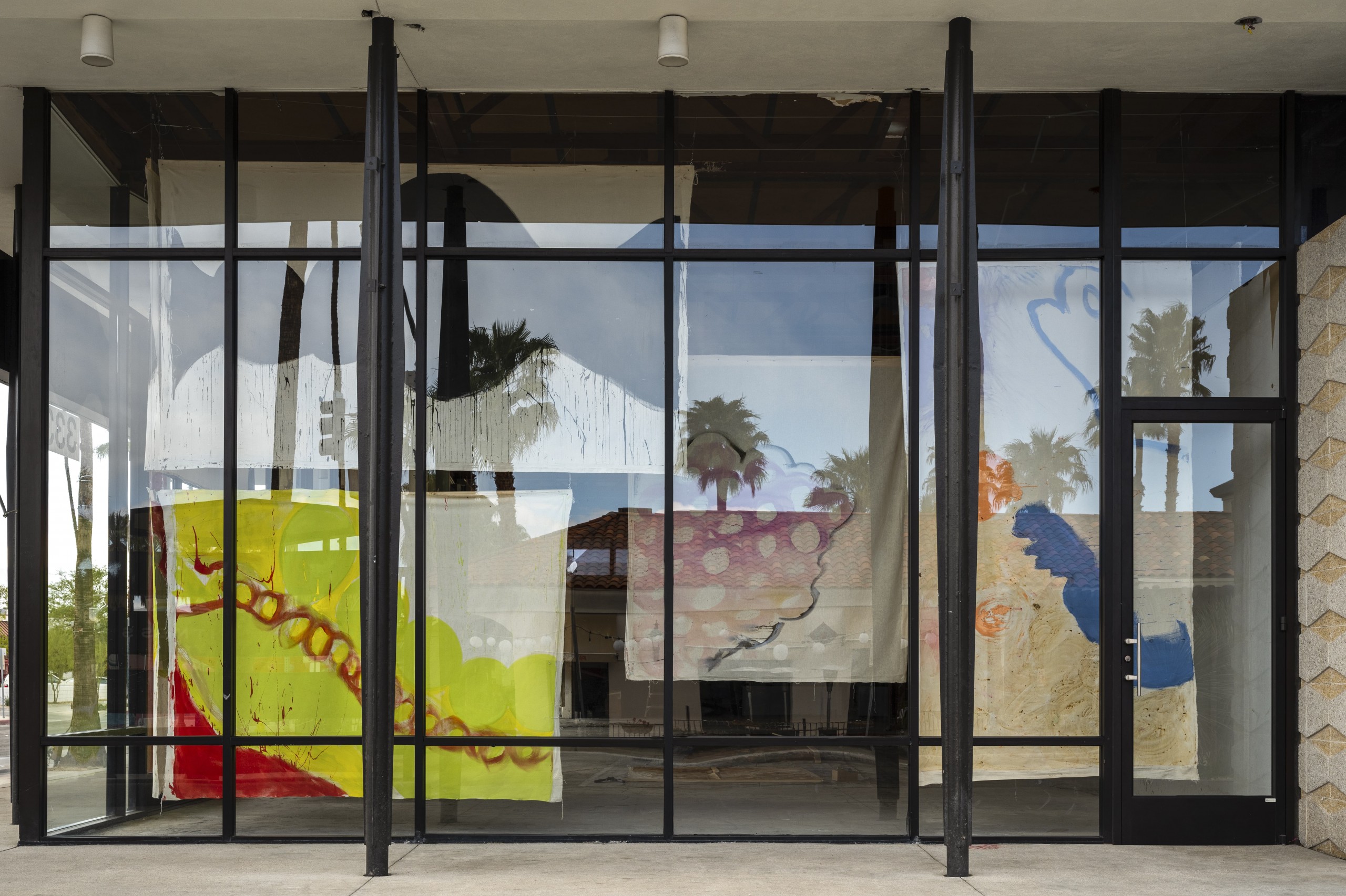 Tamanrasset is an installation of large-scale abstract paintings and light inspired by the Coachella Valley landscape. Due to travel restrictions, Vivian Suter was unable to conduct a site visit to the desert and instead explored the ways the region exists in pictures. Using colors to create moods, shapes to reference natural formations and landmarks, and exposing the canvases to the elements to generate textures, her paintings speak to the embodied and emotional dimensions of the desert landscape — to the ways deserts provoke personal associations and trigger memories that are not always resolved. Situated inside a modernist building, Suter’s installation reminds us that the desert is not only a place but also a condition that shapes the lives of many peoples around the world.