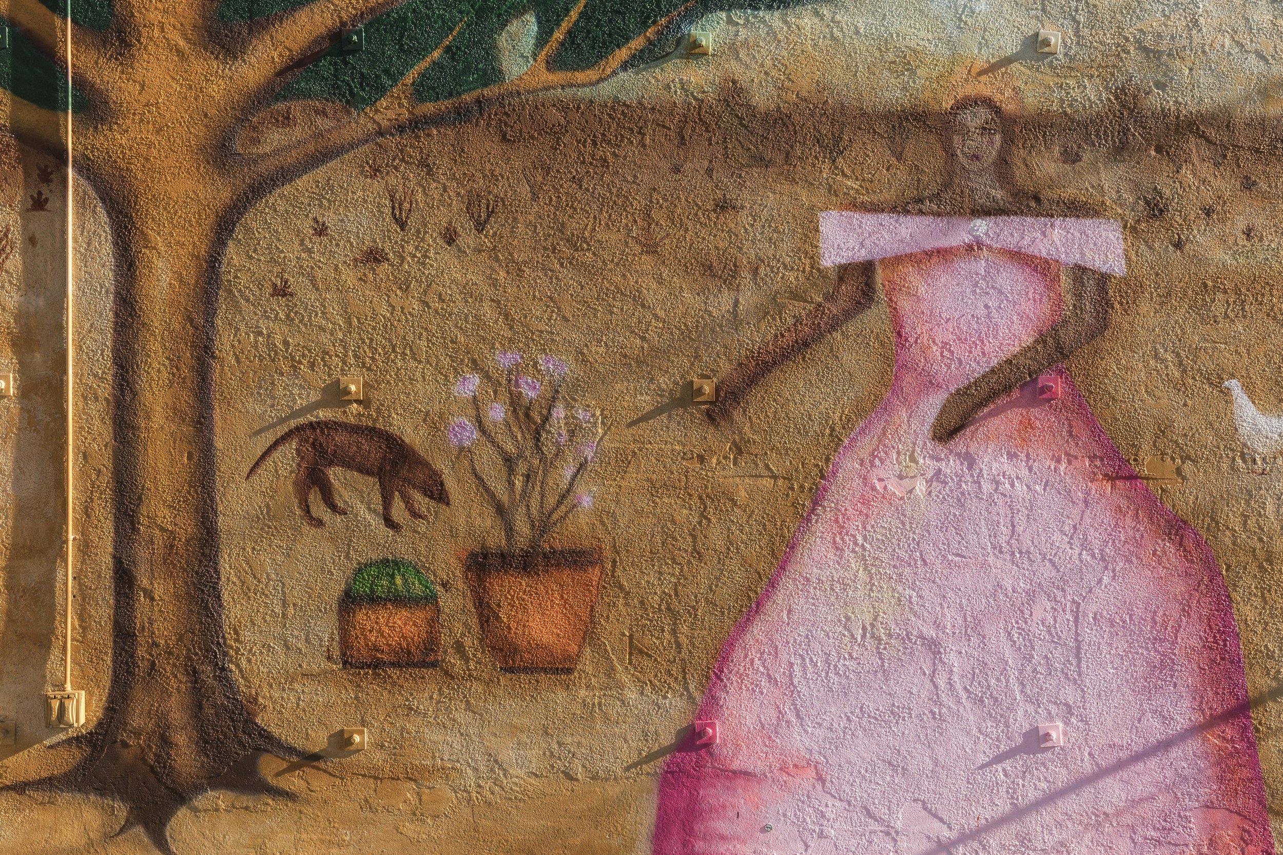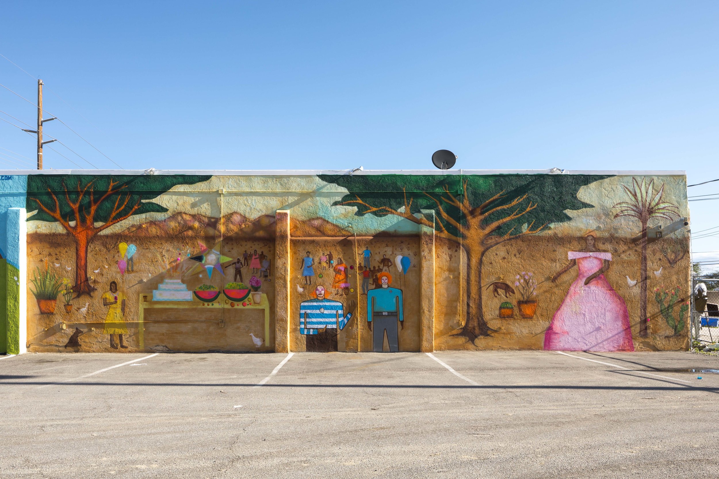 In 2011, Armando Lerma (formerly Date Farmers) started Coachella Walls. Over the past three years, it has developed into an essential ongoing arts driven community revitalization project, focused towards the upliftment of a low income, marginalized community in Downtown Coachella’s Historic Pueblo Viejo District. In addition to stimulating foot traffic to the area, “Coachella Walls” continues to raise awareness for the larger Eastern Coachella Valley and is dedicated “to the anonymous farmworker.” For Desert X, Armando created his own mural as part of the growing project in the city of Coachella.