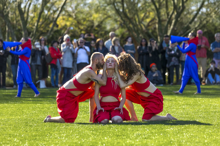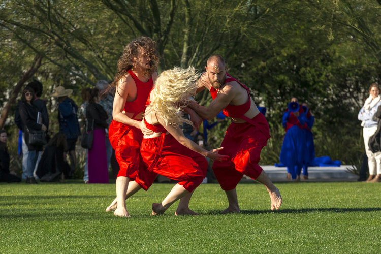 For Desert X, Lita Albuquerque chose to work at The Annenberg Retreat at Sunnylands Center & Gardens because of its history as a gathering place. An oasis within the desert, Sunnylands perhaps is best known as the Camp David of the West, frequently hosting Presidential vacations, retreats and summits. However, it is also a place where scientists and authors, individuals with varying backgrounds and experiences, offer different thoughts and ideas. It is a place of welcome and dialogue. An opening performance at 3pm on February 23rd and a sculptural installation with an audio component compose Albuquerque’s artwork for DesertX, hEARTH. A play on words – a gathering site for storytelling, the ear, Earth – the artwork’s title speaks to art’s ability, here, through movement, voice and sculpture, to both listen and become a catalyst for action. Working in close collaboration with Kristen Toedtman of the Los Angeles Master Chorale and dancer and choreographer, Jasmine Albuquerque, the performance gives mass and volume to the silent act of listening. As audience in general, the implicit task is to watch, to listen. The silence of the desert compounds this task. Taking instructions from the desert, Albuquerque gives the act of listening bodies in which to move and voices that sing on its behalf. The sculpture is a life-size resin cast of the female form painted in ultramarine blue. The viewer encounters her in the center of a field of white sand, she is on the ground and upon closer inspection we see that she is indeed placed with one ear down, listening. Speakers placed in the surrounding garden intermittently play an audio track featuring a libretto written by Albuquerque. Through performance and installation, hEARTH posits that listening can be embodied and that through this embodiment true dialogue is achievable.