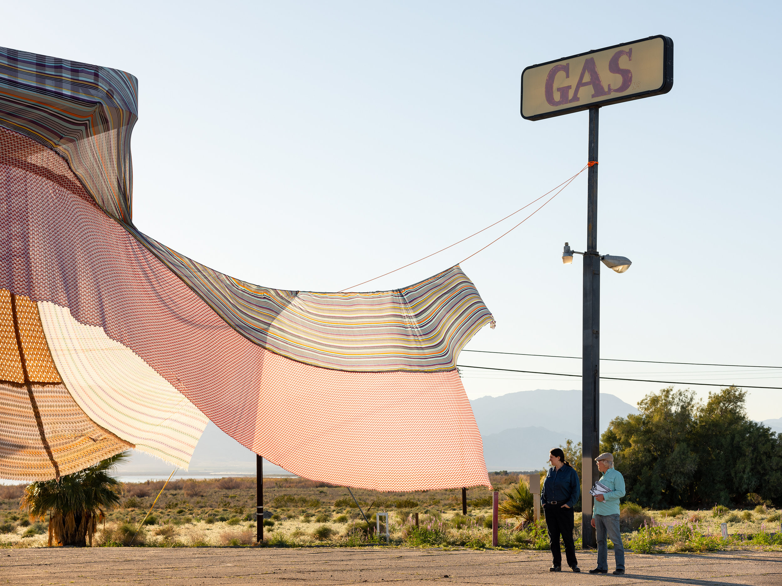 Using the site of a defunct gas station at the edge of the Salton Sea, artist Eric Mack employs his distinctive language of material as gesture to create a living architecture. Silks and tulles have been stretched with rope tensioned to form a line in space, or to reframe the building’s relationship to itself and its surroundings. The iconic Southern California car garage, draped and reanimated as a site-specific sculpture, brings something singular to an already-striking natural location. Halter offers its visitors a respite or site for gentle reflection that can be explored by moving between and among the folds of undulating, colorful, and lush fabrics. It is at once evocative of an unfastened garment, vacant tent, or open umbrella, all fluid and shifting references that the artist has assembled as a physical embodiment of real and imagined desert wanderers.