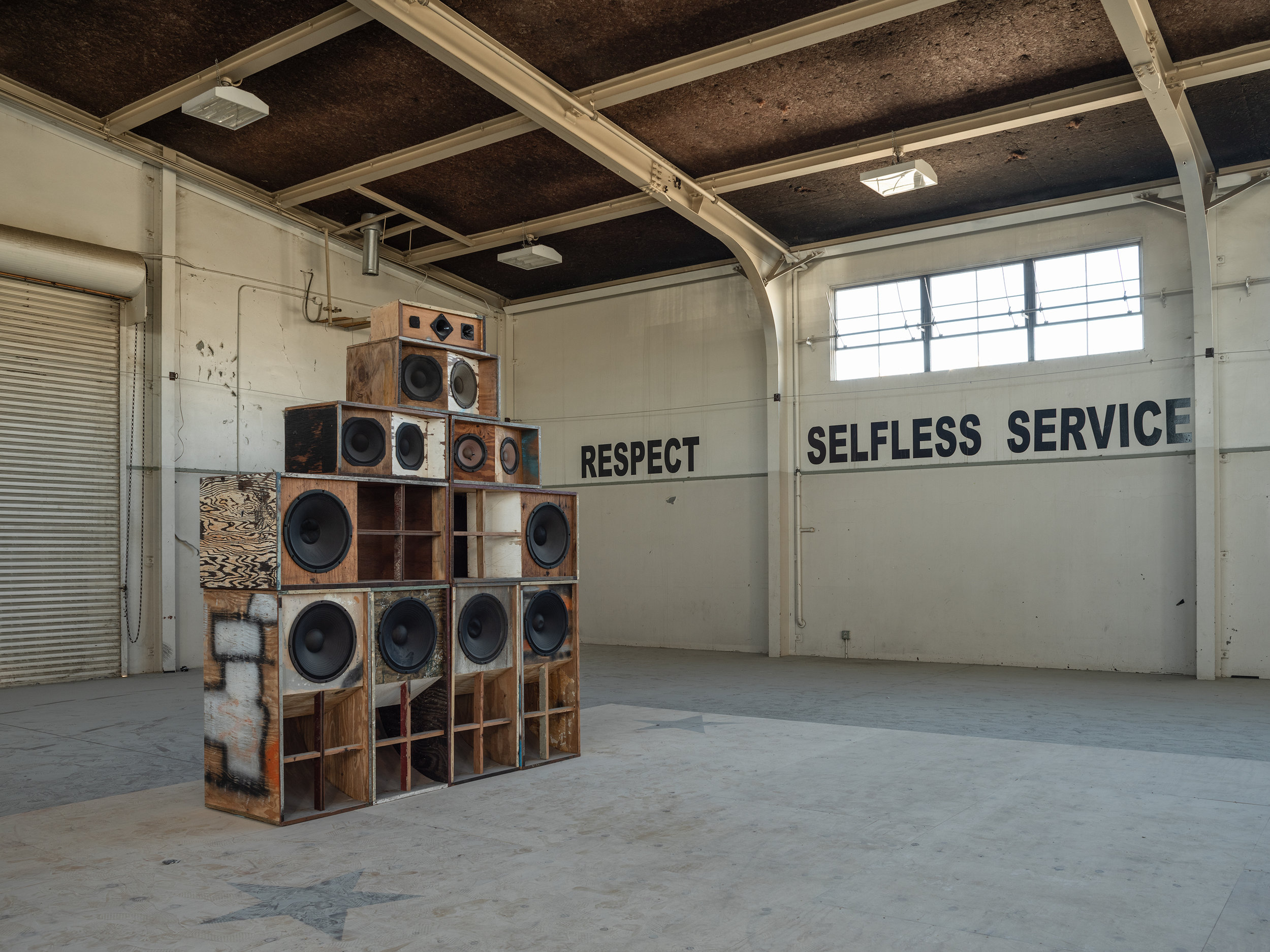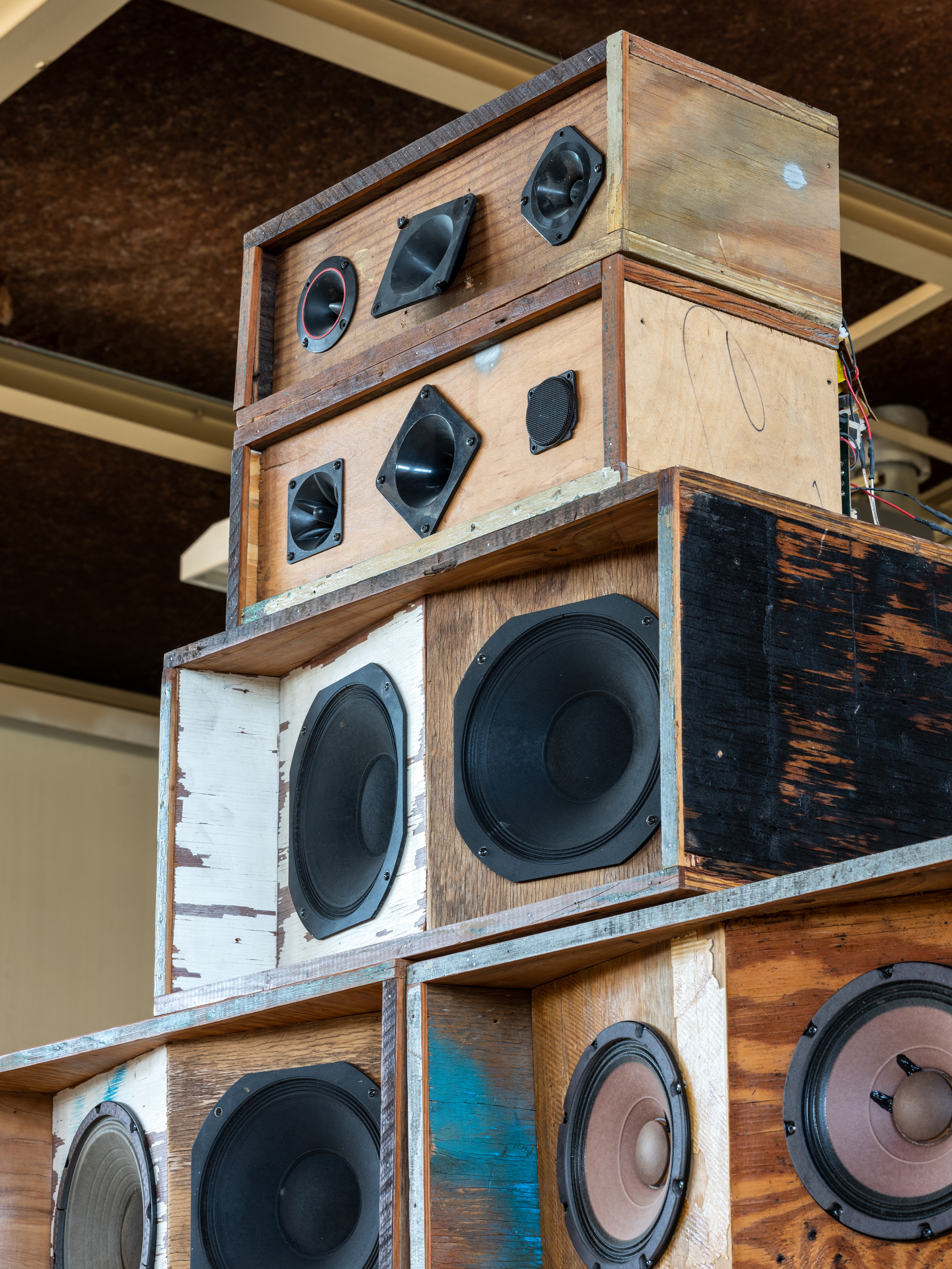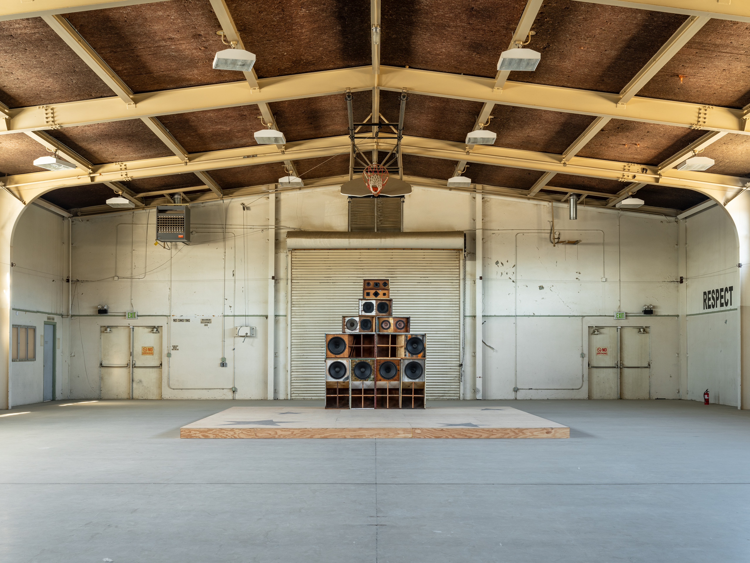 Recapturing Memories of the Black Ark is a sculptural installation that serves as both a literal and metaphorical platform for music and performance. Simmons is best known for his “erasure” drawings, partially erased chalk drawings on chalkboard walls — works that evoke a sense of loss and convey the persistent power of memory, foremost around the erasure of black voices and bodies. In Recapturing Memories of the Black Ark, a similar ghostly residue remains in the space through looped video documentation of the musicians’ performances. Inspired by the Black Ark, Lee “Scratch” Perry’s famed Jamaican studio and the site of the birth of dub, Recapturing Memories of the Black Ark includes a series of speakers hand-built from vintage parts and wood scavenged from the Treme neighborhood of post-Katrina New Orleans. Each performer can reconfigure the speakers according to their needs.