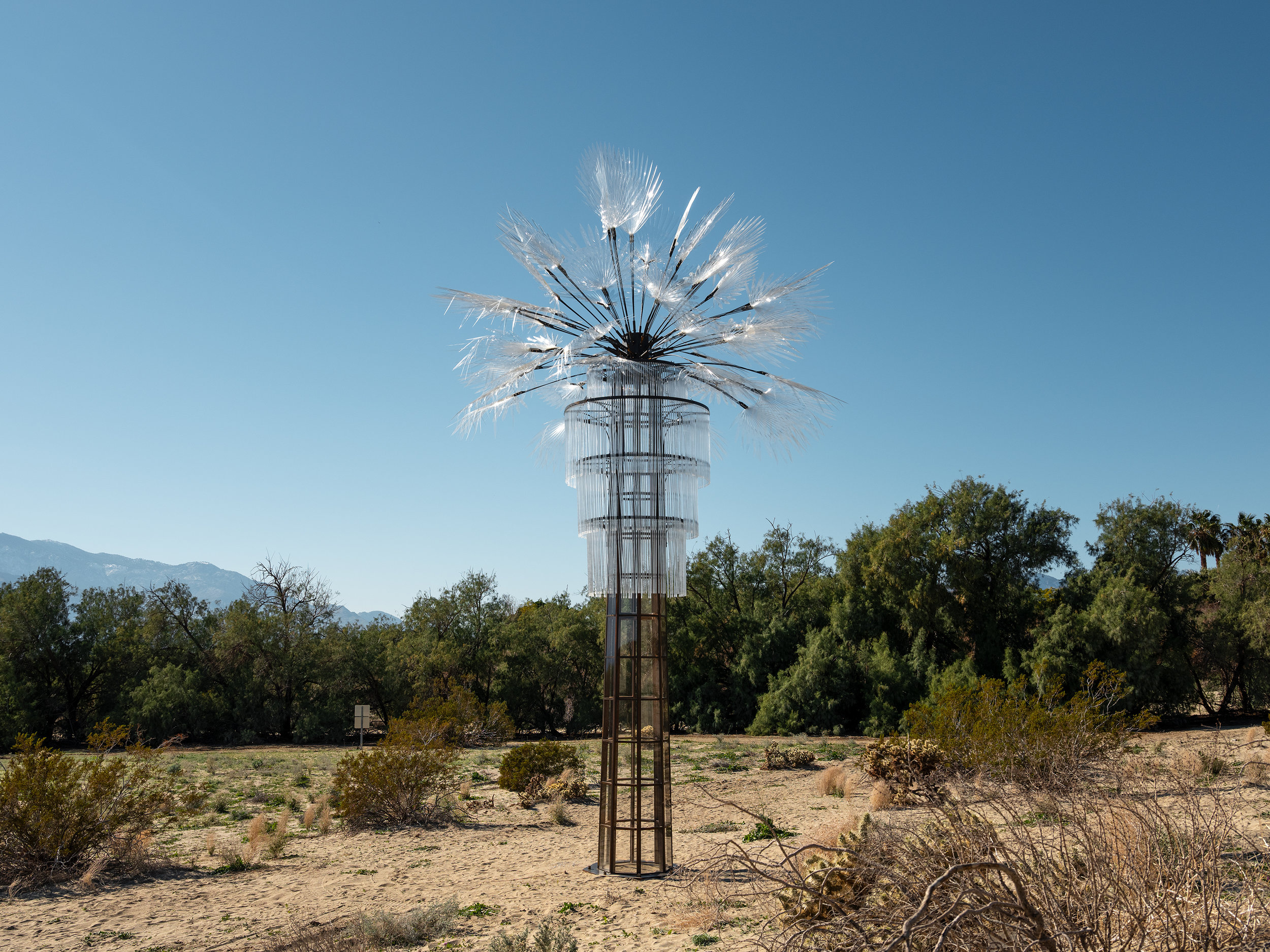 Ghost Palm is an echo of a natural form — a meticulous reconstruction of the largest palm species native to California, the Washingtonia filifera (desert fan palm). Nestled in a plot of low desert, between the foreboding San Andreas Fault path and a line of tamarisk trees, Ghost Palm is a manifestation of the artist’s fascination with the tenuous balance between fragility and sheer power. Standing taller than 20 feet, Ryan’s version of this iconic palm is constructed with manmade materials: steel, plastics and glass. Windowpanes in the style of a Victorian-era greenhouse make up the tree trunk; an iconic midcentury modern chandelier becomes the skirt of the tree; its leaves, a facsimile of Mother Nature’s perfect creation, are recreated in the form of glittering plastics. Drawing directly from nature’s design, the piece is self-reflexively manufactured, contextualized by the environmental features of the low desert landscape. While it is a substantially scaled man-made structure, it is essentially transparent, almost invisible. It becomes visible only when it catches reflections of the sun like a faceted crystal. Beneath Ghost Palm lies the geological activity that created this natural wonder. The San Andreas Fault and the palm tree oases that trace its presence are created by two massive tectonic plates meeting — the North American plate and the Pacific plate. Water running deep underneath the earth pools into these fissures, thus creating lush palm sanctuaries. Ghost Palm mimics what already exists in proximity to it, repositioning itself in nature in an homage. It makes visible our bodily connection to these sites, to the churning of the earth beneath us, and the natural forces we humbly exist within and among.