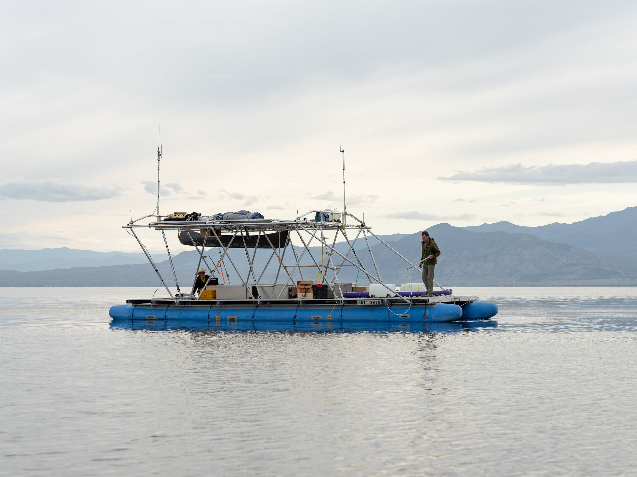 The solar powered Terminal Lake Exploration Platform (TLEP) explores remote bodies of water. First employed by artist Steve Badgett and architect Chris Taylor to explore the Great Salt Lake (in collaboration with the Center for Land Use Interpretation) the platform’s has a modular design that maximizes deployability in inhospitable conditions and inaccessible bodies of water. This floating laboratory, with necessary life support and research infrastructure, focuses on terminal lakes. TLEP looks at these particular types of lakes precisely because they contain exceptional environmental traces, exemplified by the Salton Sea, which has collected decades of agricultural runoff, resulting in a particularly stressed ecosystem. Previously the lake served as a repository of military testing. It was stocked for game fishing and promoted as a water skiing mecca. It is a primarily feeding group for hundreds of species of migrating birds threatened by its current state and potential evaporation. The artists read the Salton basin as reflector of present ecological and political conditions—at once dire, present and ignored. The TLEP invites us to look more closely at our environment and its problems through the fascinating lens of the Salton Sea’s history. In the artists words, “Our interest is to peer into this murky bowl to reveal textures, contents, and circumstances that have been accruing under the protection of water since 1905.” A primary activity of the TLEP will be to capture the desert floor beneath the lake. The TLEP will draw out evidence of the interaction between subaqueous earth and fragments of past human activity. Results will be on display in the Salton Sea Visitor Center near the TLEP mooring within the State Park.