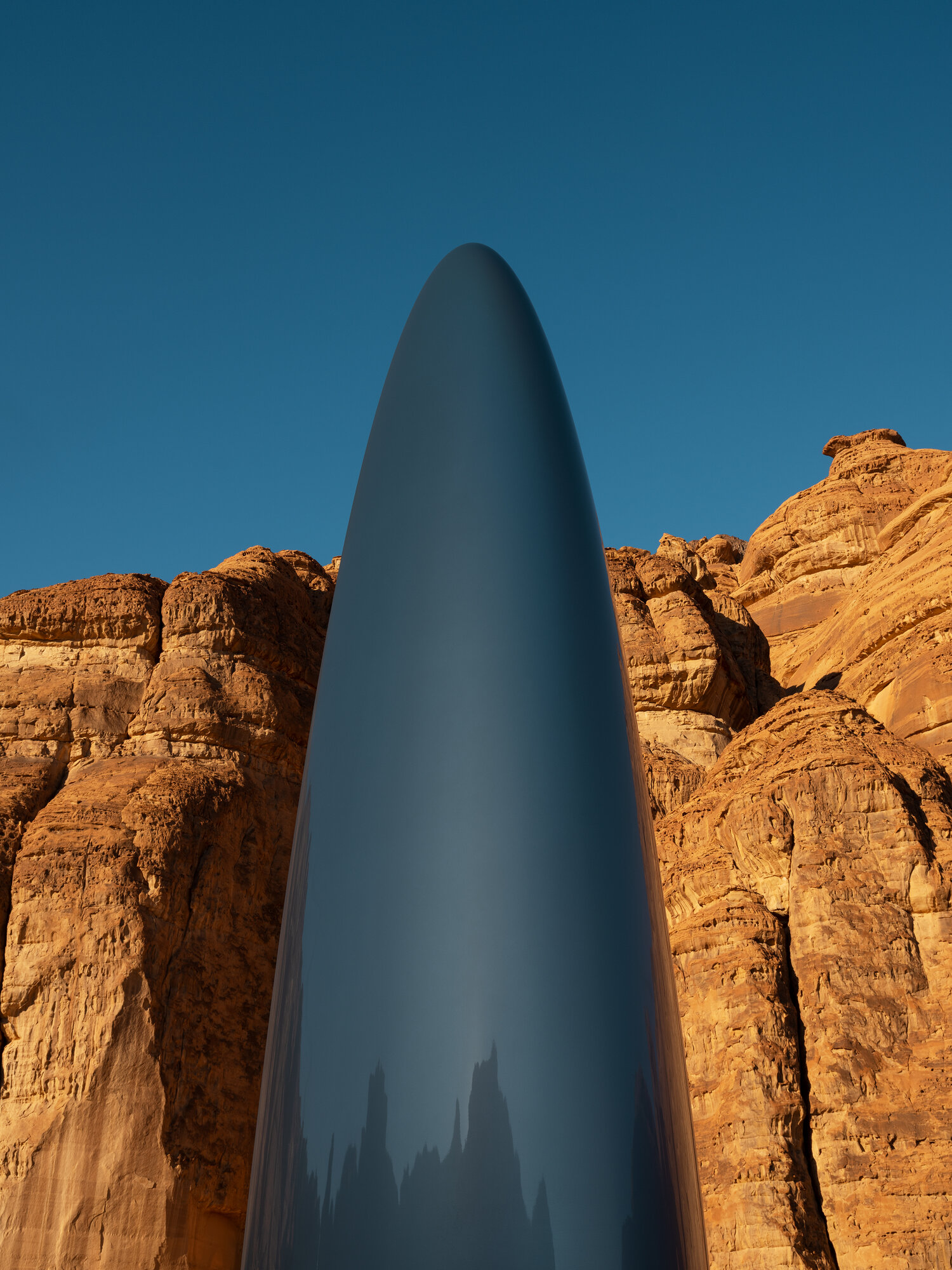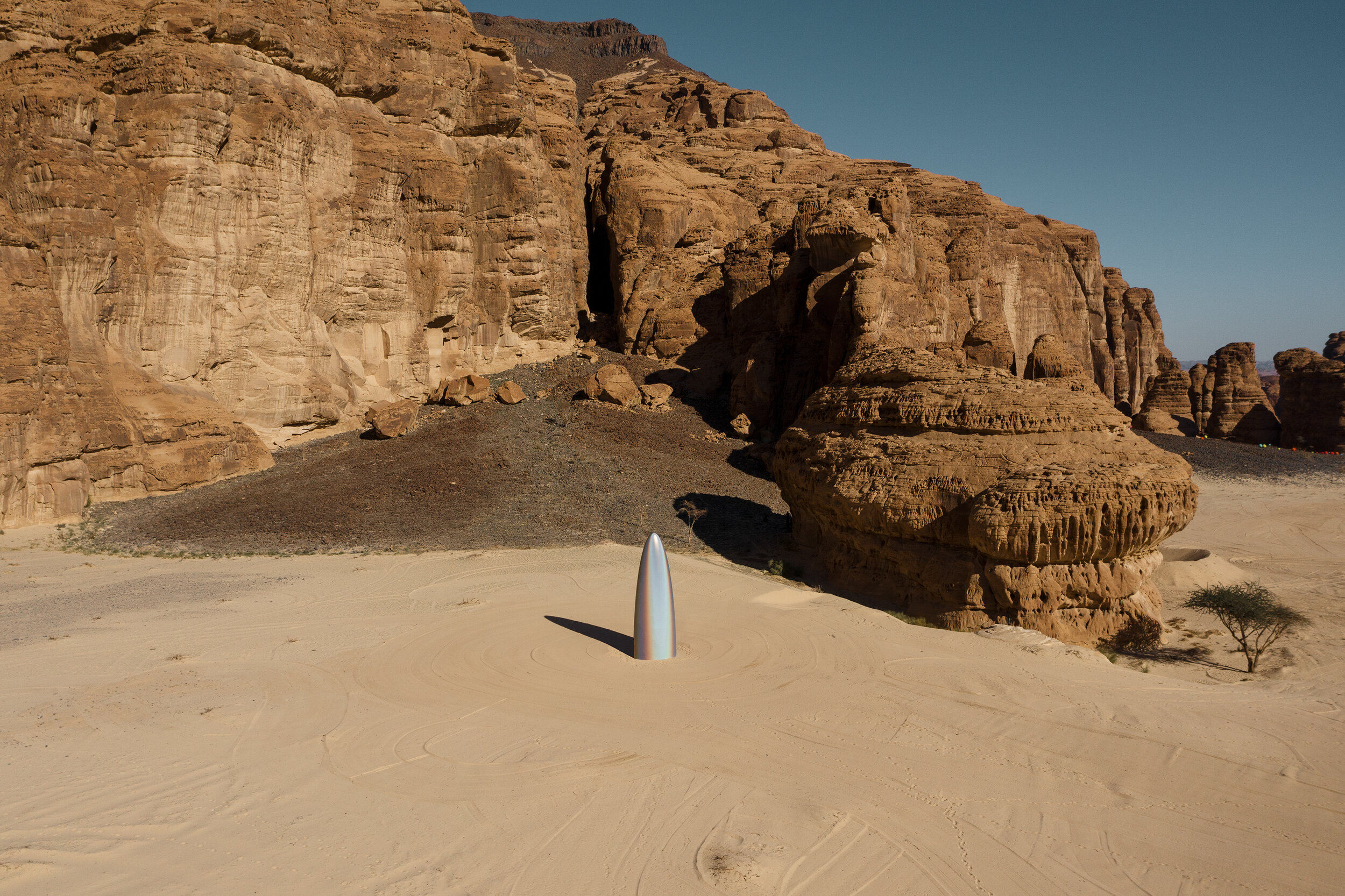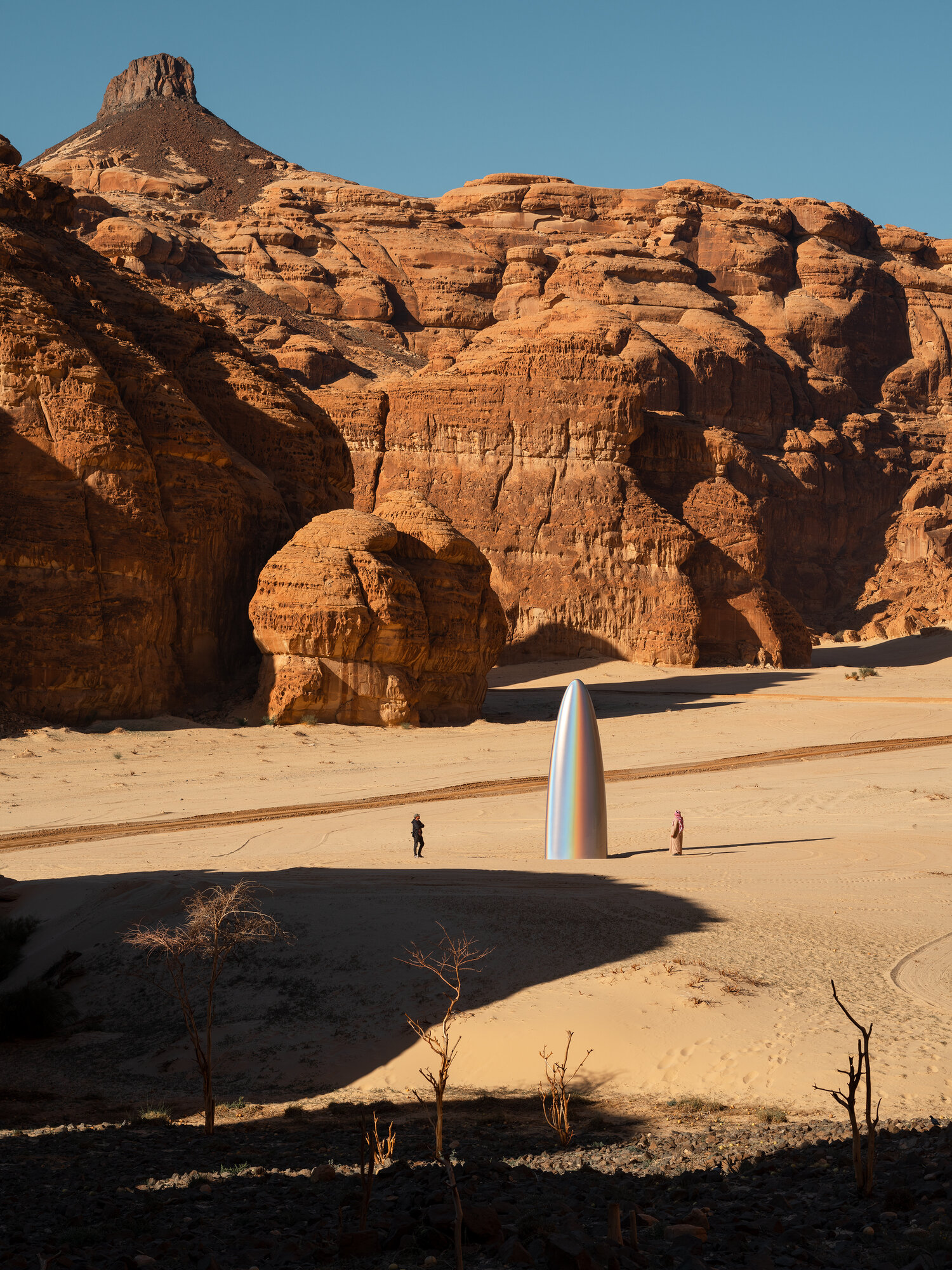 The Future is Now draws a subtle comparison between human time and geological time. Exploring through juxtaposition, the work encourages a humble sense of perspective and appreciation of the expanse of history from a non-anthropocentric perspective. It creates opportunities for dialogue beyond geographical boundaries, focusing on universal planetary concerns as it looks to the future. Within the arresting desert environment of AlUla, The Future is Now, the latest of her Parabolic Monolith series, stands as a beacon of transformation, renewal, and hope, adding even greater dimensions to the already culturally rich history of this spectacular geological location.
