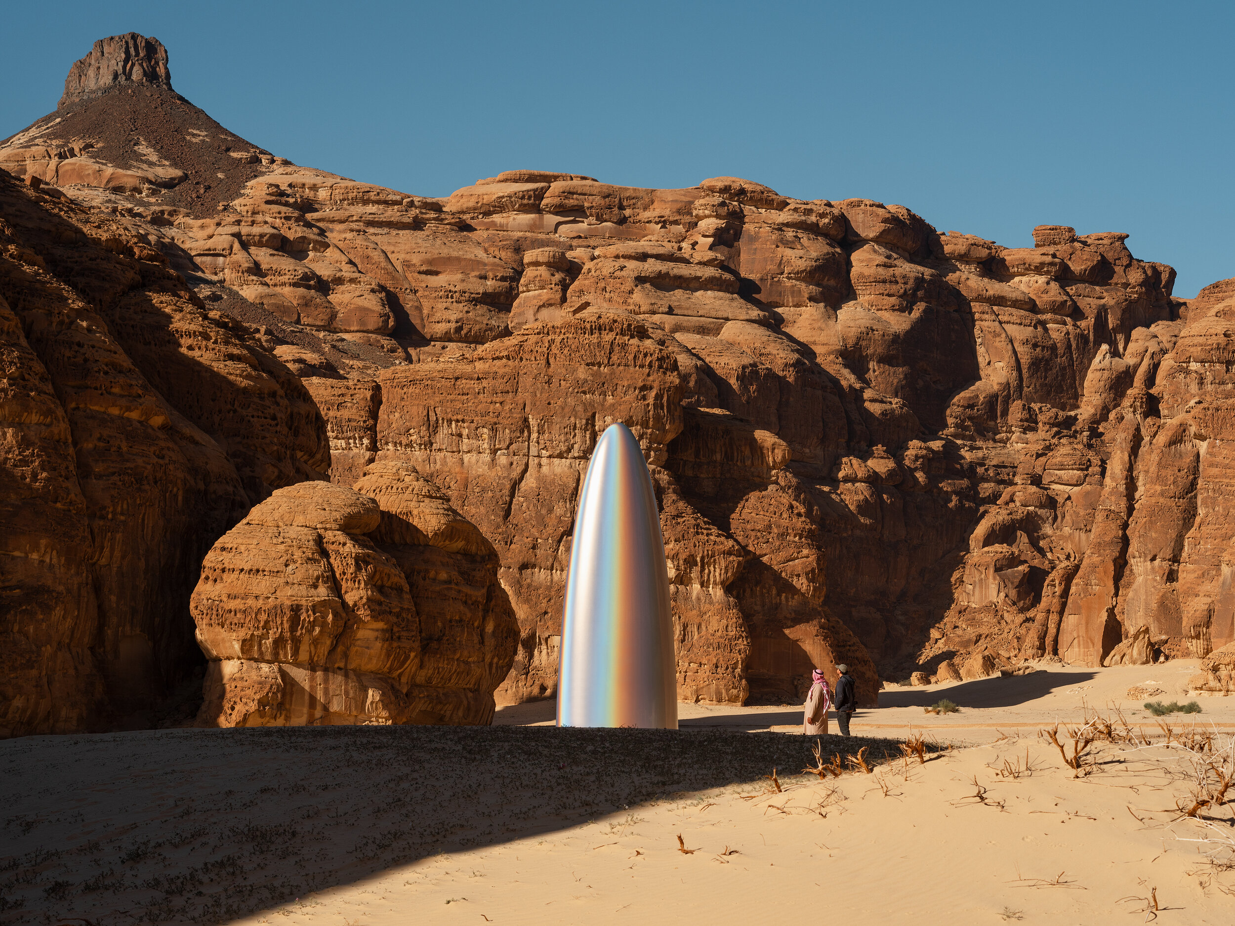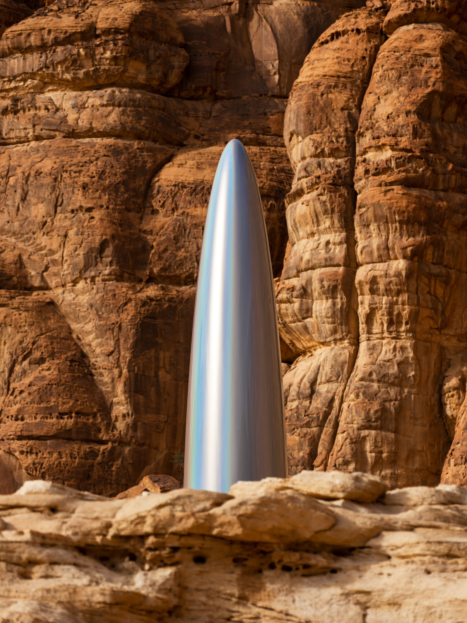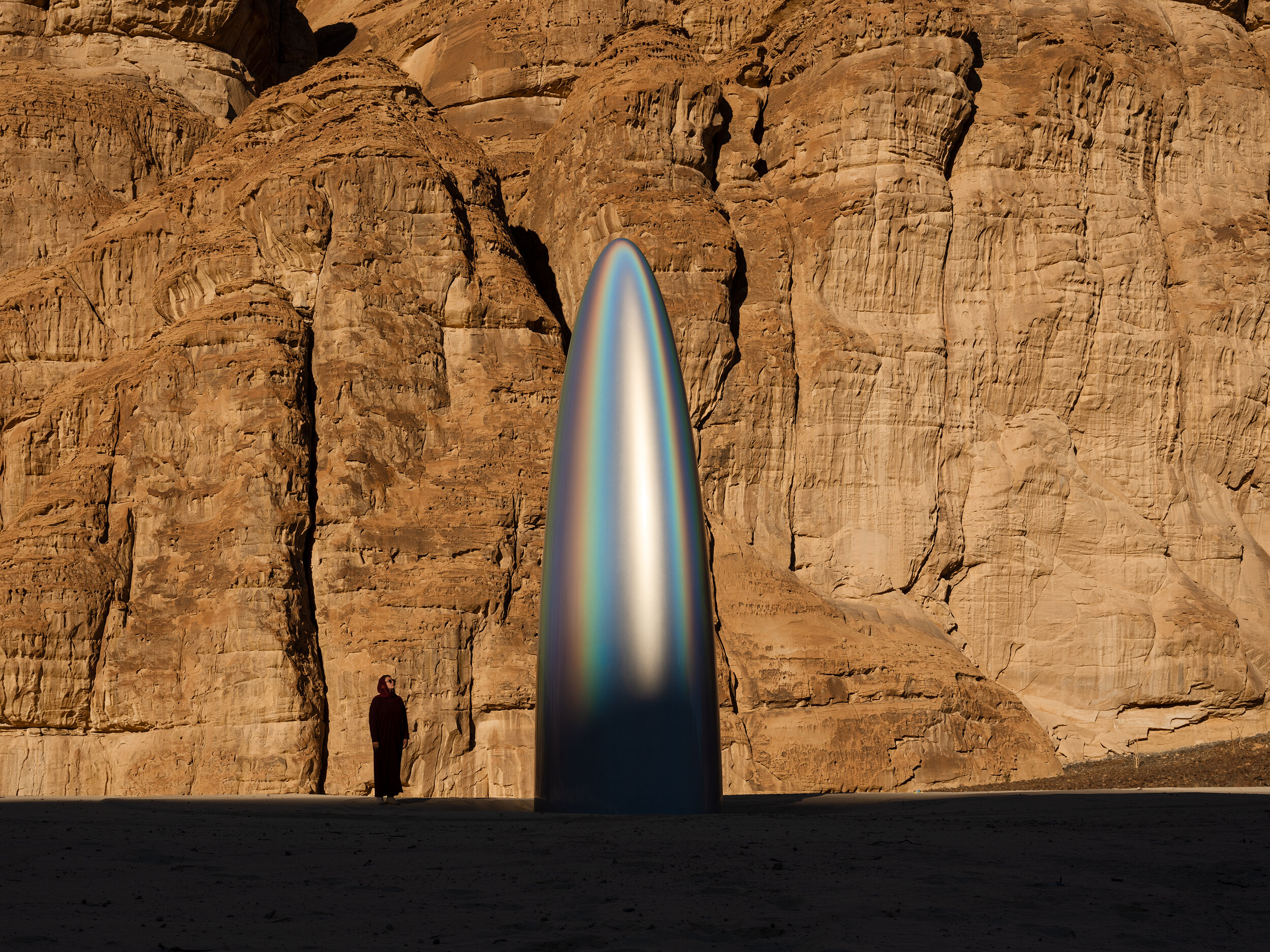 The Future is Now draws a subtle comparison between human time and geological time. Exploring through juxtaposition, the work encourages a humble sense of perspective and appreciation of the expanse of history from a non-anthropocentric perspective. It creates opportunities for dialogue beyond geographical boundaries, focusing on universal planetary concerns as it looks to the future. Within the arresting desert environment of AlUla, The Future is Now, the latest of her Parabolic Monolith series, stands as a beacon of transformation, renewal, and hope, adding even greater dimensions to the already culturally rich history of this spectacular geological location.
