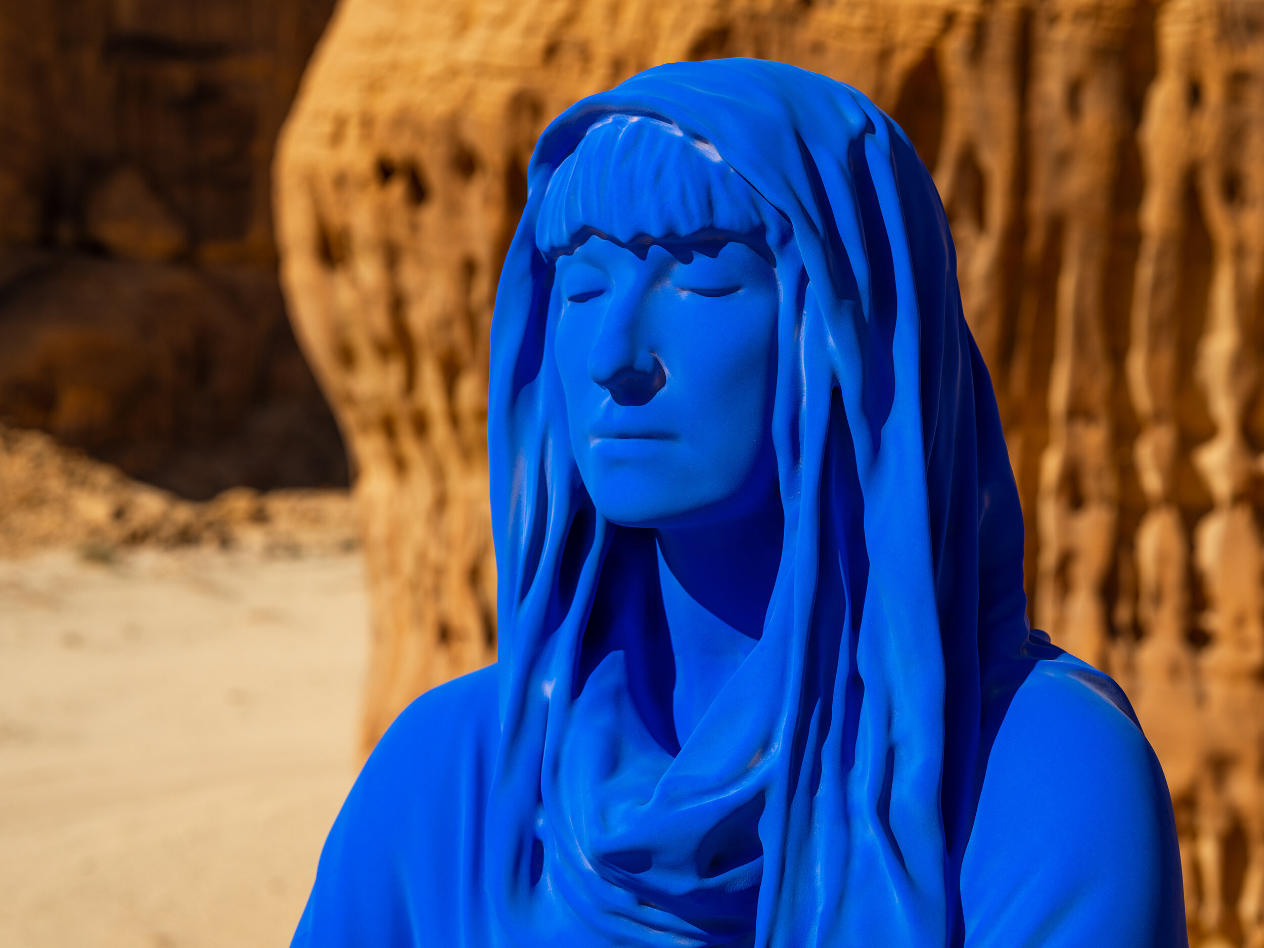 Albuquerque had the idea of Elyseria many years ago and has told the story in a series of vignettes – massive installations of the figure set in distinctive locales across the world. Each place becomes a stage set where the narrative of light, the stars, and collective knowledge is explored and evolved into a character myth. She creates Elyseria in striking ultramarine blue pigment that is reminiscent of the expanse of the cosmos, embodying the mythic figure as a way of welcoming her wisdom and her story.