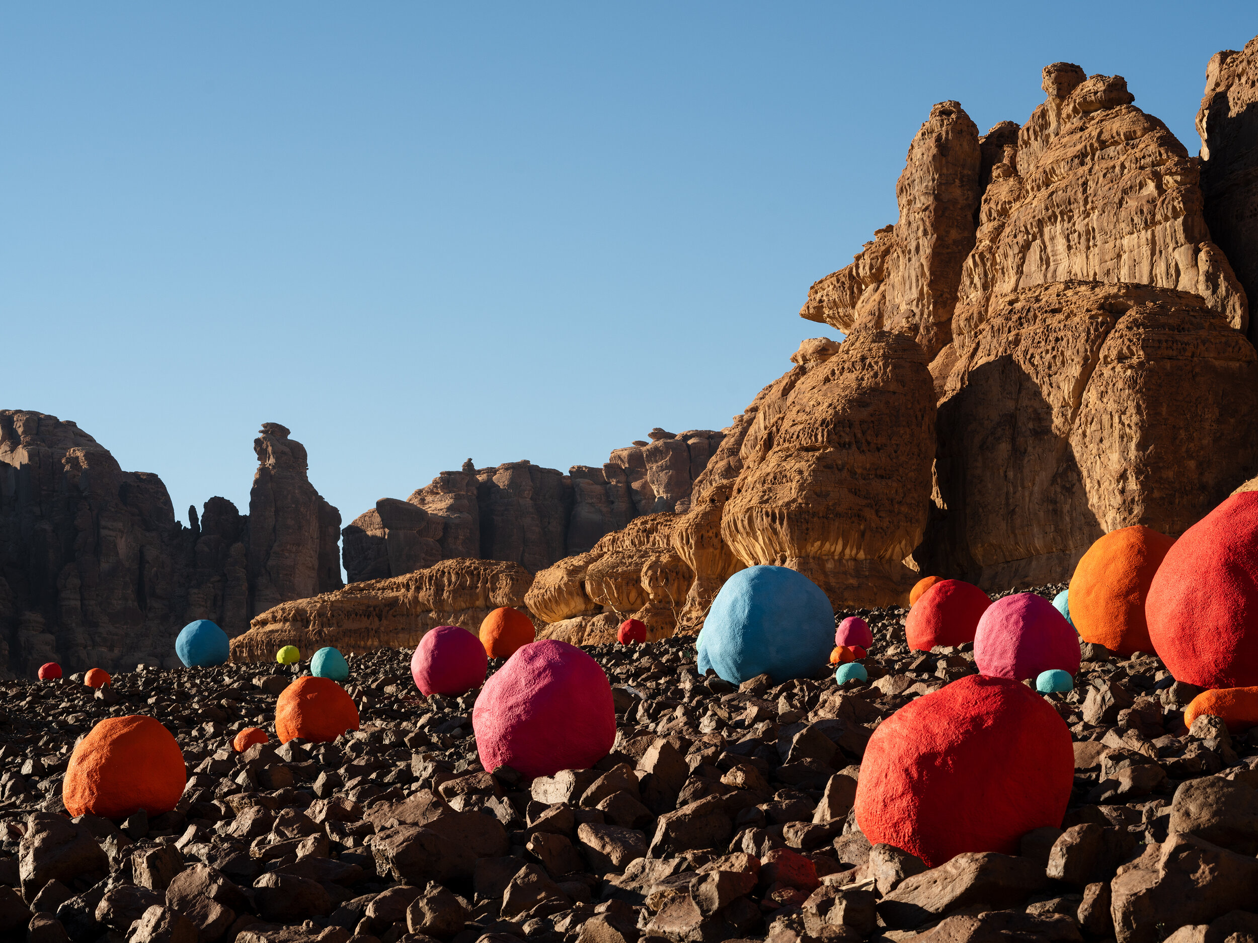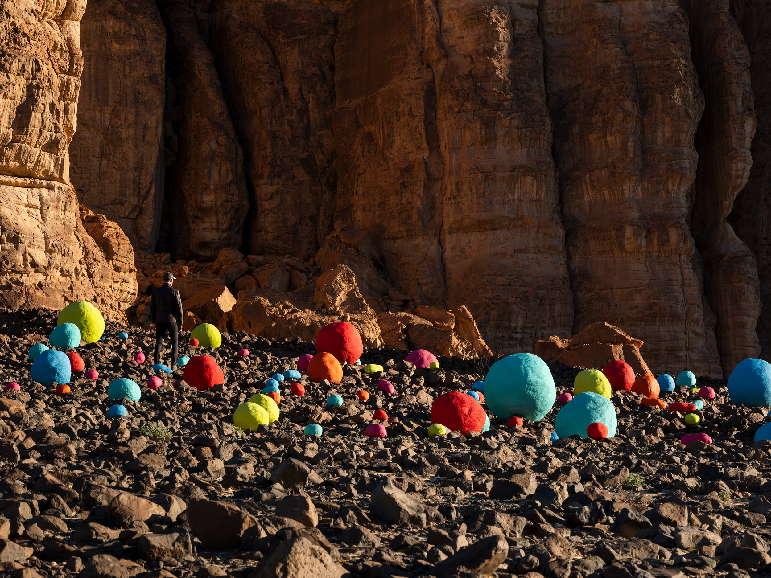 Falling Stones Garden is a site-specific installation composed of 320 sculptures that vary in size and hue, inspired by the natural rockfall at the base of the sandstone cliffs surrounding the exhibition dvalley in AlUla. Ibrahim discerns an abundance of color in the rocks around the installation, even though this isn’t necessarily perceptible at first sight. Initially, it is easy to anticipate the landscape as monotone; the vibrant palette of the installation challenges this, guiding the viewer to pick up on the multiple different hues of the rocks. The work reframes a relationship to the landscape as it instigates new appreciation and sensitivity. By demonstrating the flaw to be in our ability to look attentively, we are prompted to look again at all the landscape offers. Within these visual cues, the multitude of history and time can be gleaned.