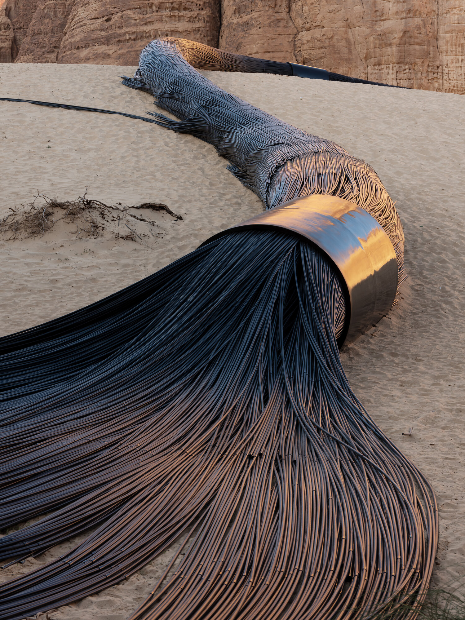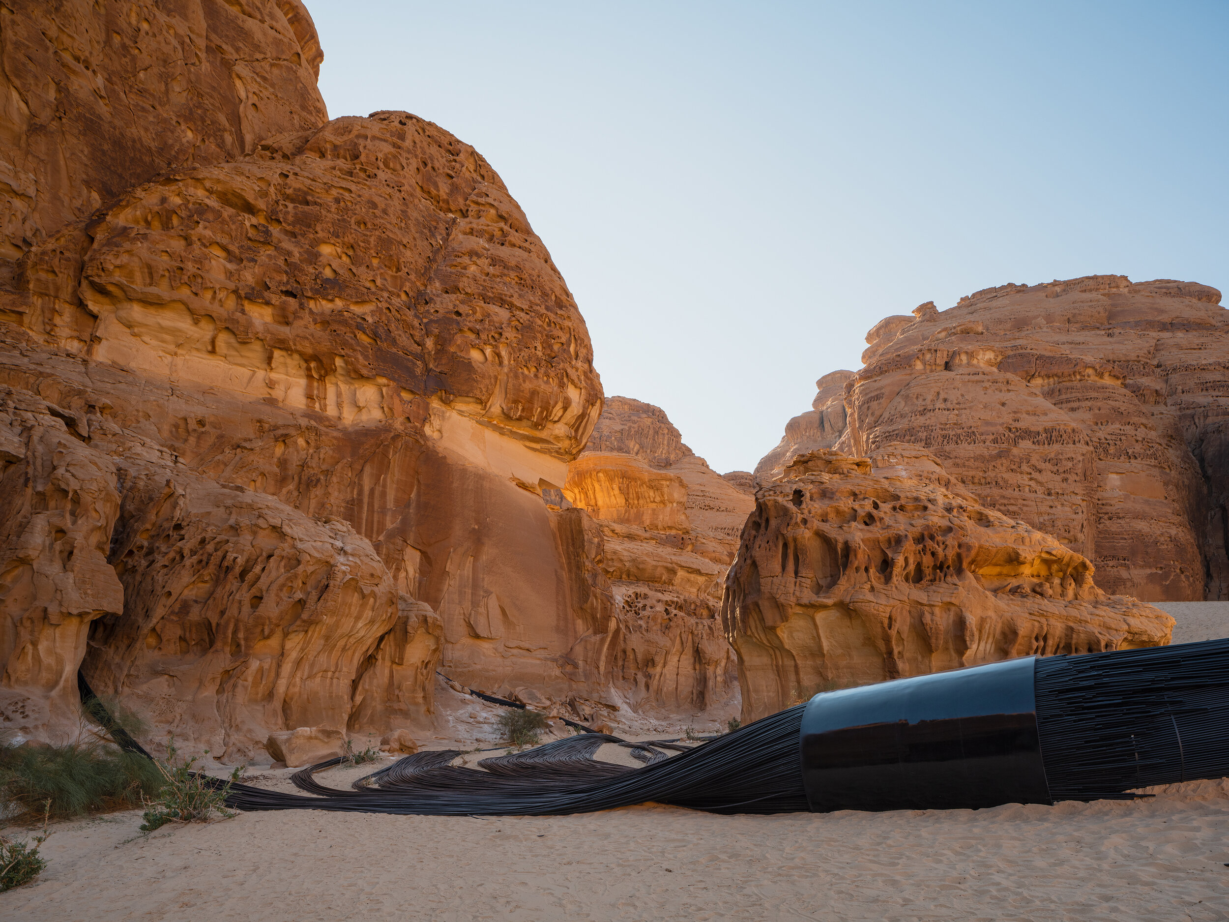 Using plastic pipes, a byproduct of the petroleum industry and a material the artist has been exploring in recent works, Shono repurposes this easily discarded material to draw the single line that forms the basis of this work; a line that creates versus a line that destroys, a line that draws you in rather than keeps you at a distance. He uses the pipes in the desert as one would ink on paper, effectively drawing on site – a sculptural sketch in the desert.