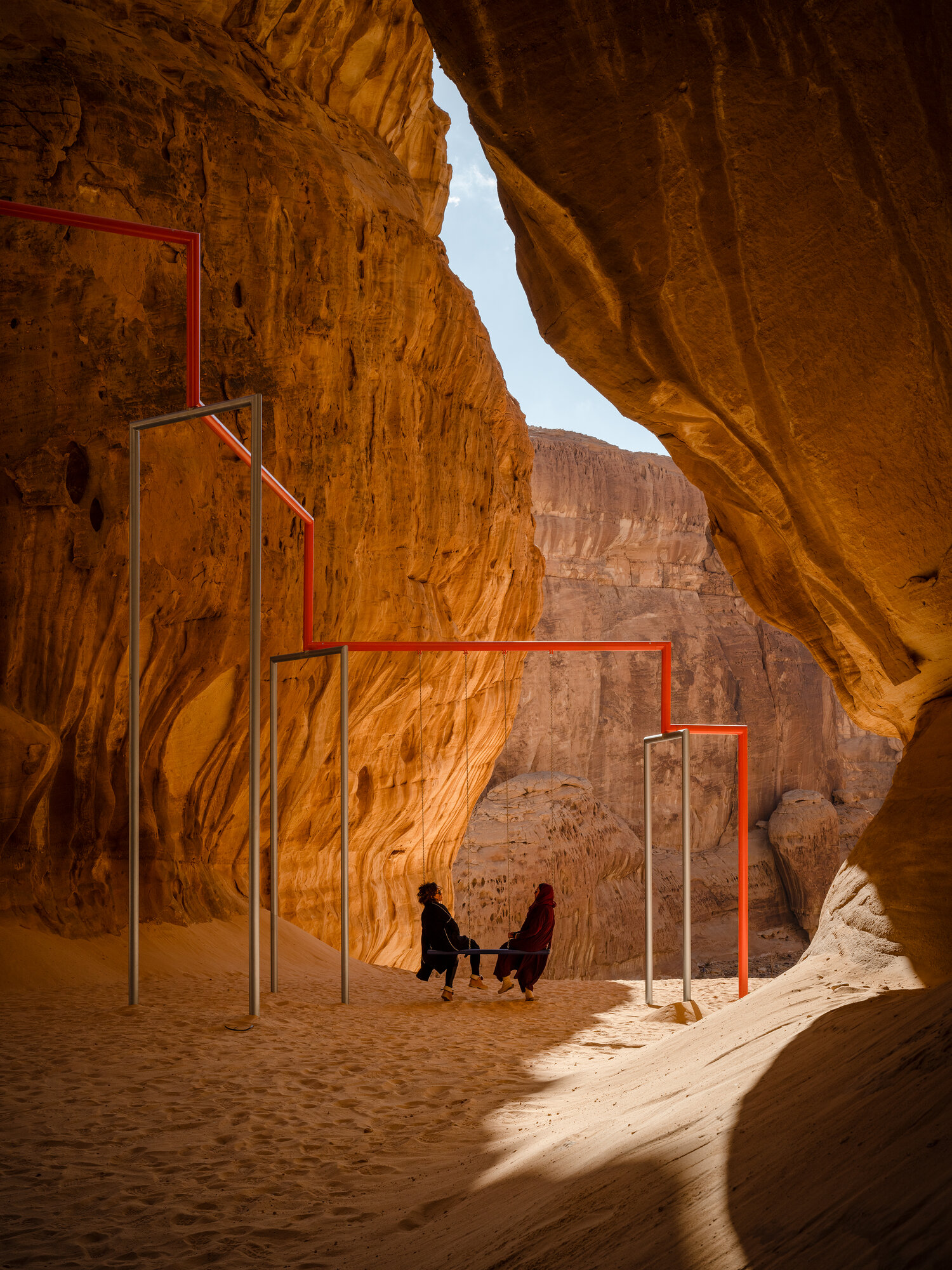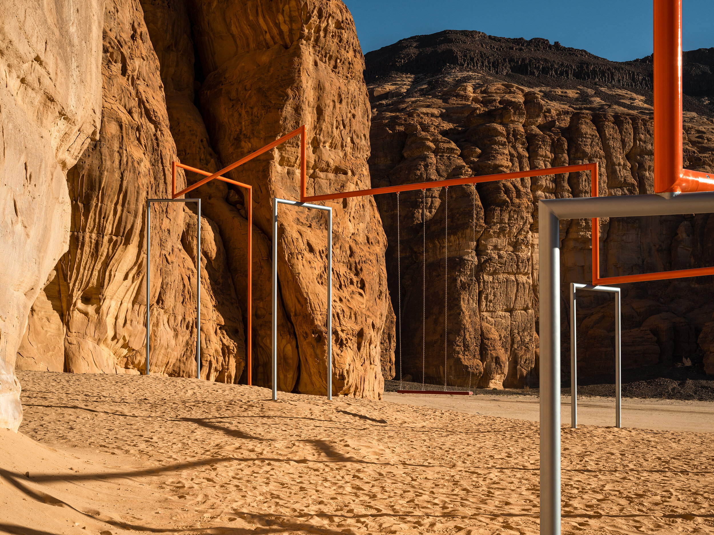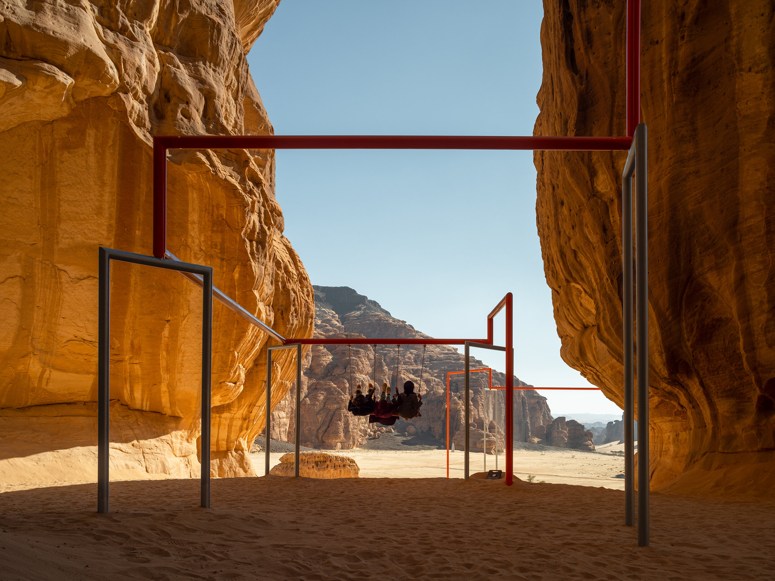 First installed at the Tate Modern Turbine Hall in 2017, various site-specific installations of the swing-set continue to be created in a great diversity of contexts, such as AlUla in Saudi Arabia, the DMZ area in South Korea and Vordingborg in Denmark. The color-scheme of the swings themselves represents the specific colors of the national currency of the country in which the swings are installed. Over time, the work will evolve as the orange support continues to grow and new swings are added into the wider world.