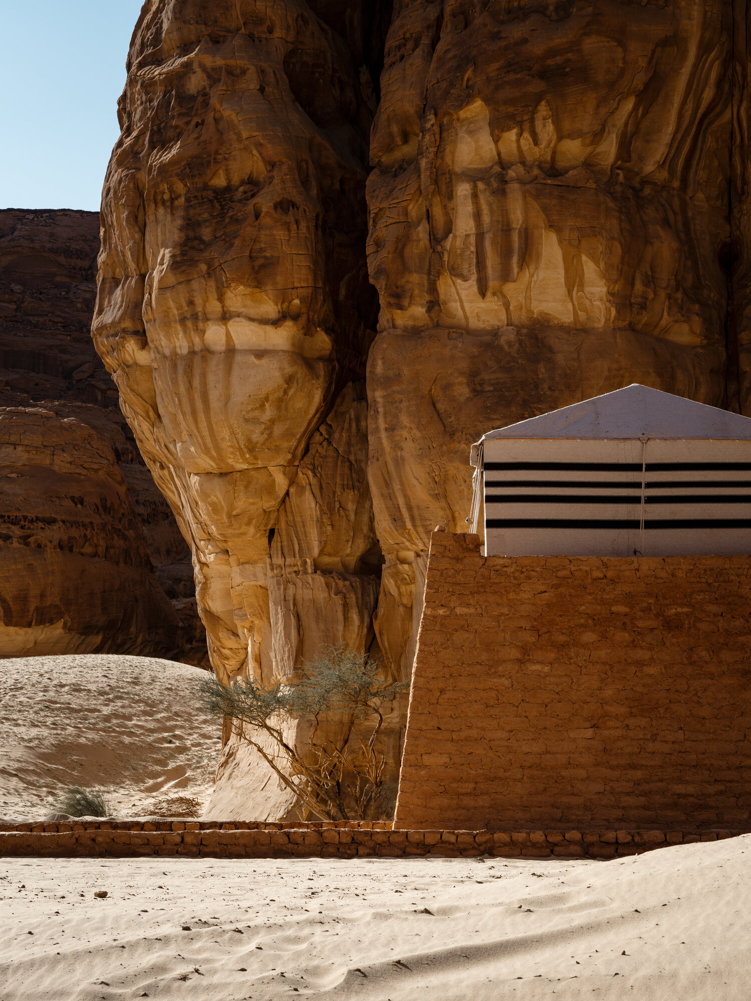 The mountainous landscape in AlUla forms a backdrop for Shawky’s video work that is derived from Dictums: Manqia I – the film is inverted, rendered in negative and re-oriented in portrait mode. In the film, a herd of prize black camels or majahims glides across desert sand dunes towards an unknown destination. These prized majahims originate from Saudi Arabia and their procession across the mountain range (and towards the sky) creates a surreal landscape. With the film in negative, the majahims transform into bodies of light and appear ghost-like; their spirits returning to their original home.