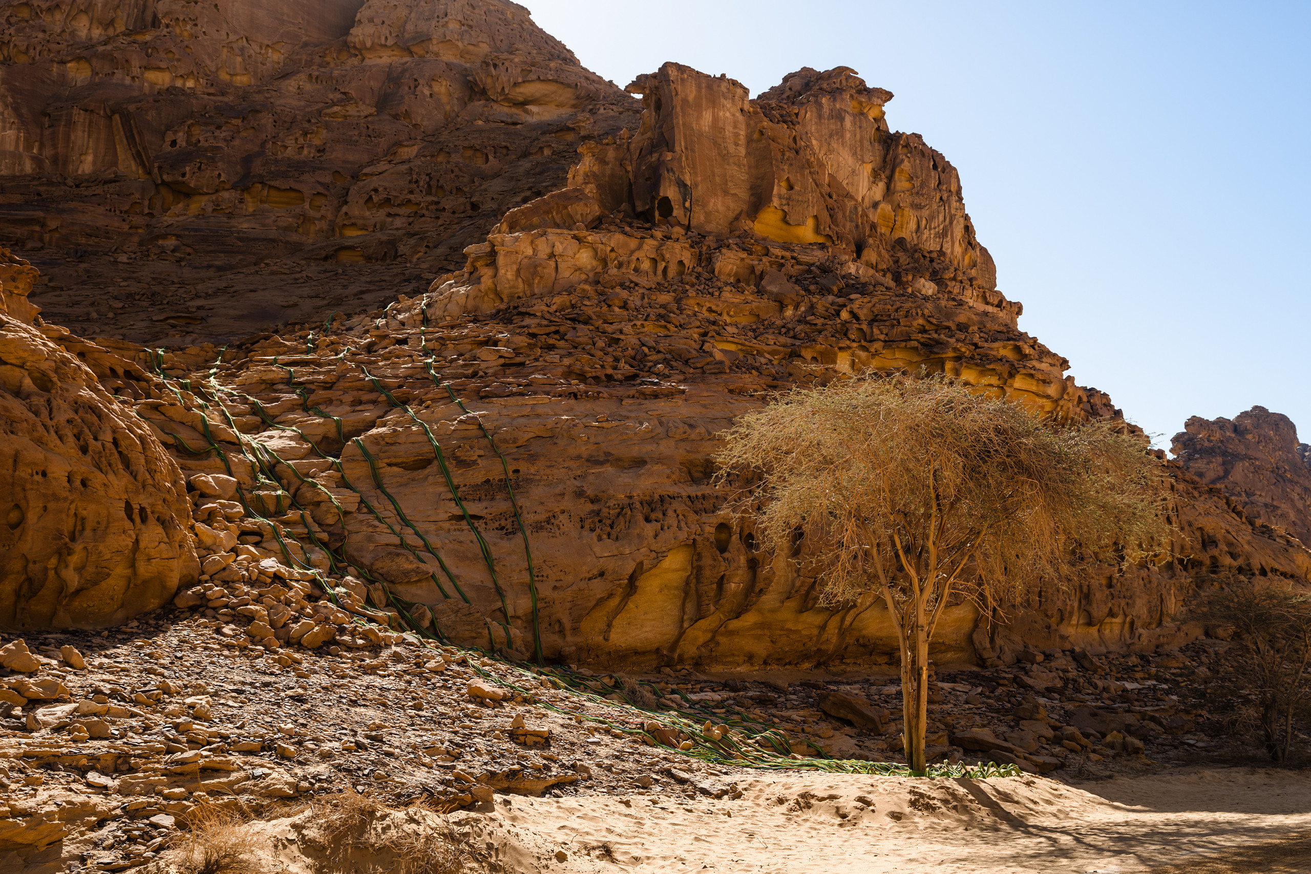 The Valley of the Desert Keepers is composed of sonic and sculptural elements, delivering an immersive experience for visitors to the valley. This installation grew out of Zedani’s fascination with the parasitic plants of the Arabian desert, particularly the plant family Cistanche tubulosa, which, during the rainy seasons, can be found in abundance near the tombs of Hegra, the once vibrant city of the ancient Nabataeans. These plants rely on horizontal gene transfer—a process through which the parasitic plants acquire the genes of host plants to ensure the survival of their own offspring. As such, their genomes contain an archive of the botanical history of the desert and, potentially, the keys to a livable future.