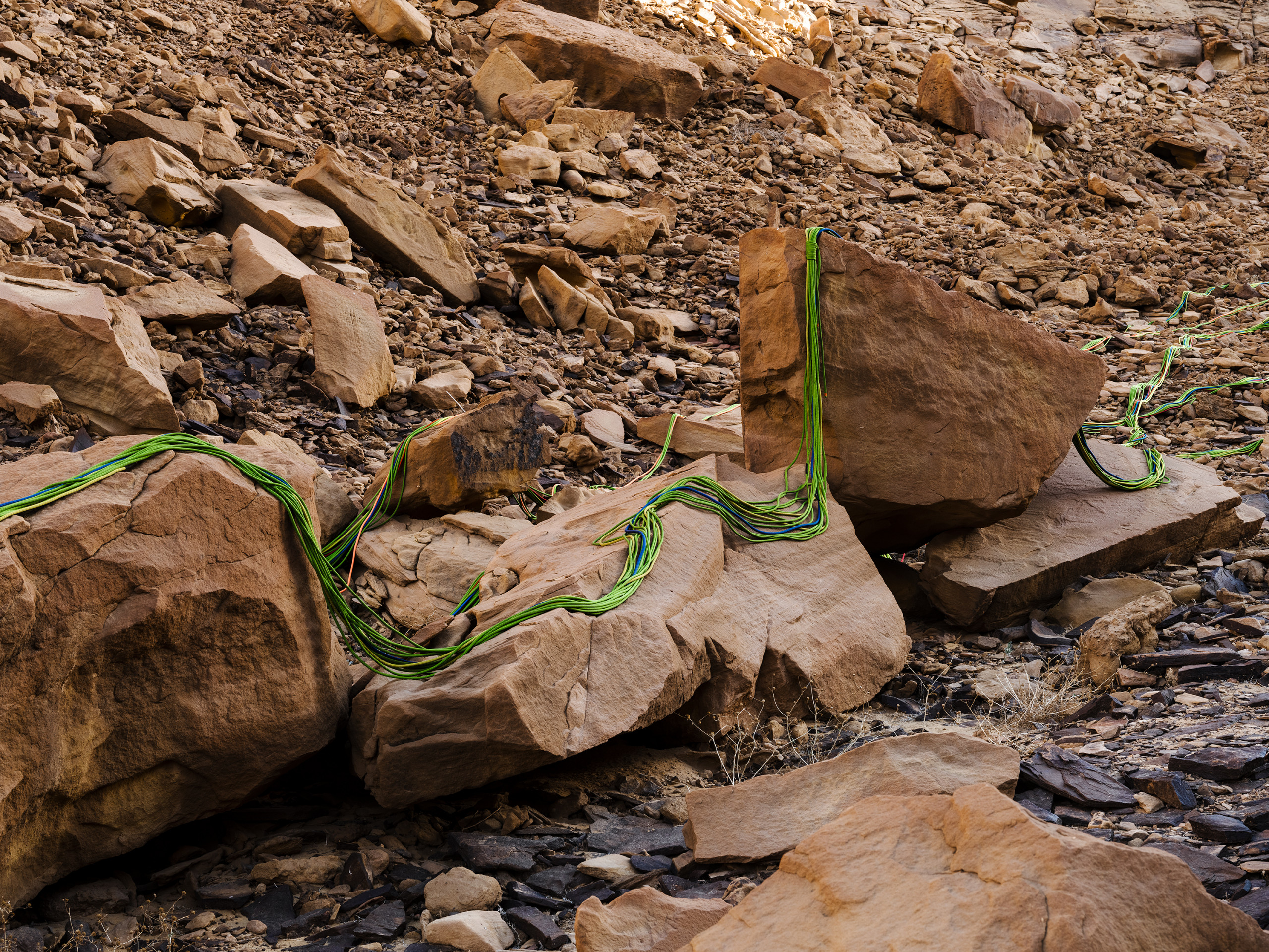 The installation is comprised of various elements, including horizontal sculptural wires and a multichannel audio projection. The audio component combines a comprehensive narration of all the desert flora in Arabic with an echo, produced by the visitor’s own footsteps and amplified via microphones. At the site of the installation, a single Acacia tree sitting near an opening in the site slowly becomes the host plant, and an icon for the project – meaning the work becomes at once anchored by, and an ode to, this fascinating flora.