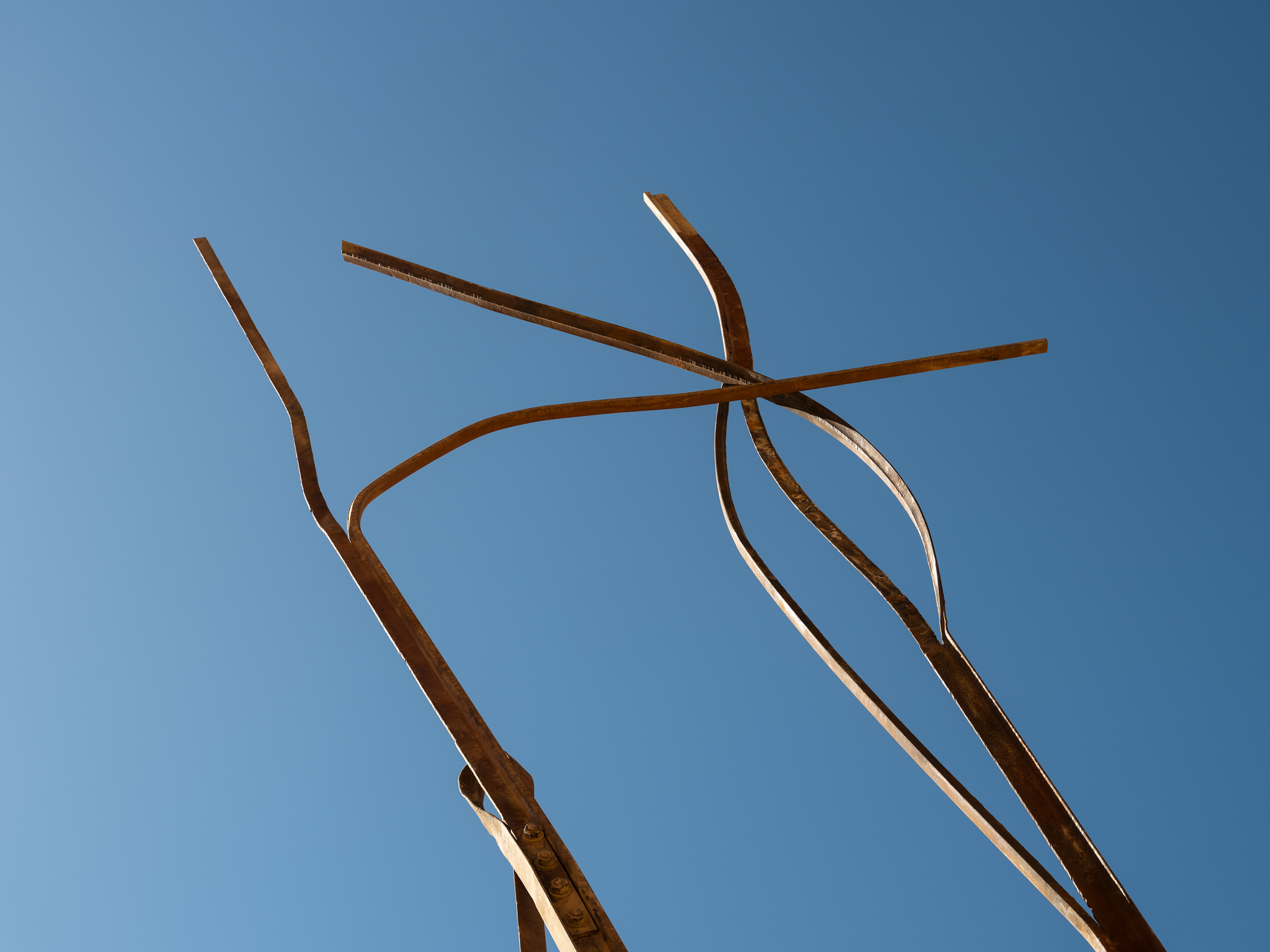 Silent Witnesses of the Past pays homage to the memory of the Hijaz railway. The form is constructed from rusted scavenged rails placed in an upright position, each split from the top with the ends twisting towards the ground. It exists as a singular monument in the wadi, or flood plain, of an abstract oasis, inviting visitors to wander through it and inspiring a calm moment of contemplation of the present and past, evoking the footsteps of those who have come before and will come after.