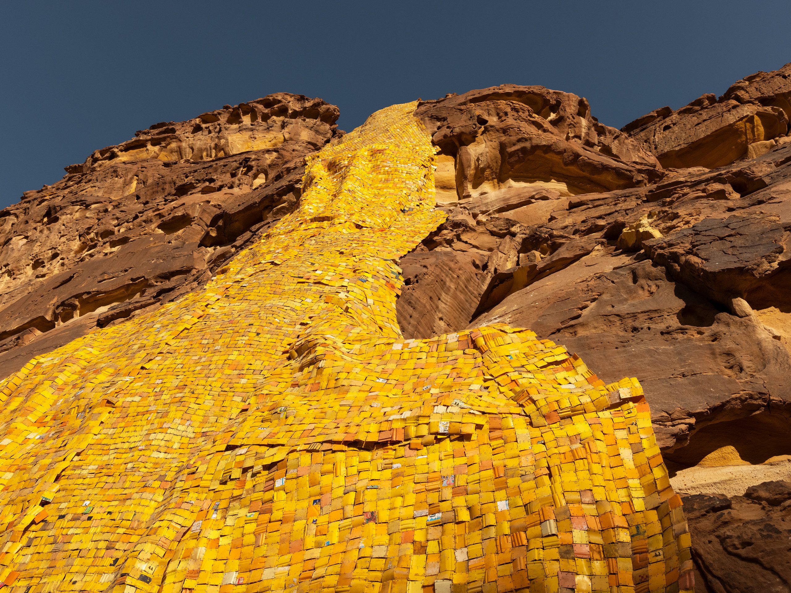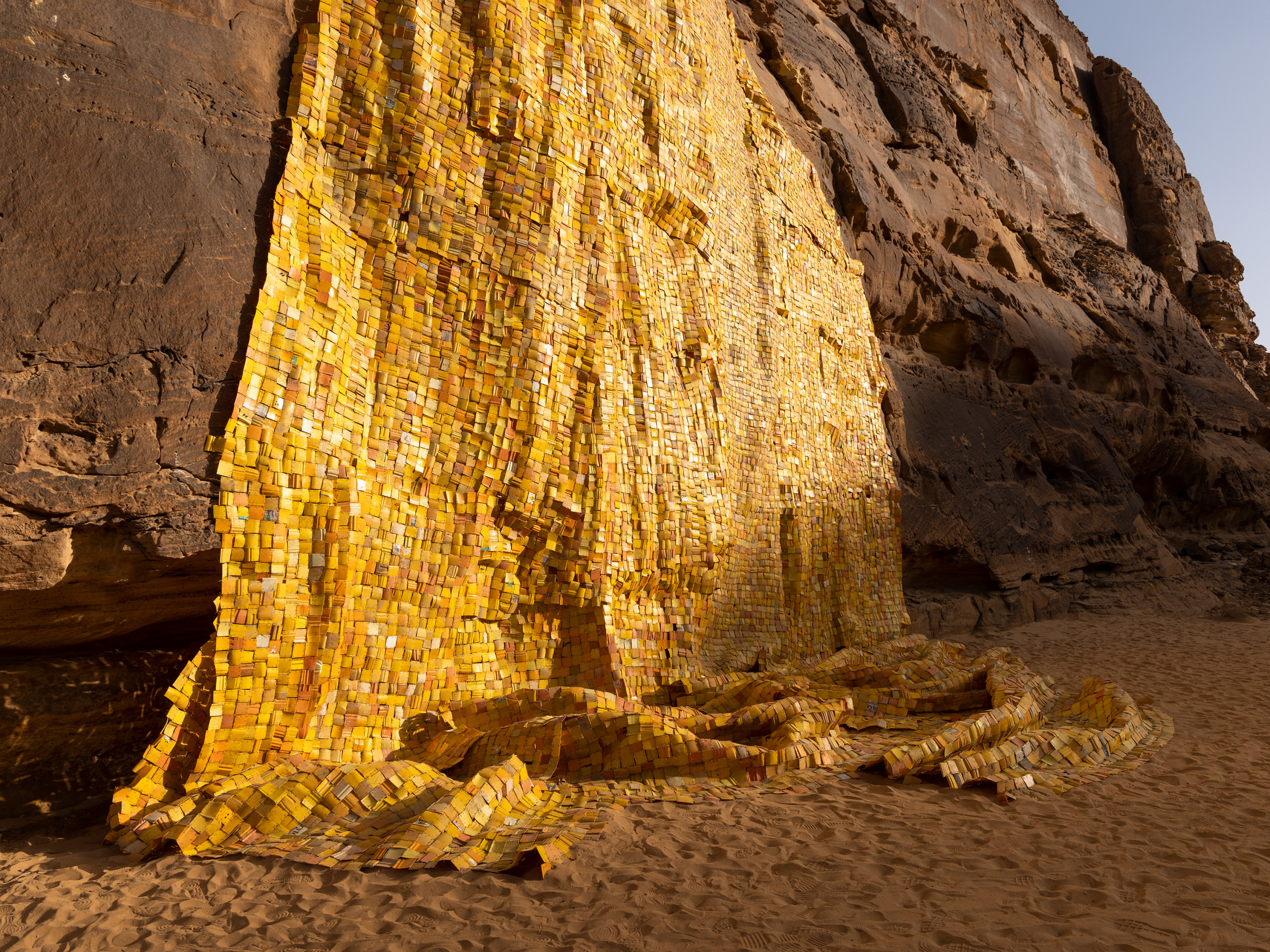 Through cutting, drilling, stitching, and melting materials, Clottey’s installations are bold assemblages that act as means of inquiry into global consumption, climate change, and the languages of form and abstraction. Gold Falls expounds on a through line in his practice, with the yellow plastic fragments constructing an aurulent mirage draped along the desert rock surfaces in the canyon valleys of AlUla. It appears as a waterfall unfolding and cascading on the rocks, both in mimicry and dissonance. Its golden yellow shining on these cliffs is simultaneously representative of the wealth and the lack of it within this bereft yet naturally resplendent place.
