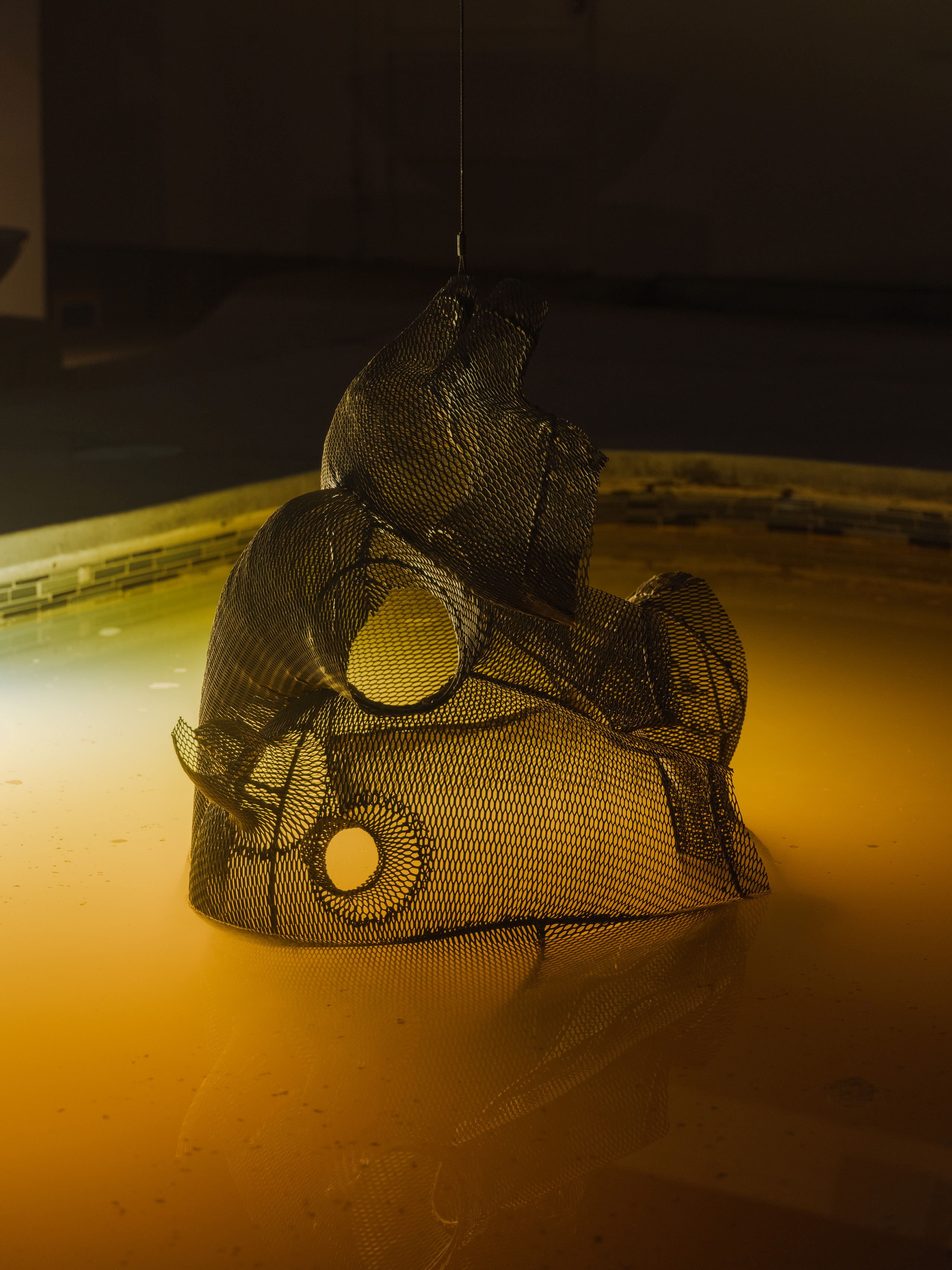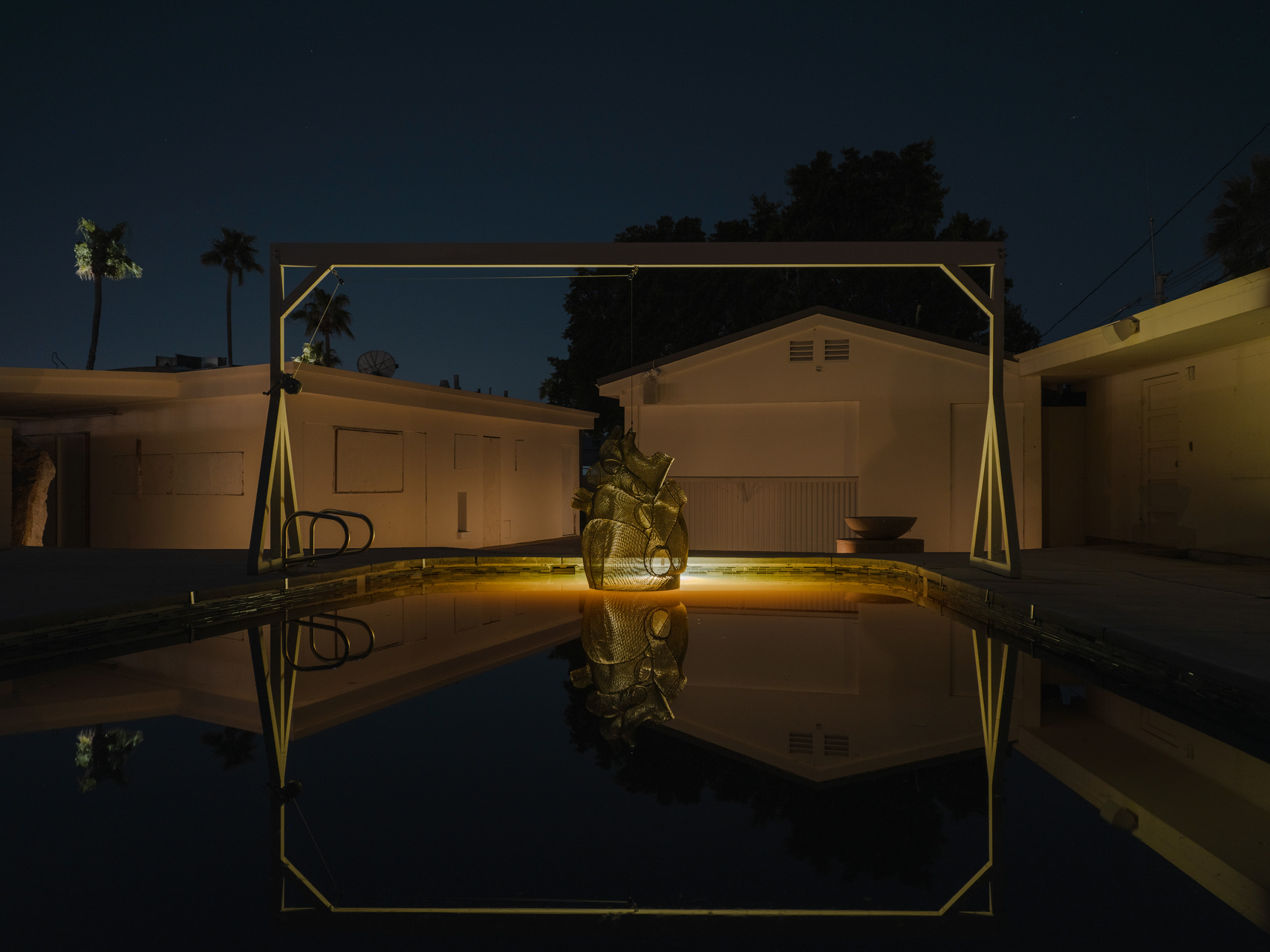 Bon and Metabolic Studio have created a poetic object that submerges visitors in the deep past and the distant future, taking inspiration from plants, which metabolize sunlight into energy, and the blue whale, the largest animal known to have lived on Earth. Fueling the potential for future life and visually transforming itself in the process, the work, which merges swimming pools in a landscape associated with tremendous water shortage, with water and fish-bone skeleton “sand” from the Salton Sea, reminds us not only of the imperative for artists to create at the same level as society’s capacity to destroy, but also of our own connection to water and that the desert was once a sea. A lace-like steel sculpture of a to-scale blue whale heart is submerged in a pool pumped full of Salton-Sea water, but rather than stand as a harbinger of death, the sculpture metabolizes and creates energy and clean water that it deposits back into the atmosphere, fueling the potential for future life across the run of the exhibition and visually transforming itself in the process.