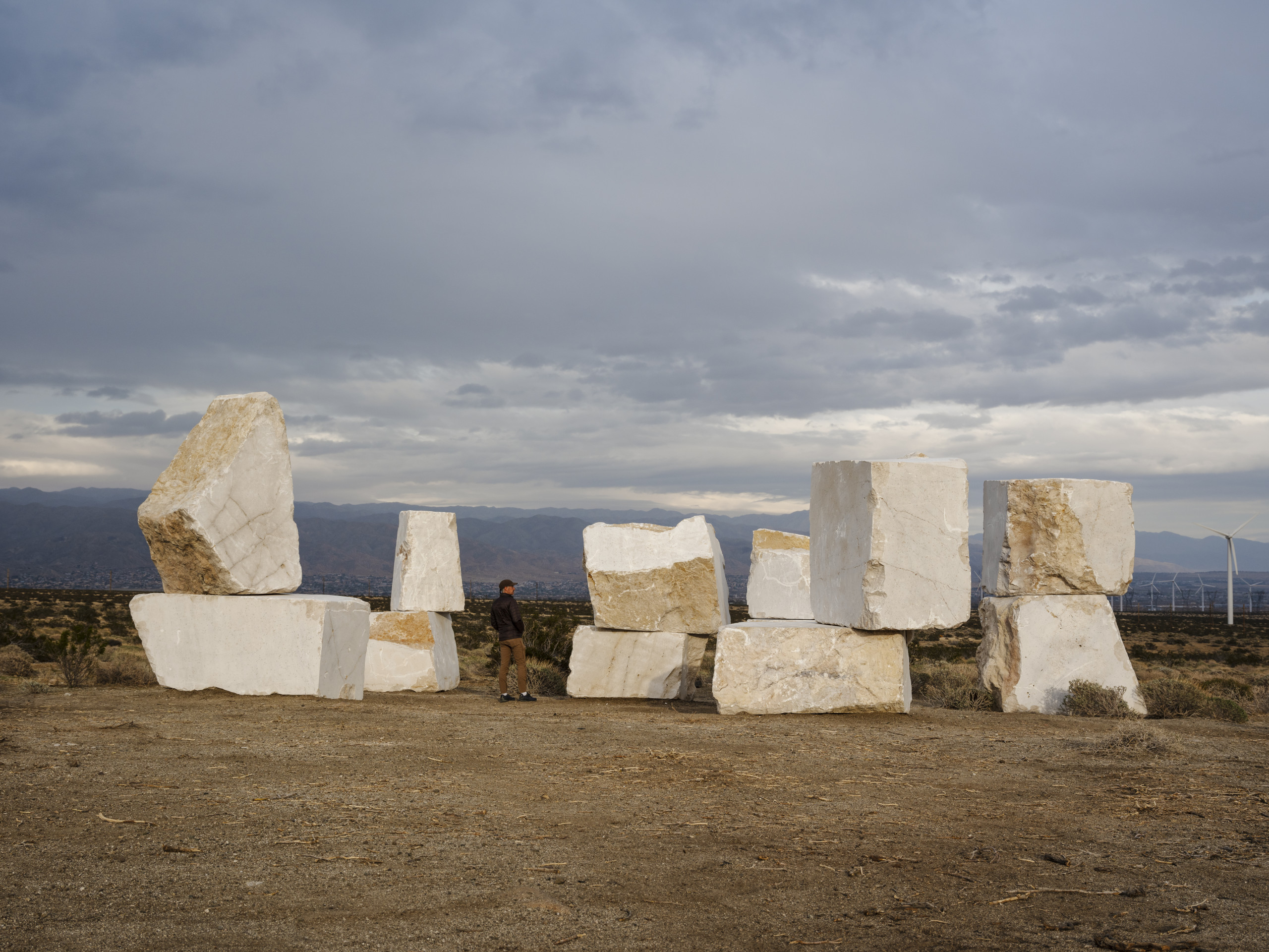 Material density, gravity, and time are central to most of Jose Dávila’s practice. Known for sculptures that explore different balances created by opposing forces, Dávila has created a work for Desert X 2025 that spans both space and time. The marble blocks used in this piece are unaltered extractions from a quarry a few hundred miles across the U.S.–Mexico border.