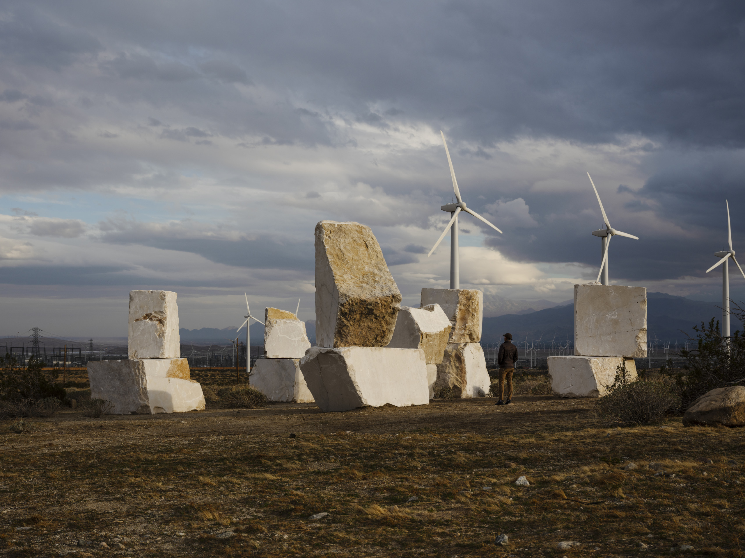To reach their new home in the Coachella Valley, the stone blocks had to cross the border. In this migration, they also traversed a metaphorical border between the seen and the unseen. Appearing as if from nowhere, Dávila’s casually stacked marble blocks appear splintered across both time as well as space. Moved by the invisible forces of unknown histories, they evoke the archeological relics of ancient civilizations and the potential future of life beyond our own.