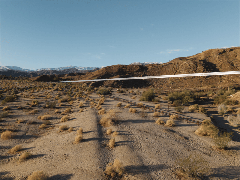 The effect is disorienting. As the oscillating line strives to assert its presence, it blurs our sense of spatial perception, scale, and distance in its kinetic dance. Wind, weather, and ambient light amplify this seemingly arbitrary choreography, transforming it into an environmental condition. This phenomenon evokes the flicker of endless desert horizons, where hard lines dissolve in the heat haze, continuously softening and reforming before our eyes.