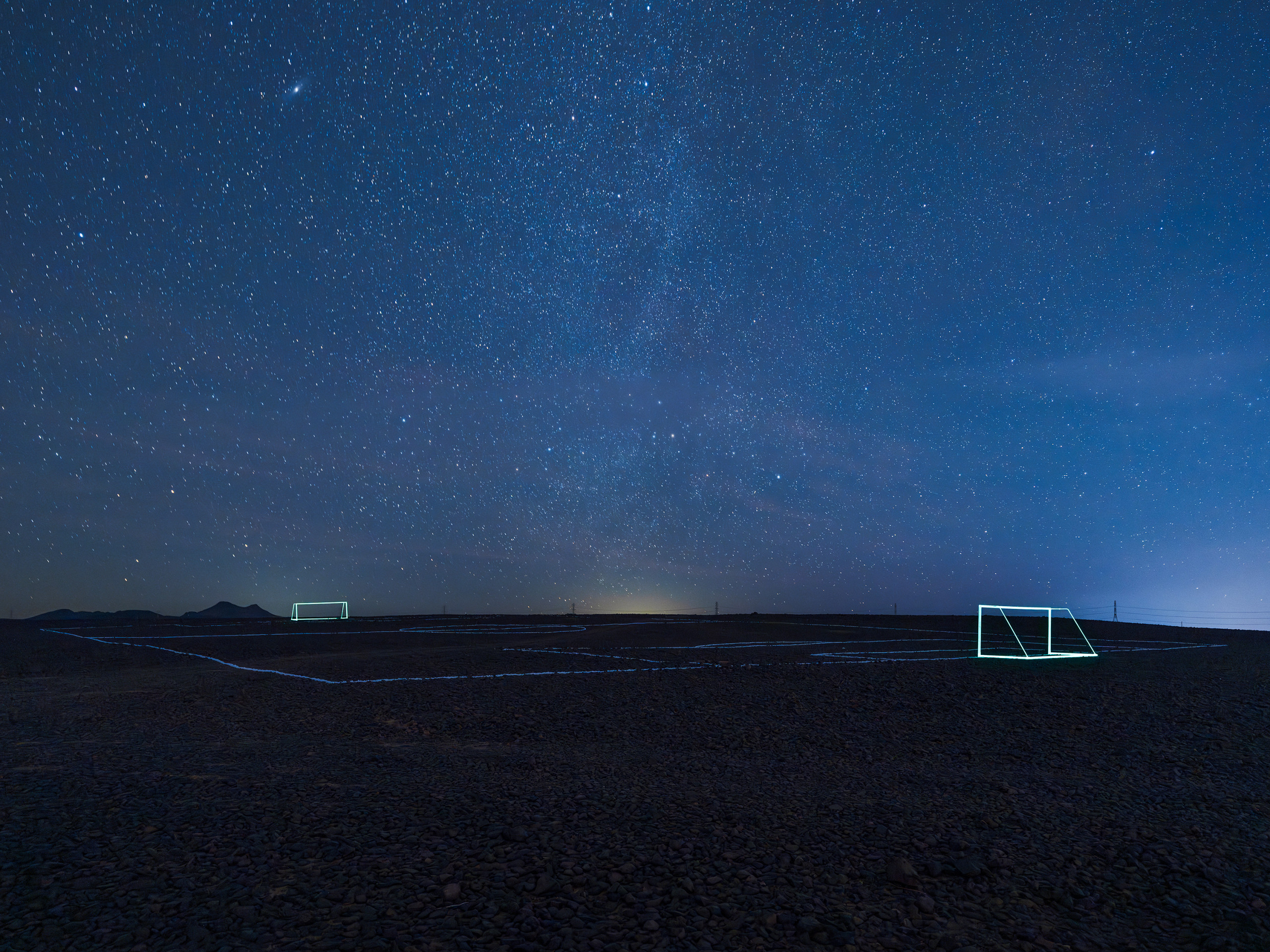 A football field in a remote rocky area is a mysterious and suspicious presence, and represents a provocation to the collective memory. It attracts one’s attention and arouses feelings of curiosity; it is a symbol of optimism and social interaction, and a reason for pride and belonging. One is drawn to think about how much team sports represent the desire for survival and, simultaneously, harmony with one’s place of origin; in doing so, one considers their relationship with art and culture. Therefore, Ayman Yossri Daydban’s work is an effort to preserve the continuous flow of existence and is a means to realize diversity through common human heritage. By understanding the geology, anthropology, and archeology of his region, the artist concentrates on possible future perspectives and the aspiration to live in a sustainable way, while protecting the environment and wildlife from disintegration and extinction.