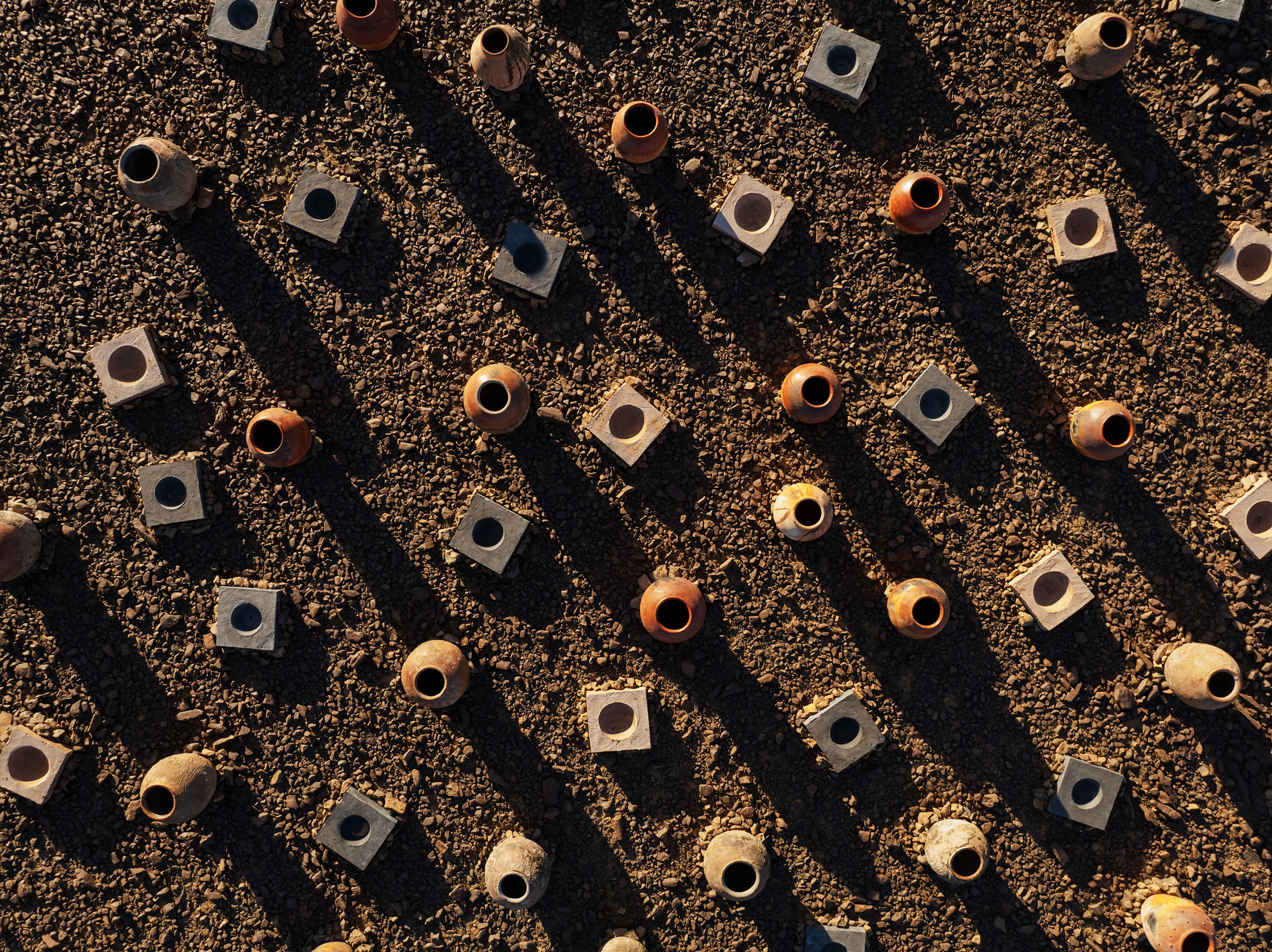 With these works, Ibrahim Mahama asks how we can restore memories we’ve never had before, and how we can use archeology and the scars of history to create new meanings within a landscape. Terracotta pots – everyday objects used to store water in local communities in northern Ghana – are suspended over railway lines. Together with negative forms of pots, they bring out memories of geological forms that frighten the landscape as if new kinds of organic life were emerging. These forms take on different dimensions, almost as if they belonged to the landscape, taking on its sublime colors and textures.
