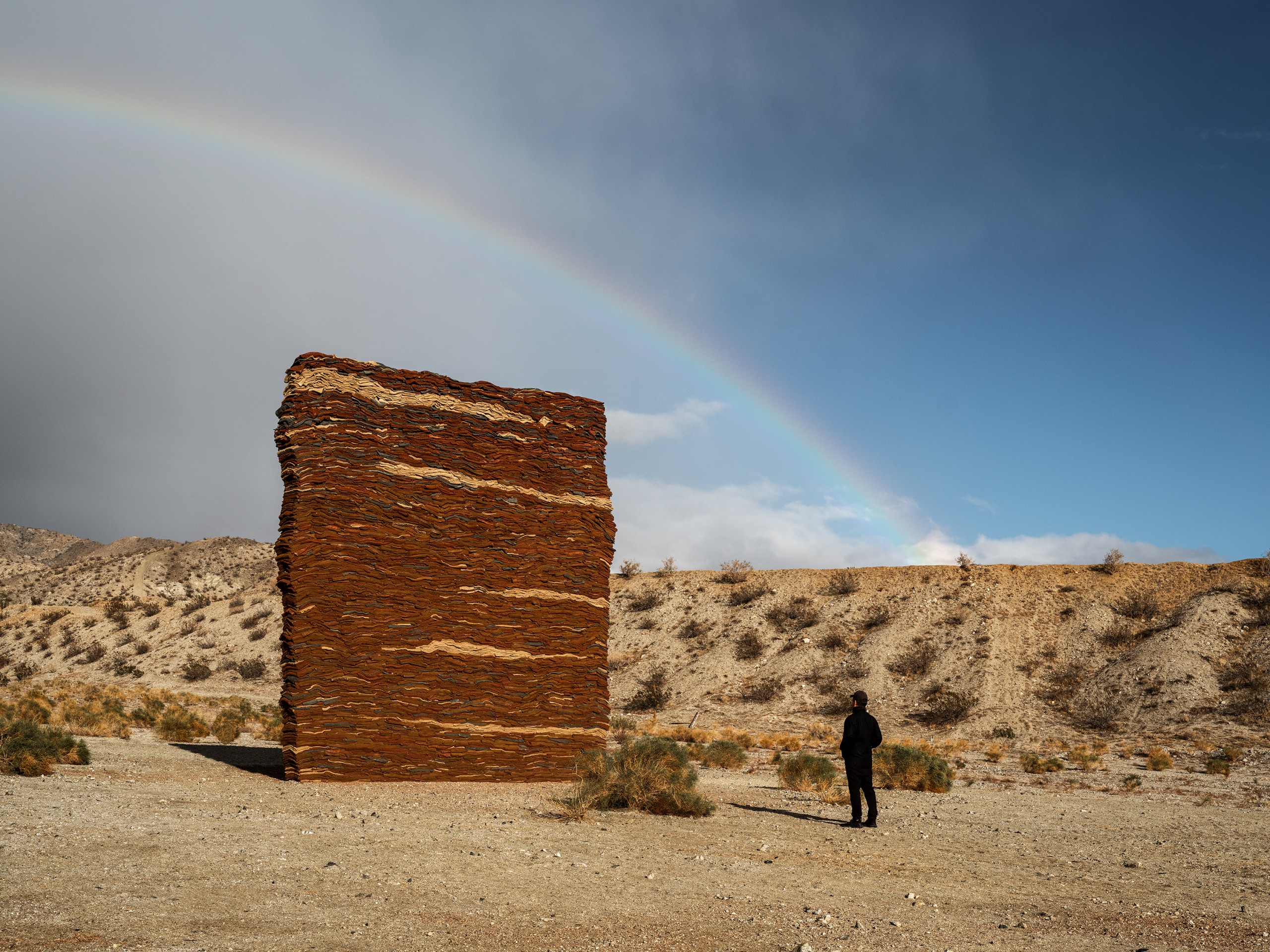 Para Zahrah Alghamdi, el material y la memoria están estrechamente entrelazados. Muchas de sus obras condensan grandes cúmulos de material cual si fuesen estratos superpuestos de historias y culturas de los sitios de donde provienen. Alghamdi creció en Al Bahah, en la región suroeste de Arabia Saudita, y cuando visitó Palm Springs quedó impresionada por la conexión entre los paisajes y las arquitecturas del desierto. Para Desert X, creó una escultura que sintetiza y hace eco a las formas de construcción tradicionales de su país con la organización arquitectónica que encontró en el Valle de Coachella. El resultado toma la forma de un muro monolítico compuesto por elementos apilados, impregnados de cemento, tierra y tinturas específicas de los procesos de edificación de cada región; expresando un lenguaje sumamente personal que atañe a sentimientos, emociones y recuerdos asociados a un lugar y a un tiempo.