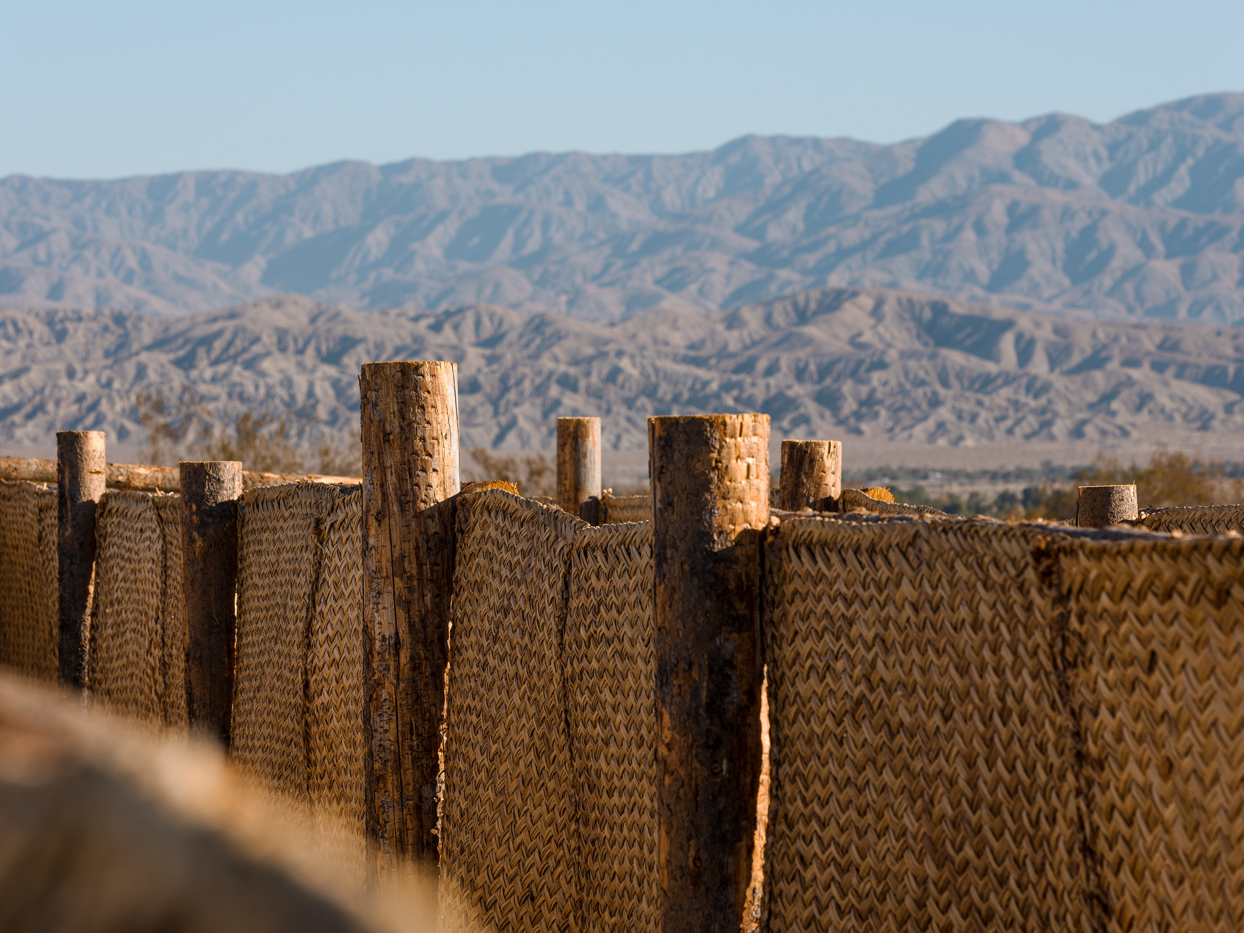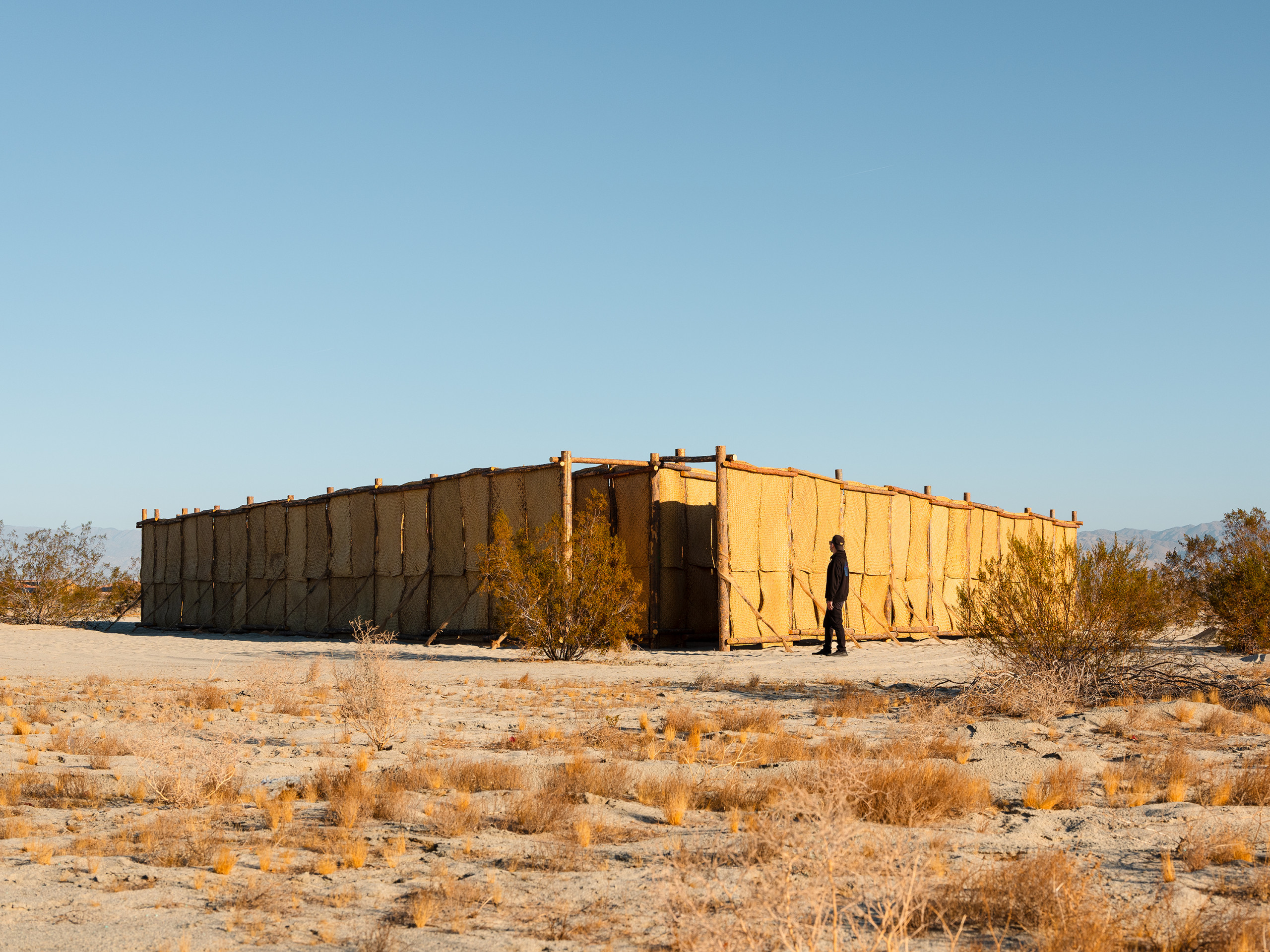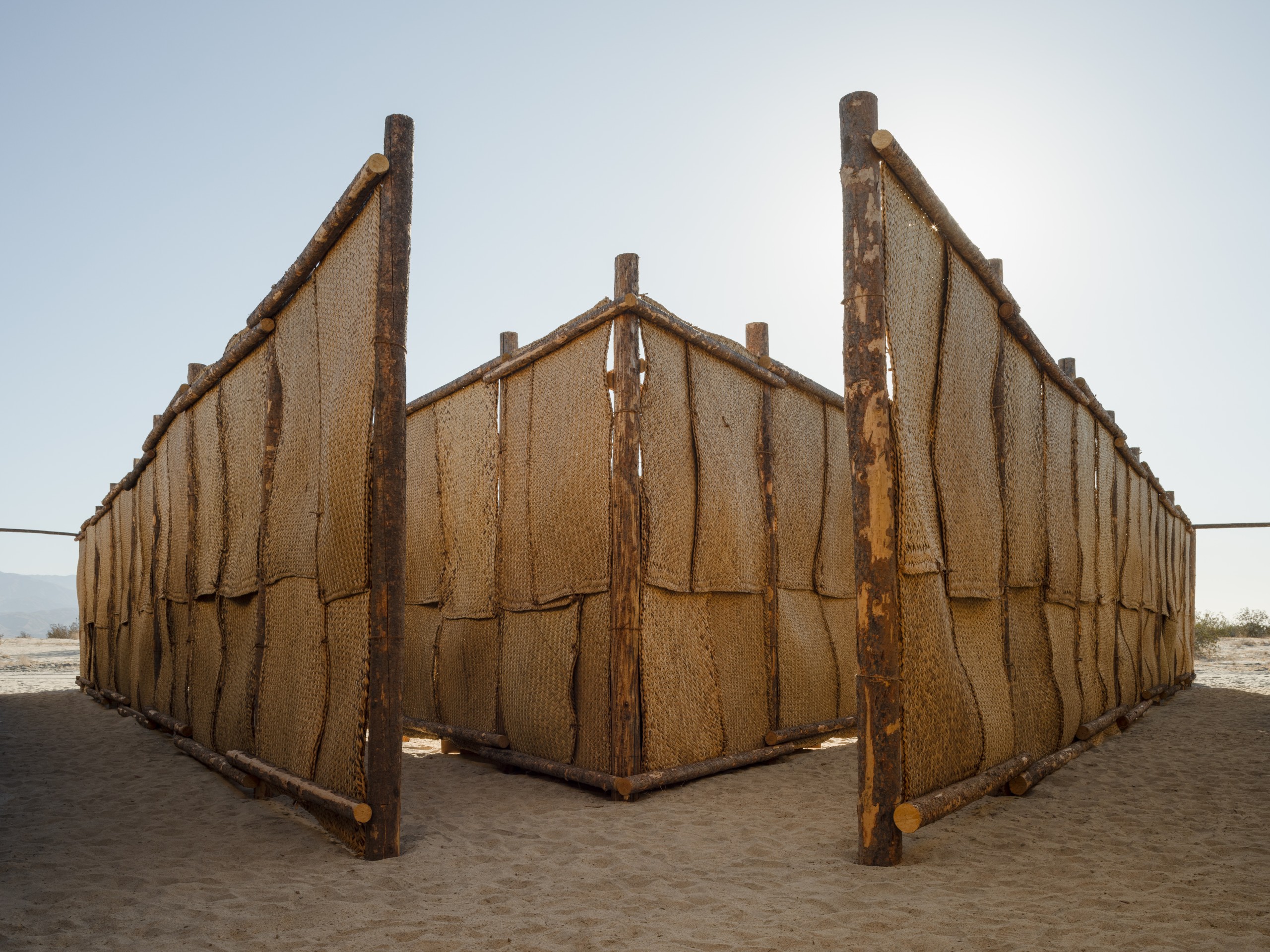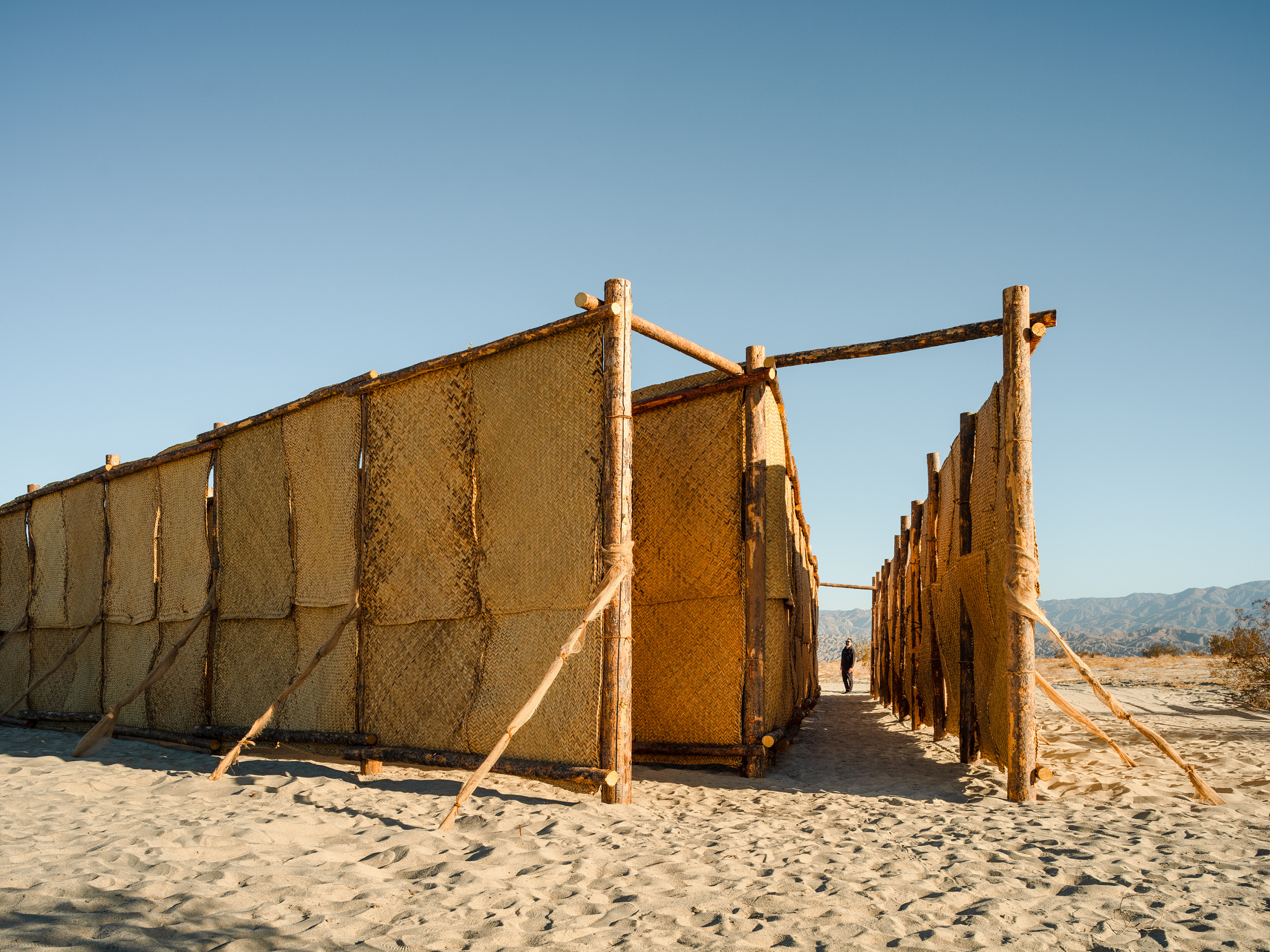 The Passenger es un laberinto en forma de flecha inspirado en el tema de la travesía, que durante generaciones ha estado estrechamente ligado a las historias del desierto. Desde las narrativas bíblicas del éxodo hasta las caminatas de migrantes en busca de un futuro mejor, la necesidad de trasladarse de un lugar a otro ha dado forma a una experiencia compartida entre distintas culturas. Construido por muros de petate — tradicionales tapetes tejidos con fibra de palma — The Passenger habla de los desafíos y aspiraciones que motivan estos viajes y rinde homenaje a las personas que se han embarcado en ellos. Al darle forma a la experiencia de ir a otro sitio, The Passenger hace un reconocimiento a las muchas personas que han pasado por el Valle de Coachella, mientras permite a lxs visitantes contemplar su propia travesía al cruzar el laberinto.