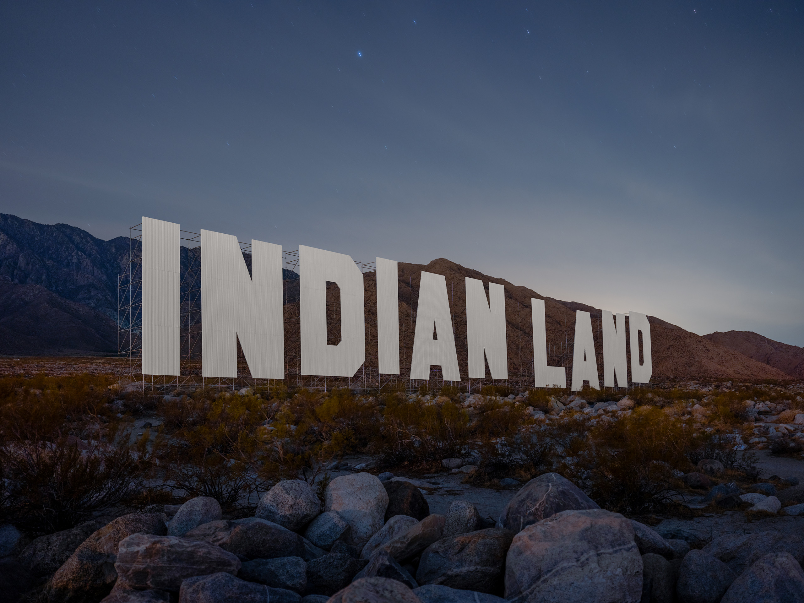 Para Nicholas Galanin, artista y músico Tlingit y Unanga, memoria y tierra están inevitablemente entrelazadas. Never Forget son letras de 45 pies de altura que hacen referencia al letrero de Hollywood, antes HOLLYWOODLAND, erigido para promover un desarrollo exclusivo para blancos. Su momento coincidió con un desarrollo en Palm Springs que también se conectó con la industria del cine: los contratos de actores limitaban su movilidad, contribuyendo al ascenso de la ciudad como espacio recreativo y refugio de estrellas. Mientras la mitología de los colonos blancos de América como la tierra de la libertad, el hogar de los valientes, se promovía en Occidente, el paisaje se cinematizó con el mismo objetivo. Never Forget pide a los terratenientes descendientes de colonos que participen transfiriendo títulos de propiedad y administración de tierras a las comunidades indígenas locales. Este trabajo es un llamado a la acción y un recordatorio de que los reconocimientos de tierras se vuelven performativos cuando no apoyan explícitamente el movimiento de devolución del territorio. No sólo genera una onda expansiva de corrección histórica, sino que también promete hacerlo a nivel global a través de las redes sociales.
