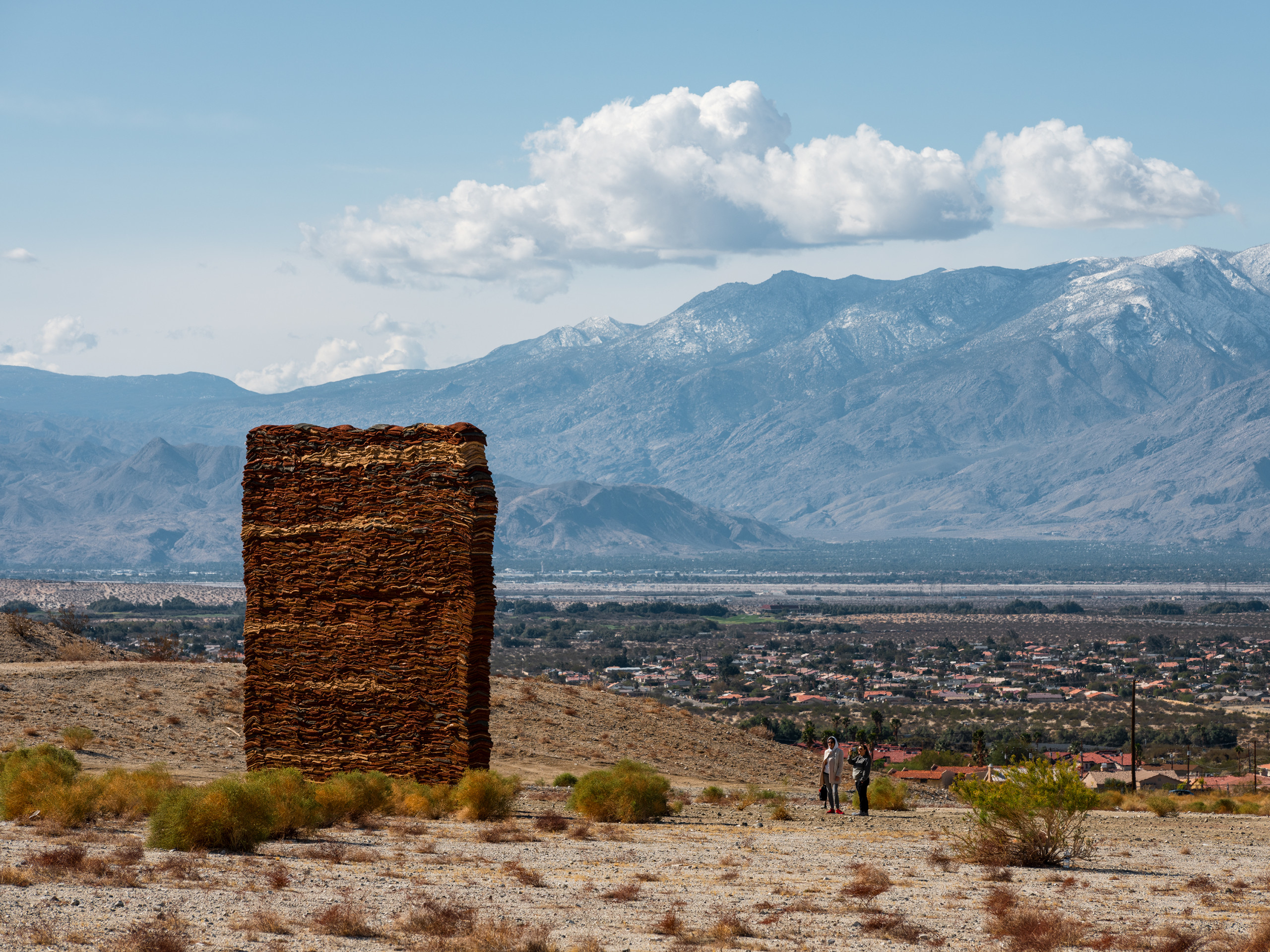 Para Zahrah Alghamdi, el material y la memoria están estrechamente entrelazados. Muchas de sus obras condensan grandes cúmulos de material cual si fuesen estratos superpuestos de historias y culturas de los sitios de donde provienen. Alghamdi creció en Al Bahah, en la región suroeste de Arabia Saudita, y cuando visitó Palm Springs quedó impresionada por la conexión entre los paisajes y las arquitecturas del desierto. Para Desert X, creó una escultura que sintetiza y hace eco a las formas de construcción tradicionales de su país con la organización arquitectónica que encontró en el Valle de Coachella. El resultado toma la forma de un muro monolítico compuesto por elementos apilados, impregnados de cemento, tierra y tinturas específicas de los procesos de edificación de cada región; expresando un lenguaje sumamente personal que atañe a sentimientos, emociones y recuerdos asociados a un lugar y a un tiempo.