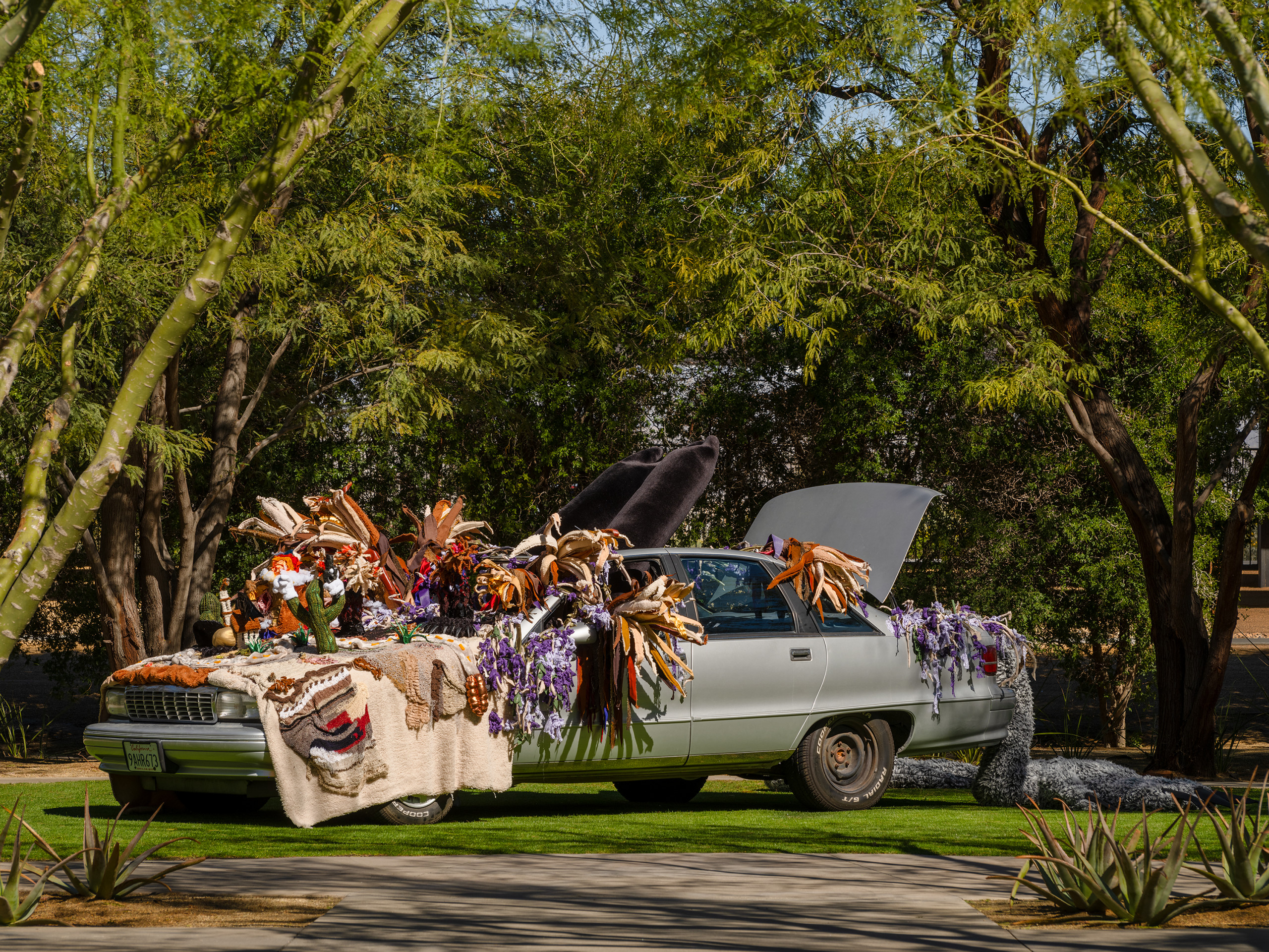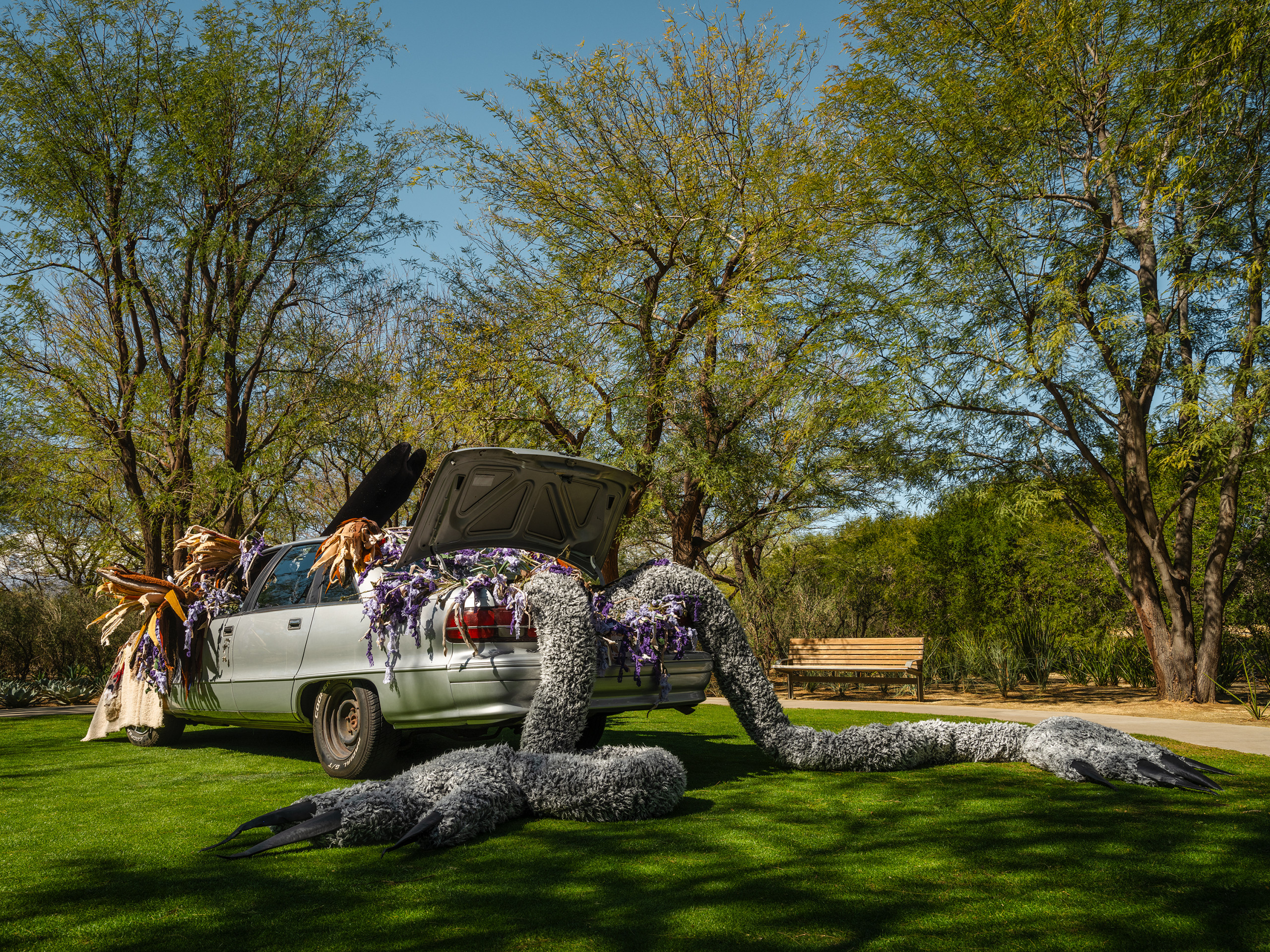 Los visitantes encuentran un automóvil anticuado que se detuvo abruptamente en Sunnylands. Una absurda serie de extremidades enredadas de dos personajes misteriosos que usan sombreros altos se extiende fuera del automóvil y sobre los terrenos impecablemente cuidados del sitio. Manos largas y afelpadas armadas con blandas pistolas cuelgan de las ventanas, apenas camufladas por una maleza artificial que invade la escultura. Estos extraños personajes acompañan al espectador en una caricatura donde el western se encuentra con la ciencia ficción de un tour audiovisual por el paisaje, como un recorrido ficticio por un mundo exterior aparentemente familiar, guiado por extraterrestres y fantasmas.